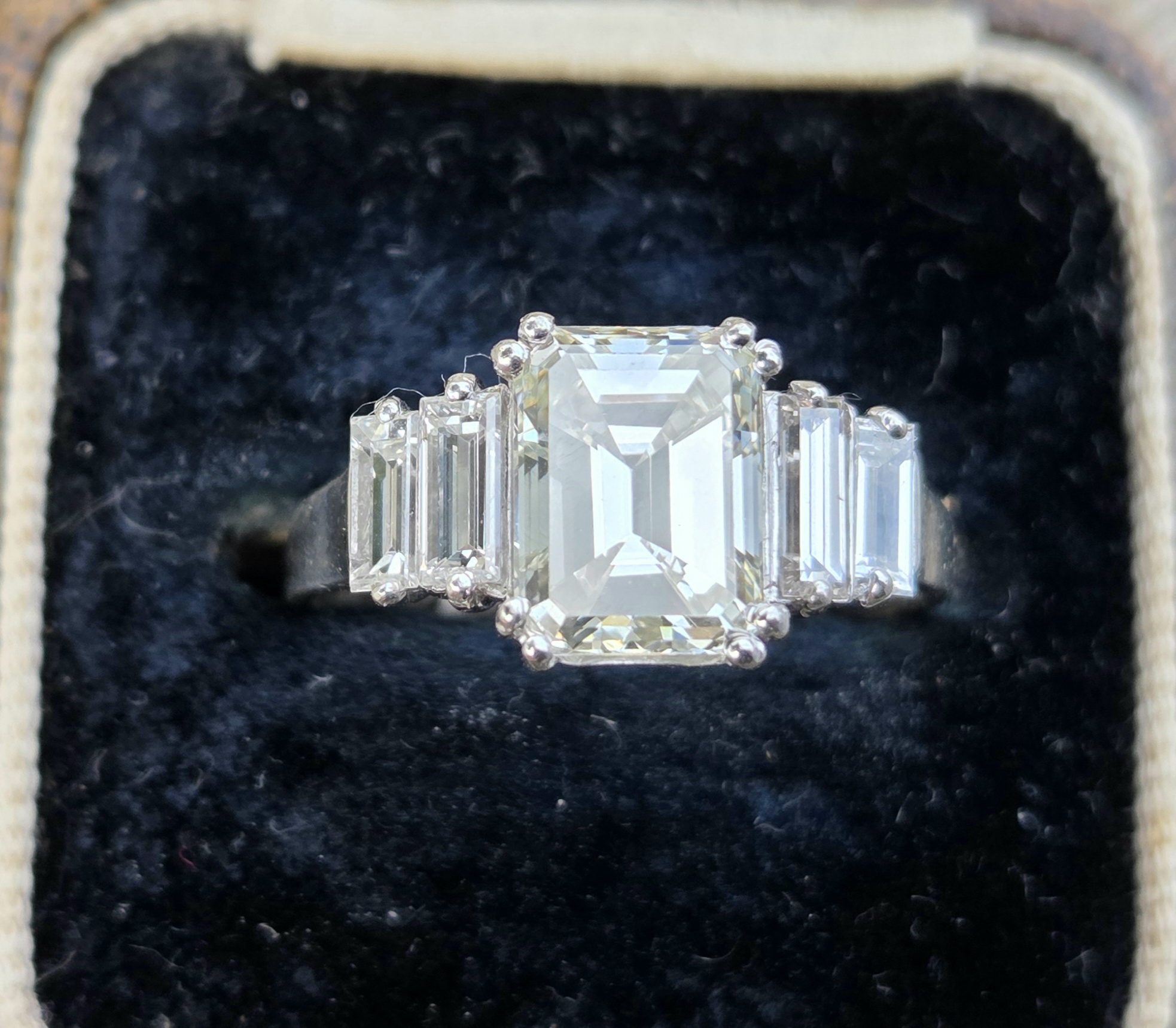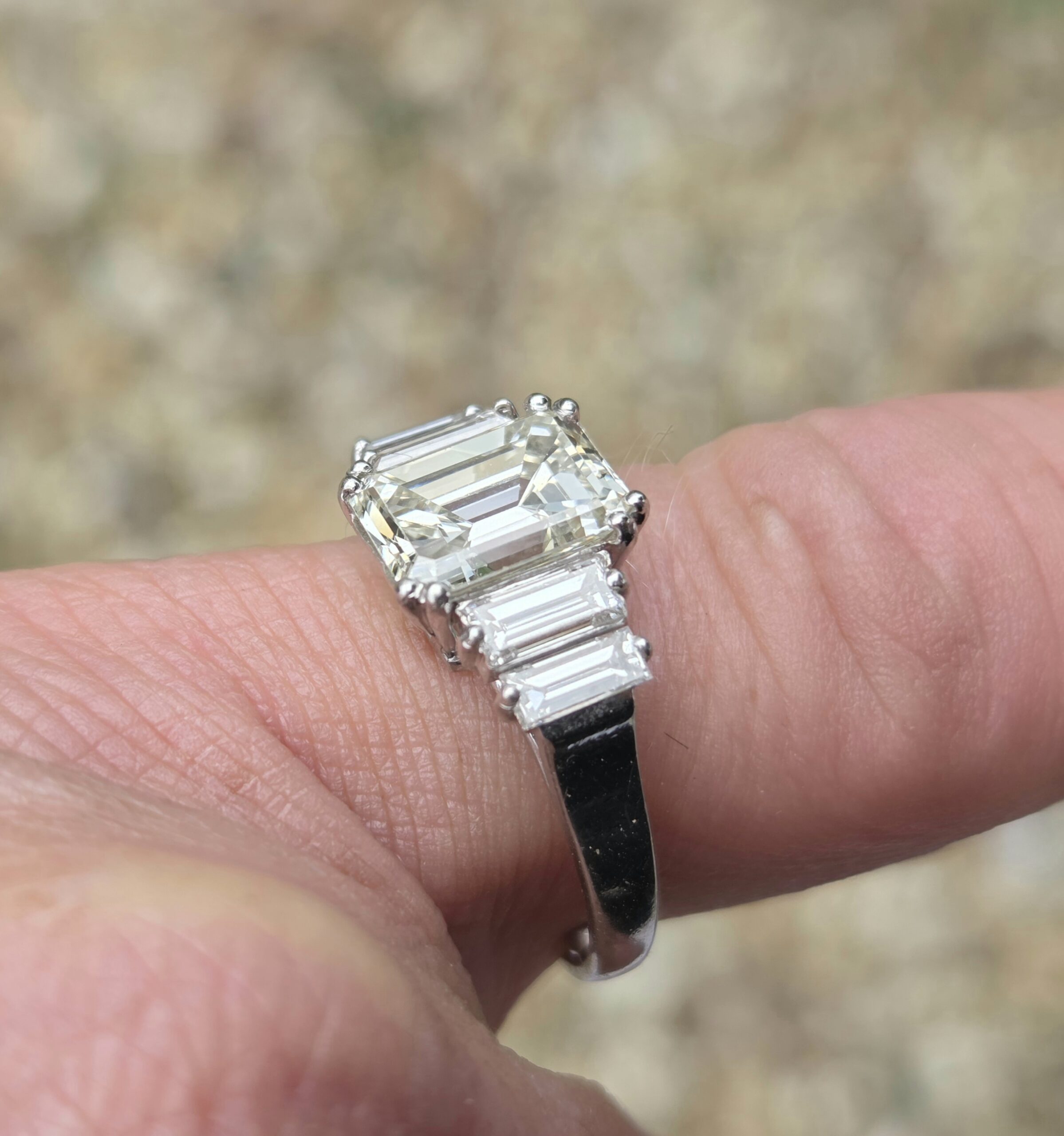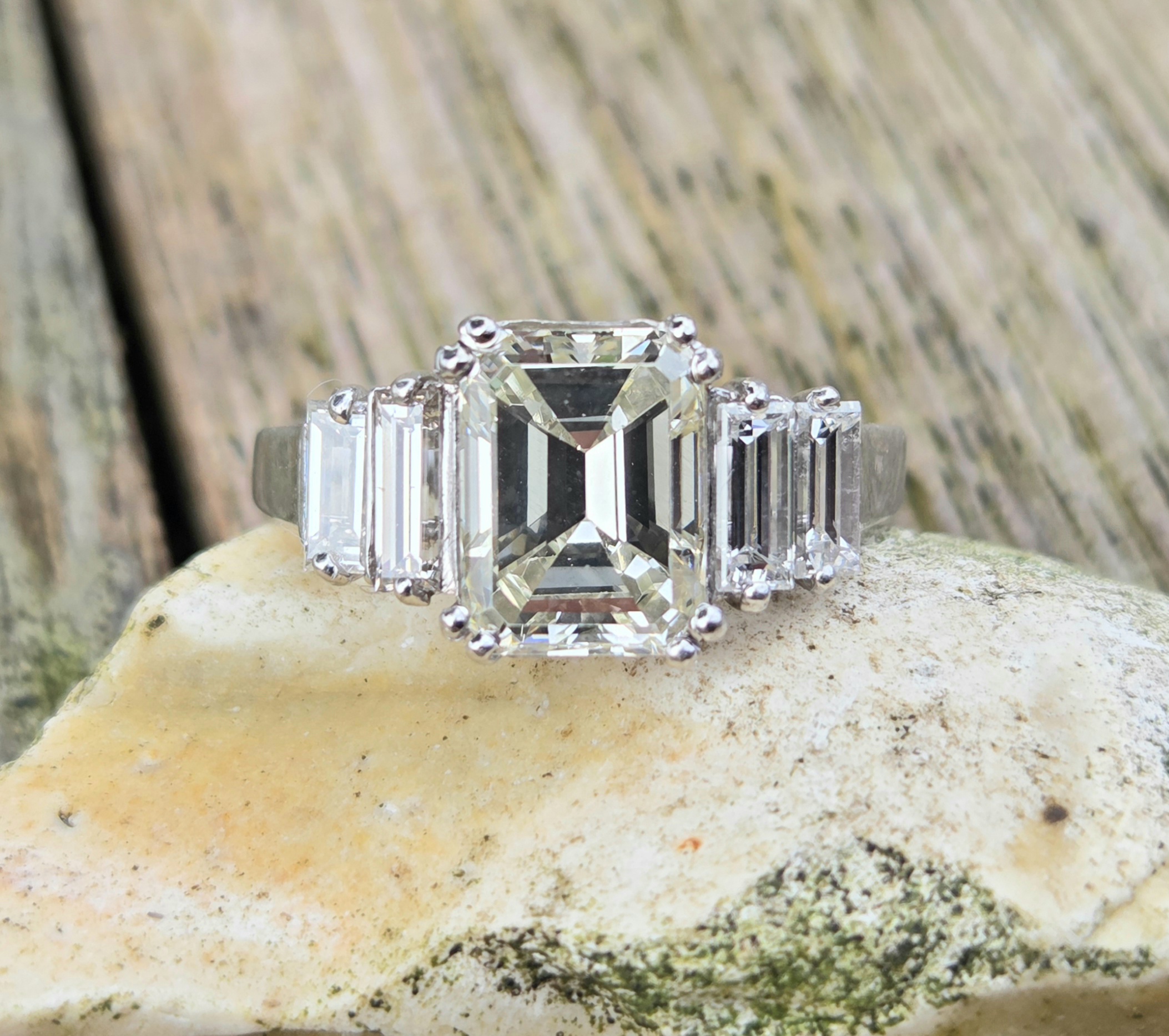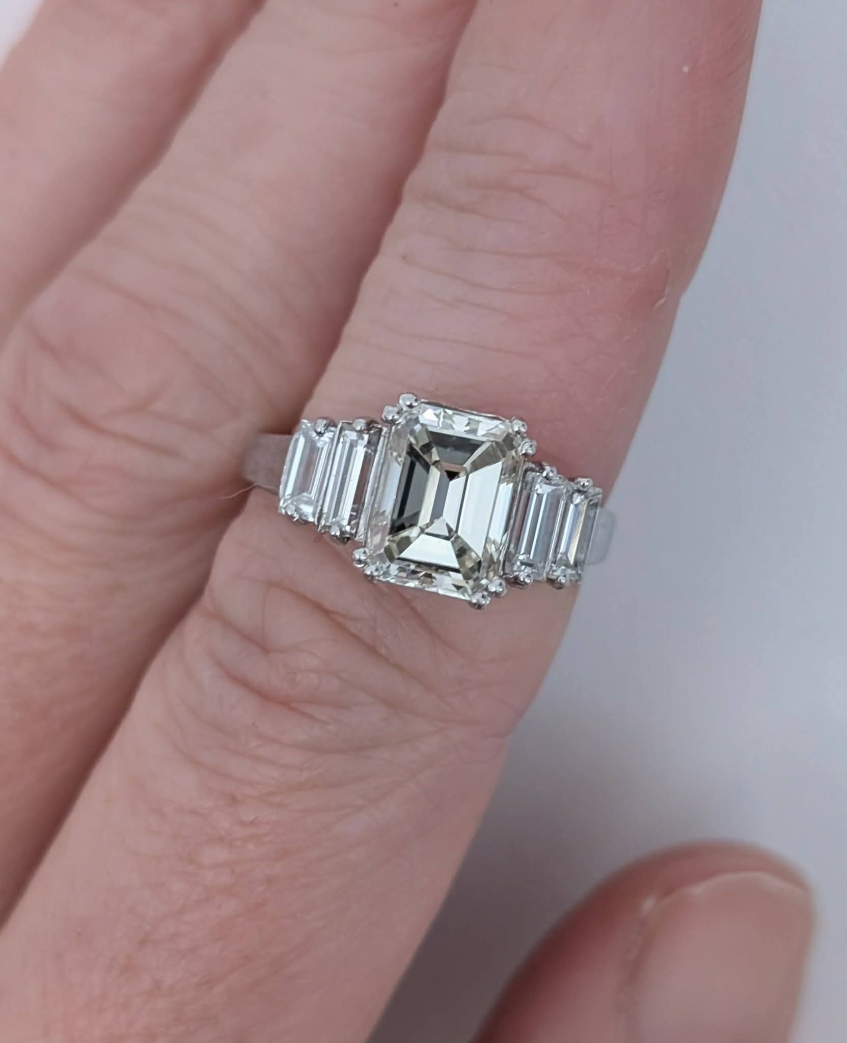Gorgeous Vintage Emerald cut Diamond with baguette shoulders. Platinum set.