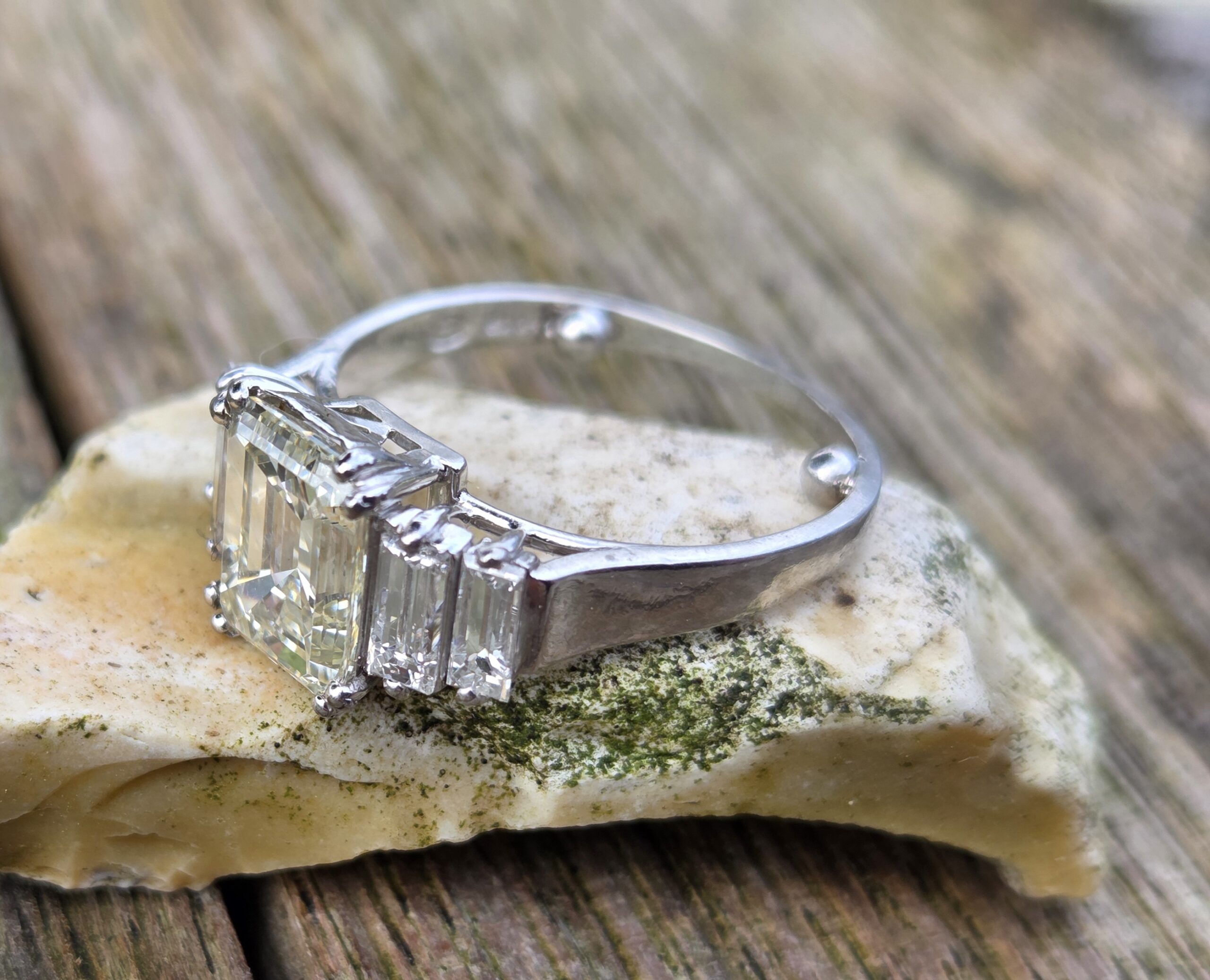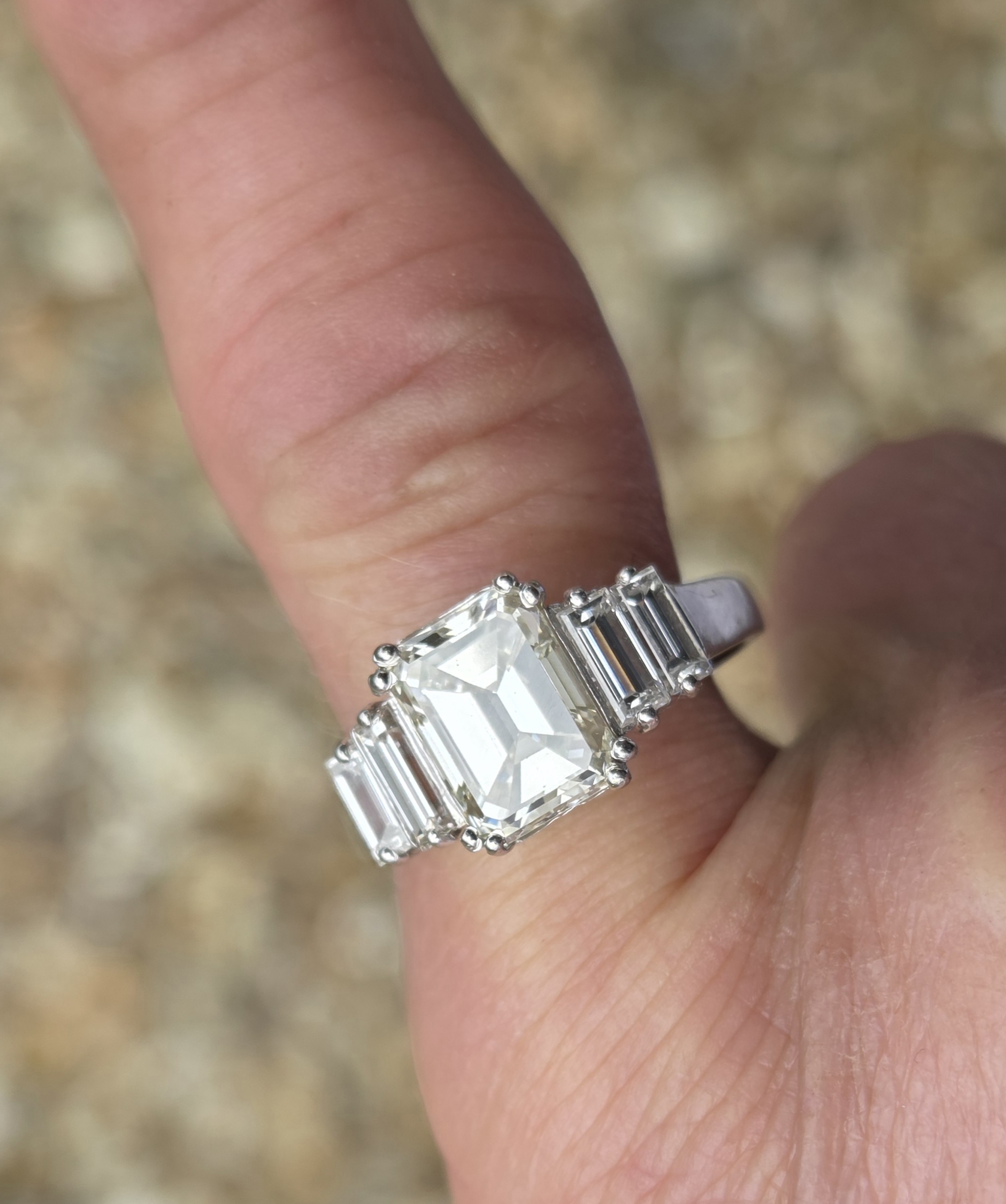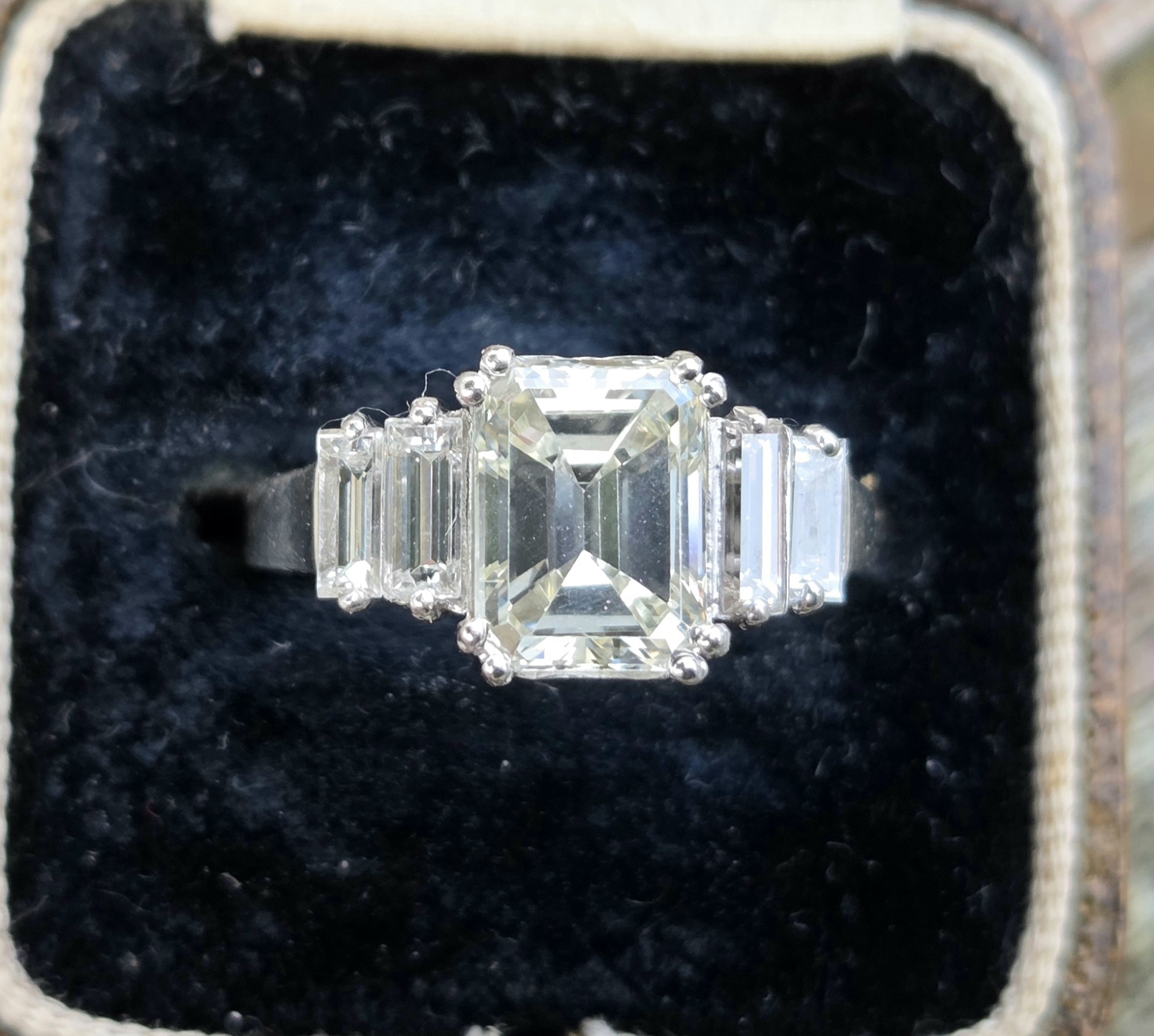 Gorgeous Vintage Emerald cut Diamond with baguette shoulders. Platinum set.