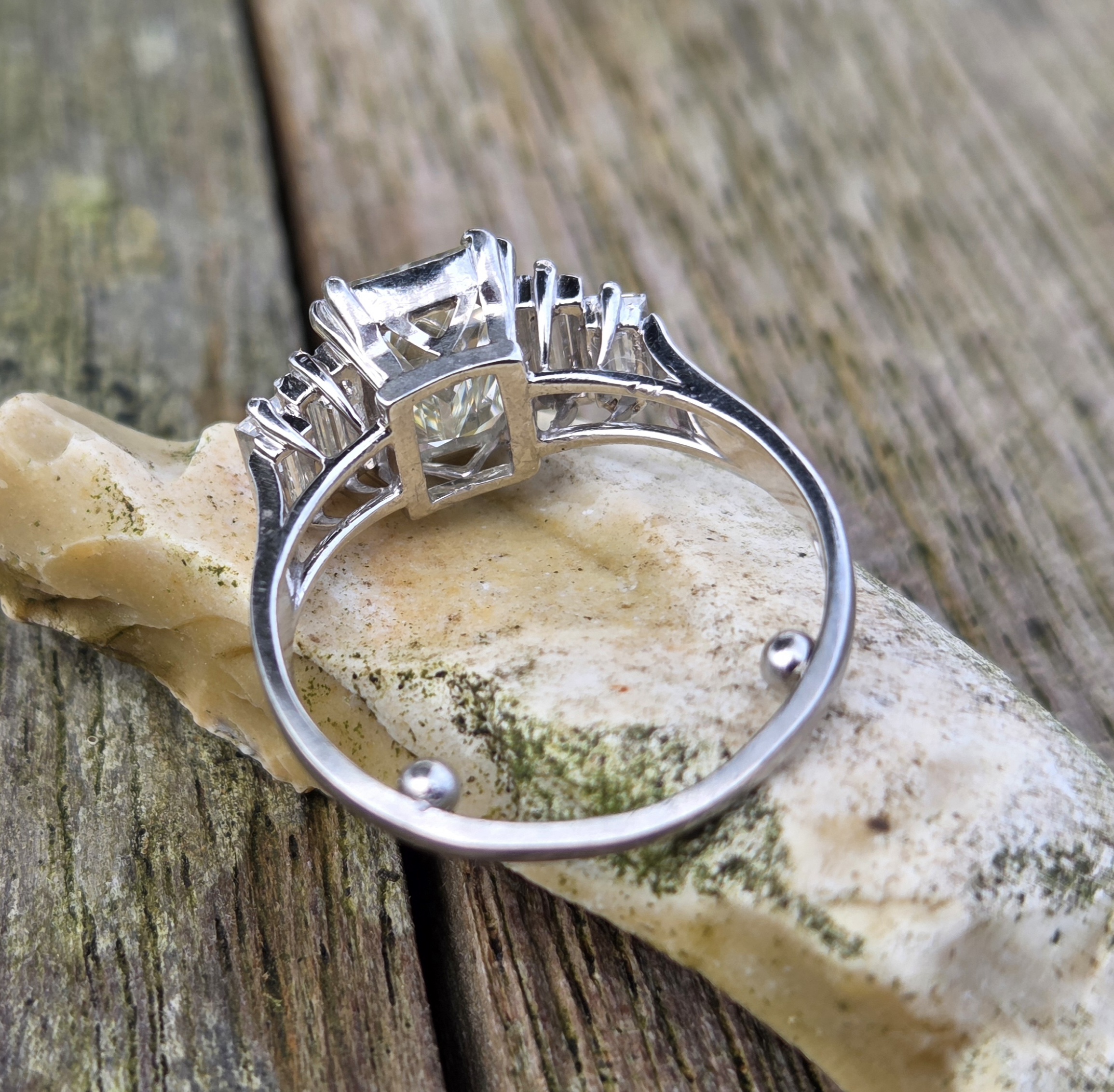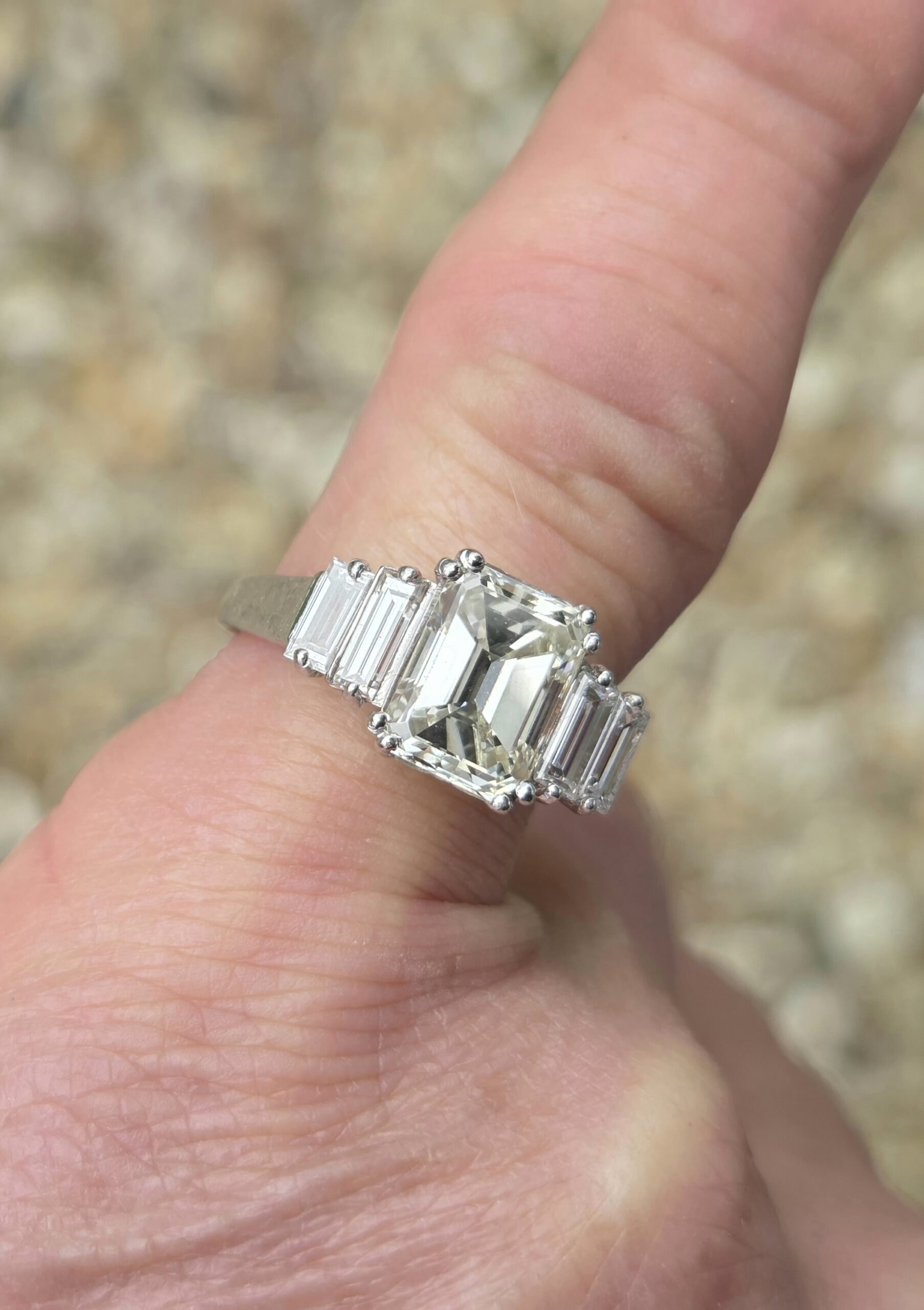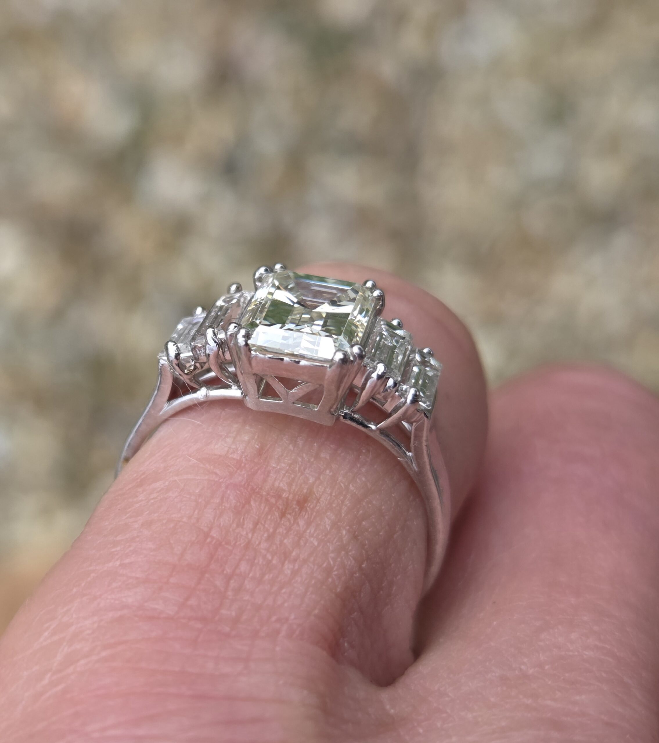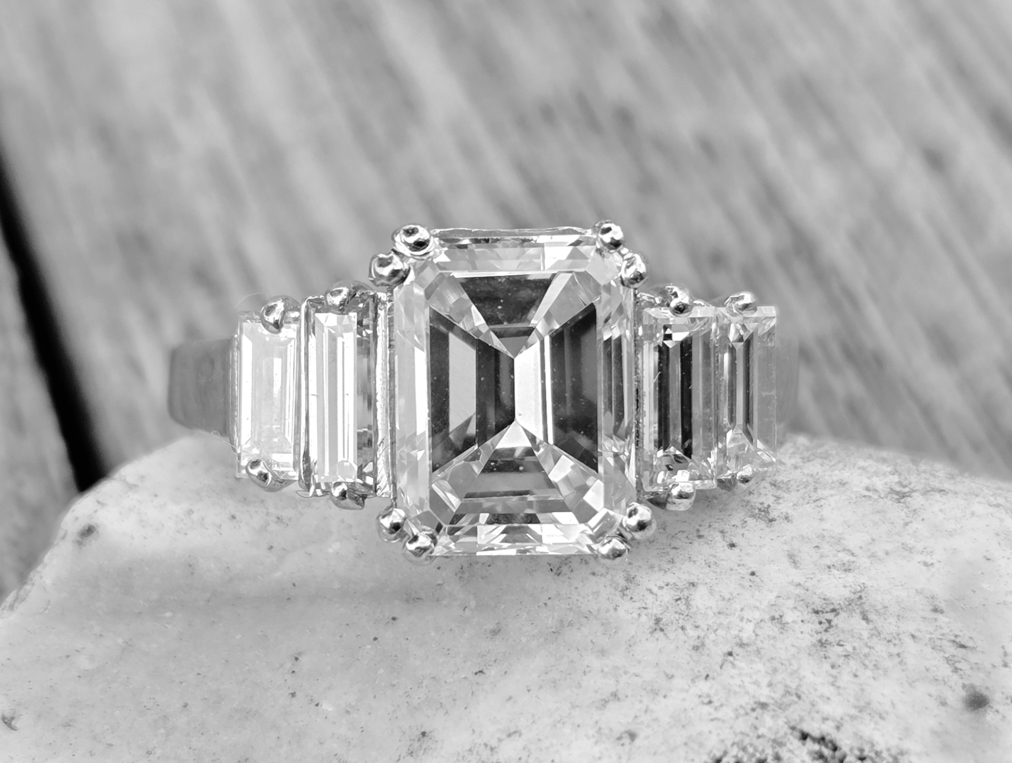 Gorgeous Vintage Emerald cut Diamond with baguette shoulders. Platinum set.