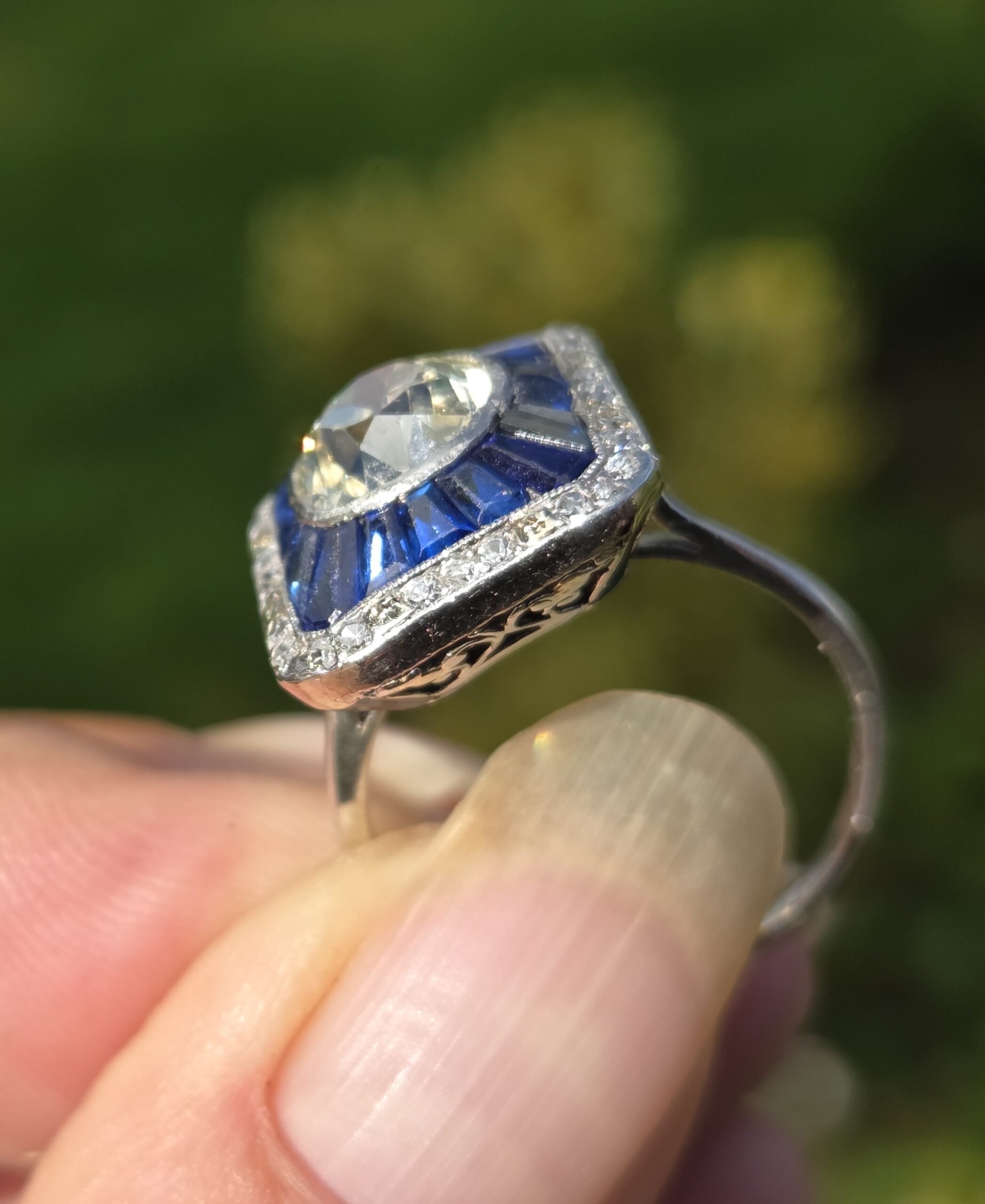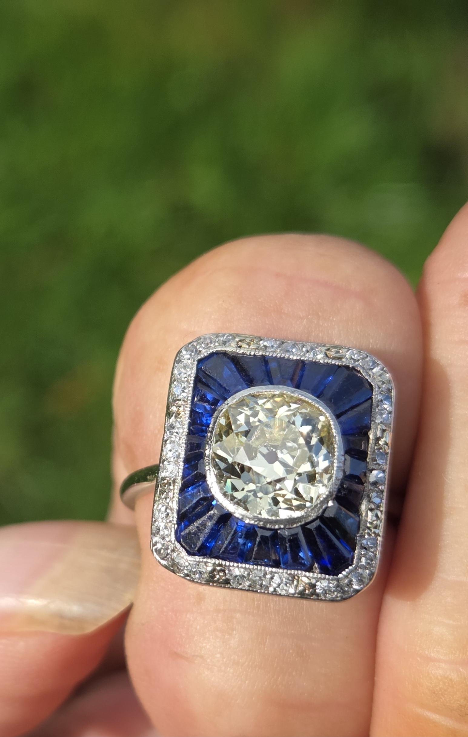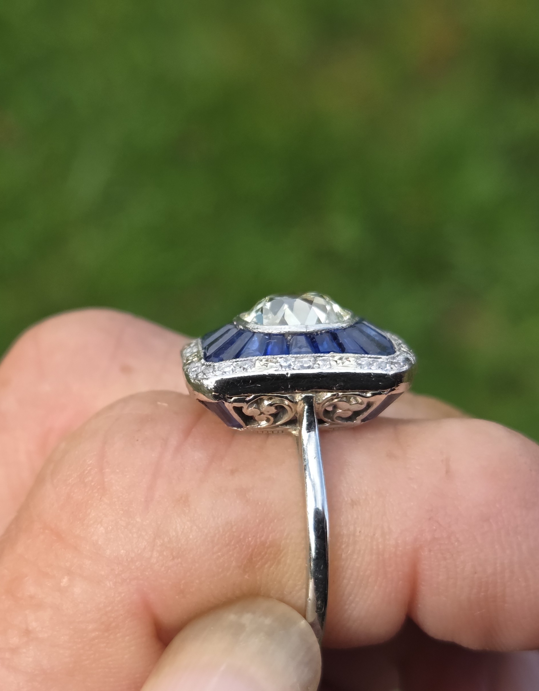 Surrounded by calibre cut sapphires and rim of smaller old cuts.