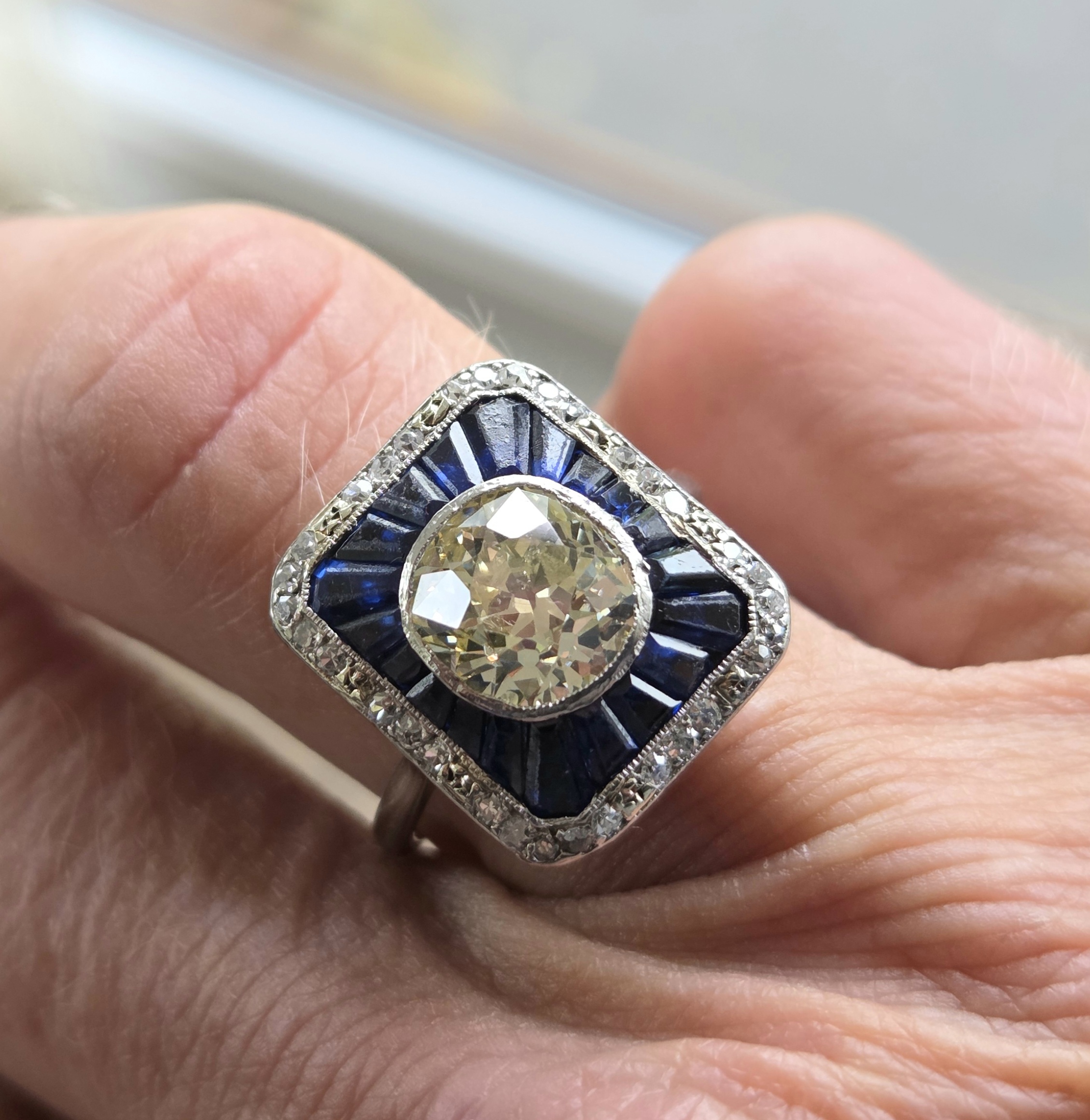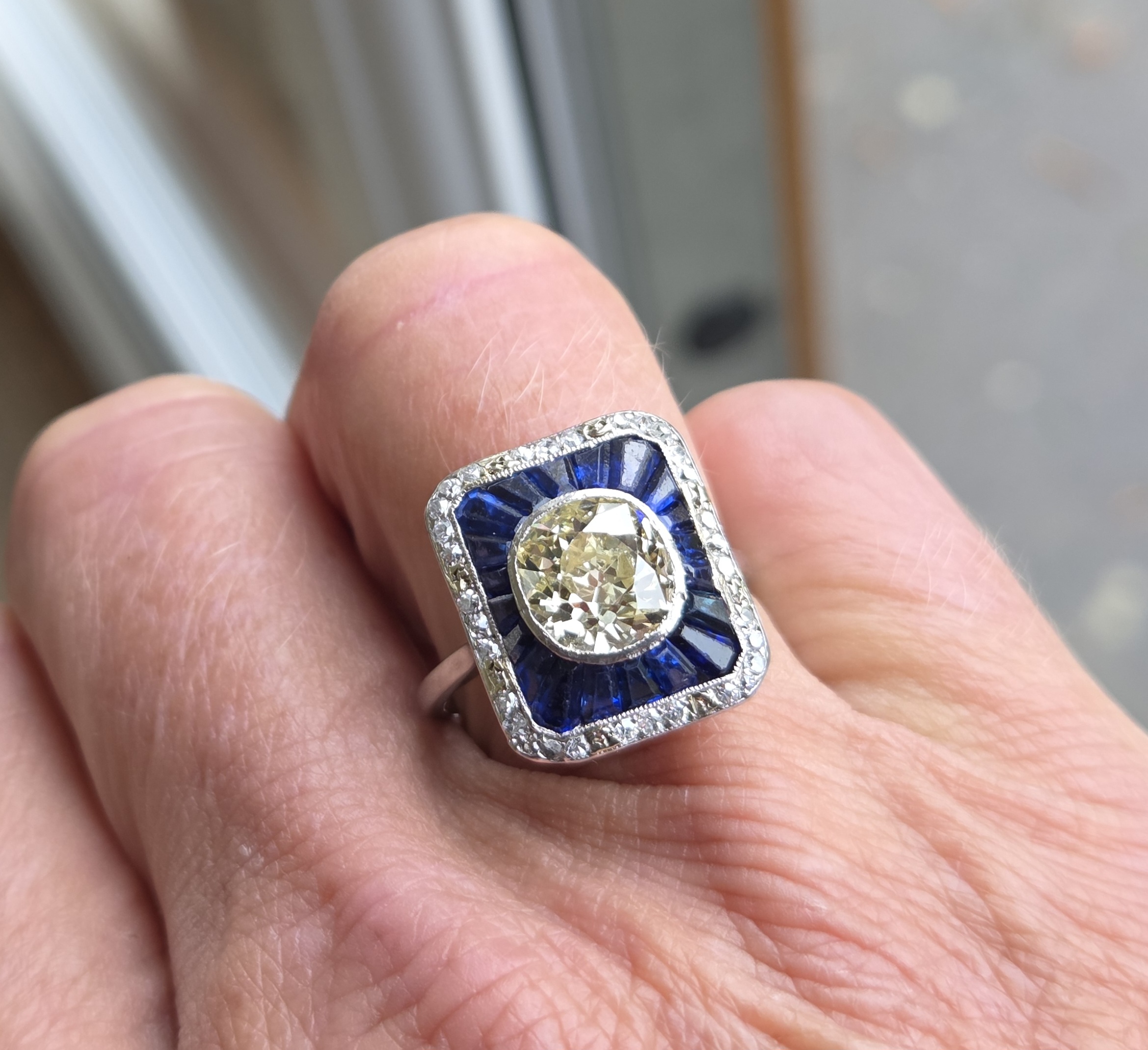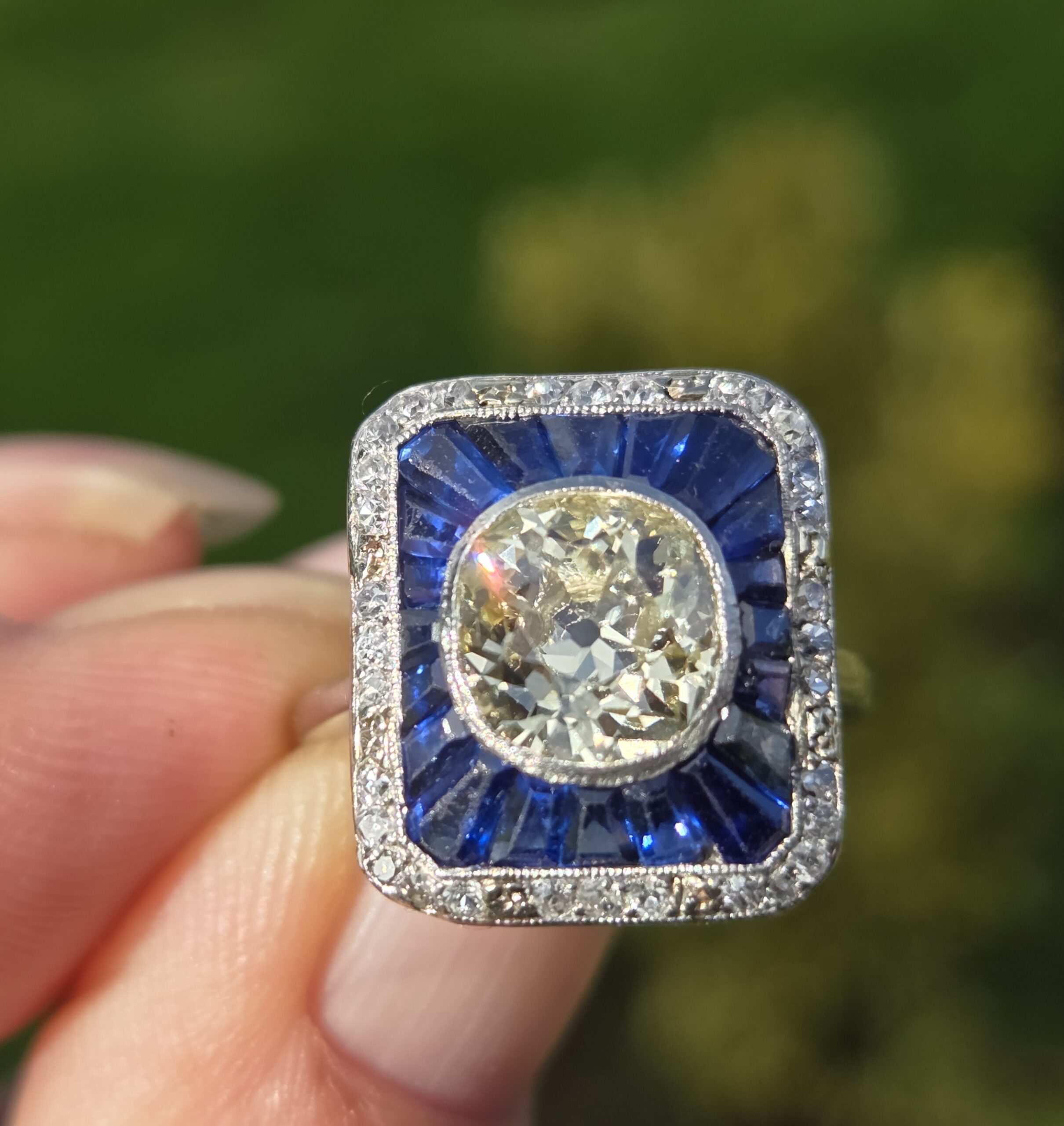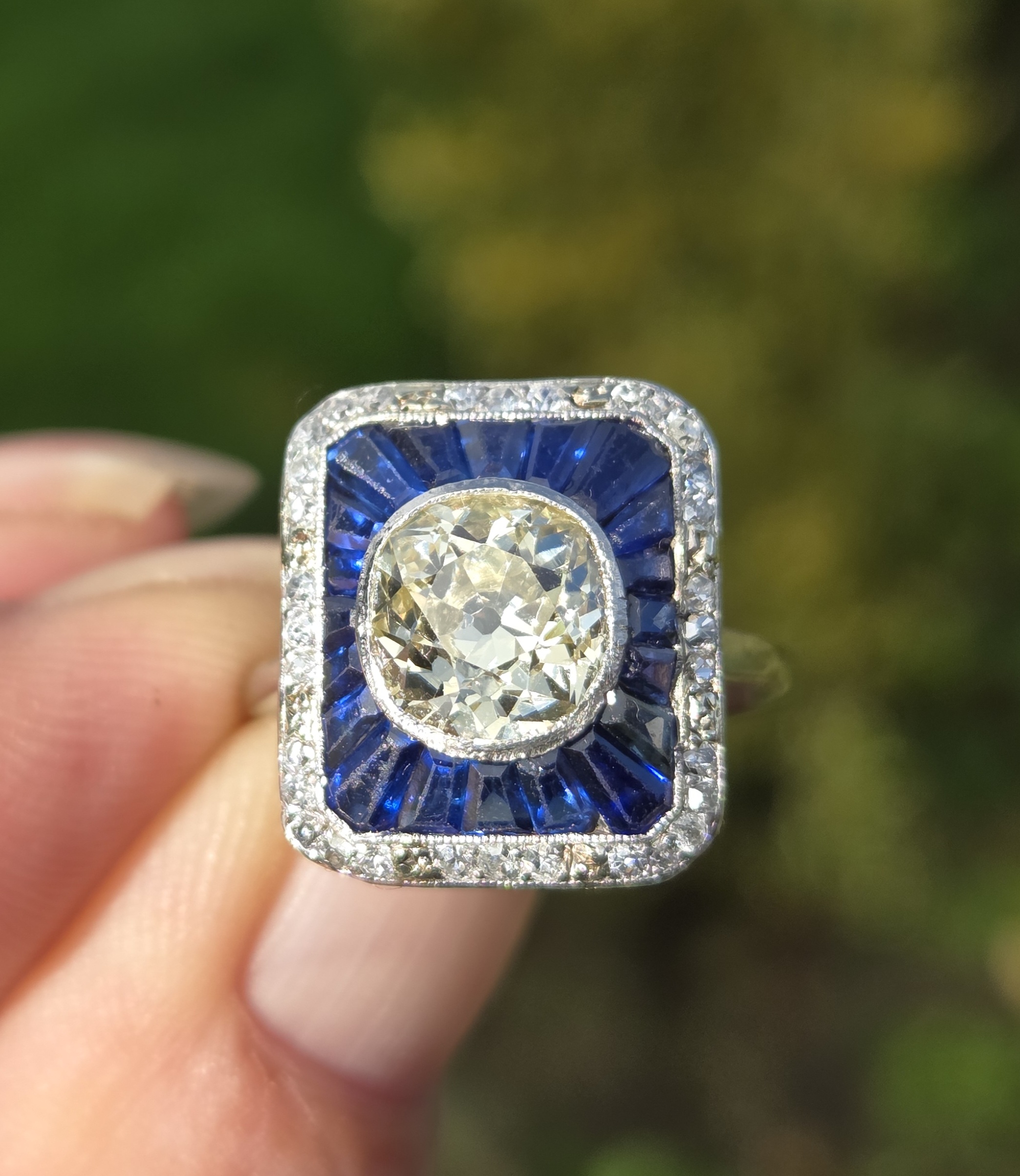 Surrounded by calibre cut sapphires and rim of smaller old cuts.