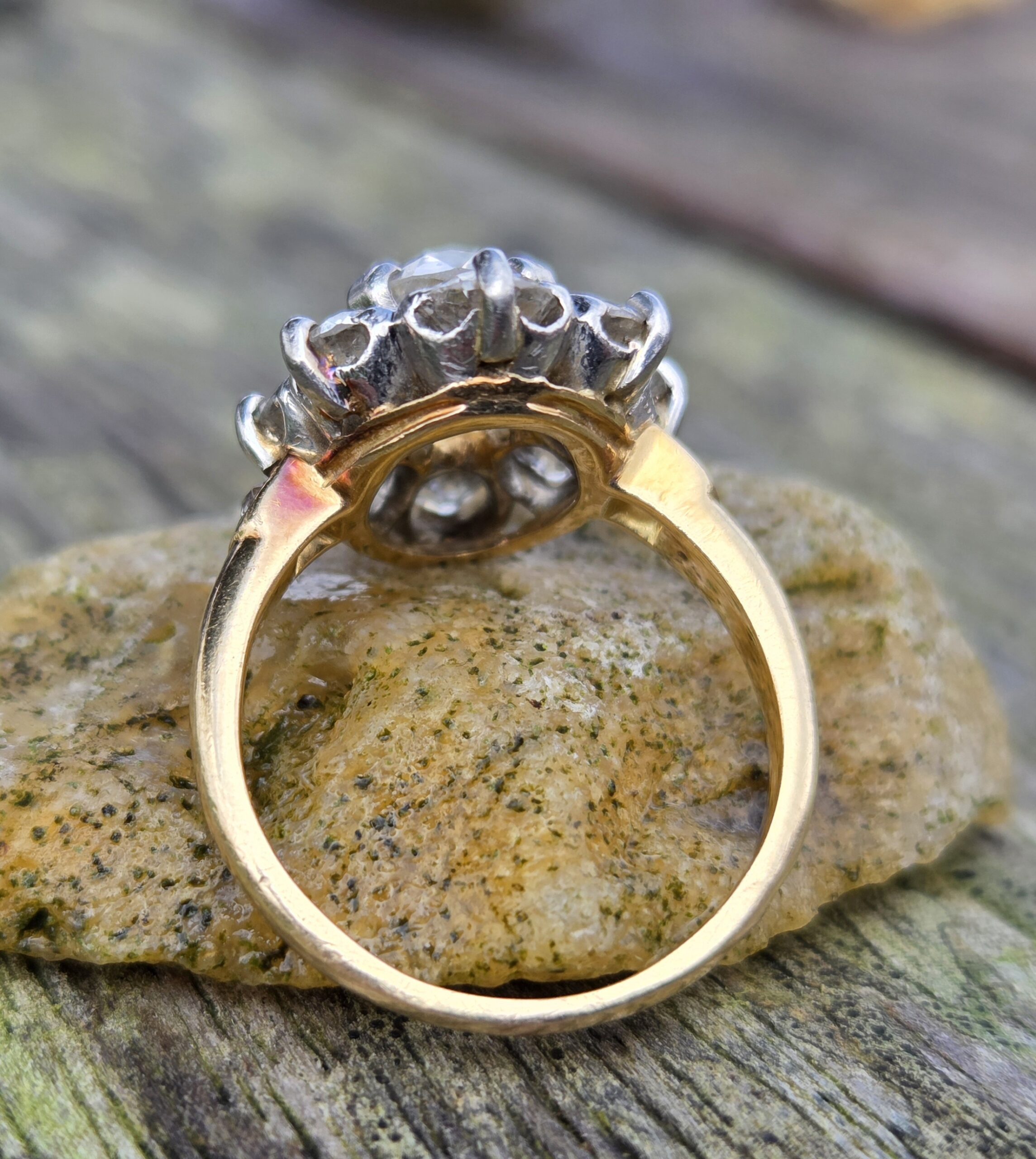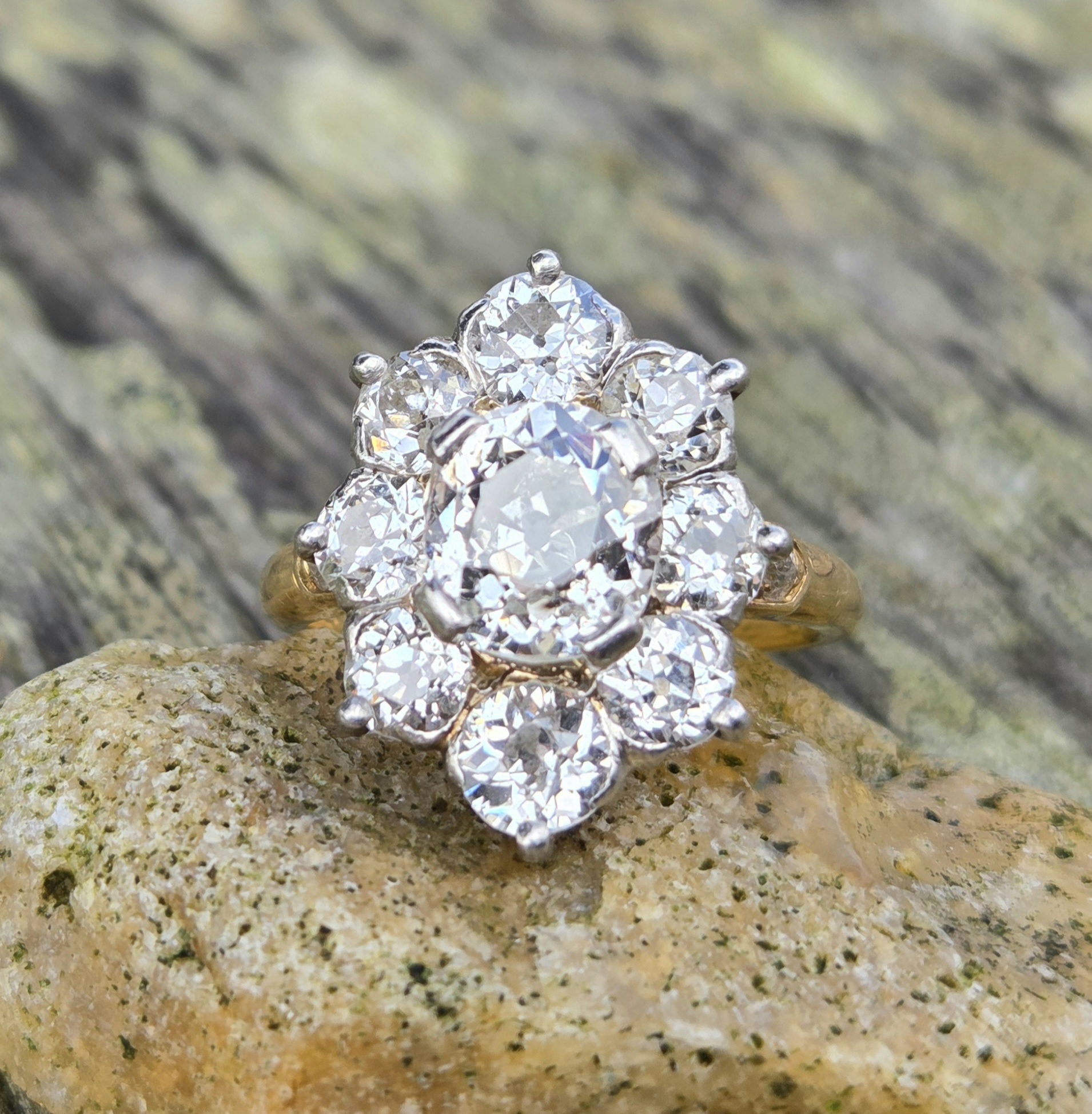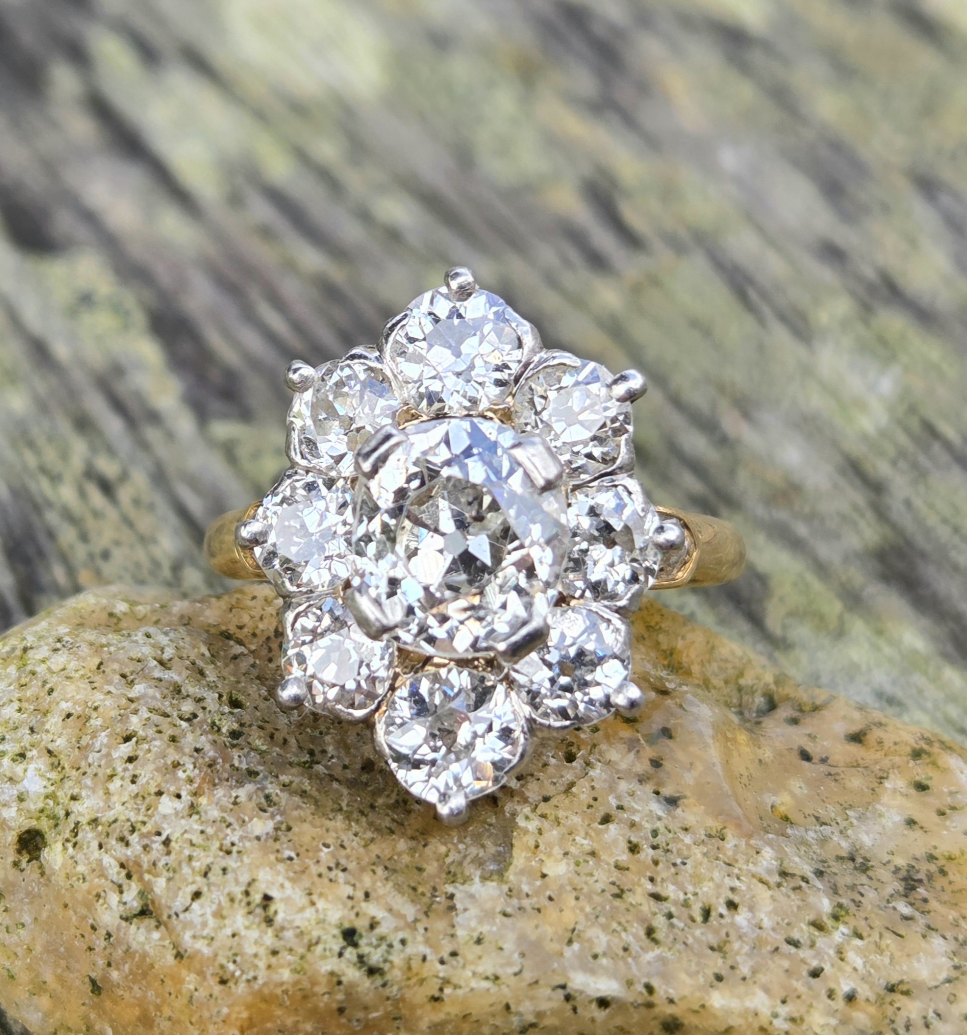 A glorious Old Mine cut is set to the centre, measuring 7.5mm x 6.8mm by 5.35mm depth, calculates to 1.80ct. SI I/J colour in my opinion.