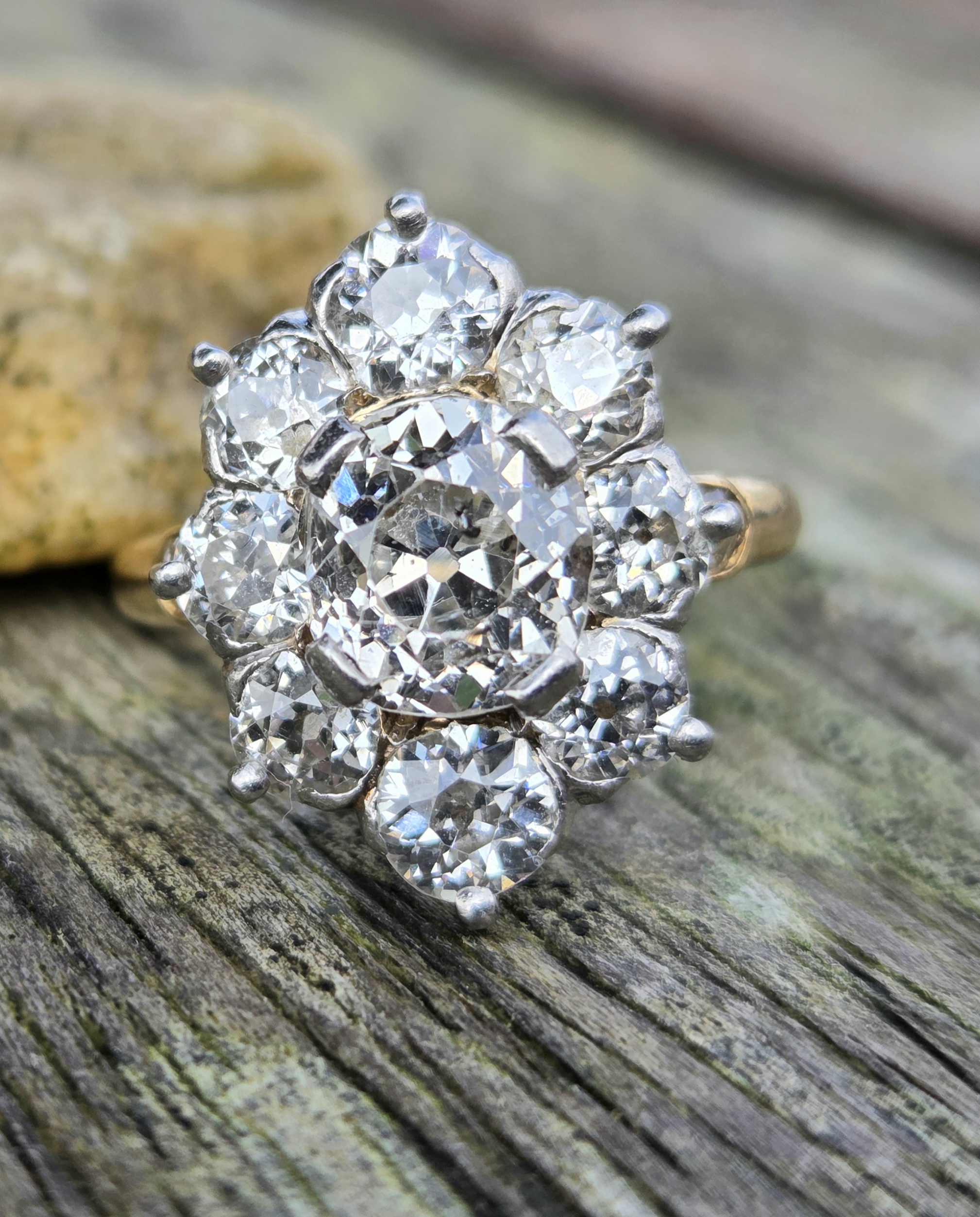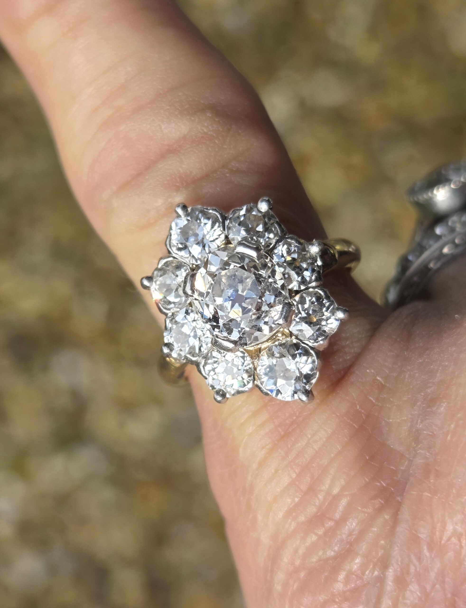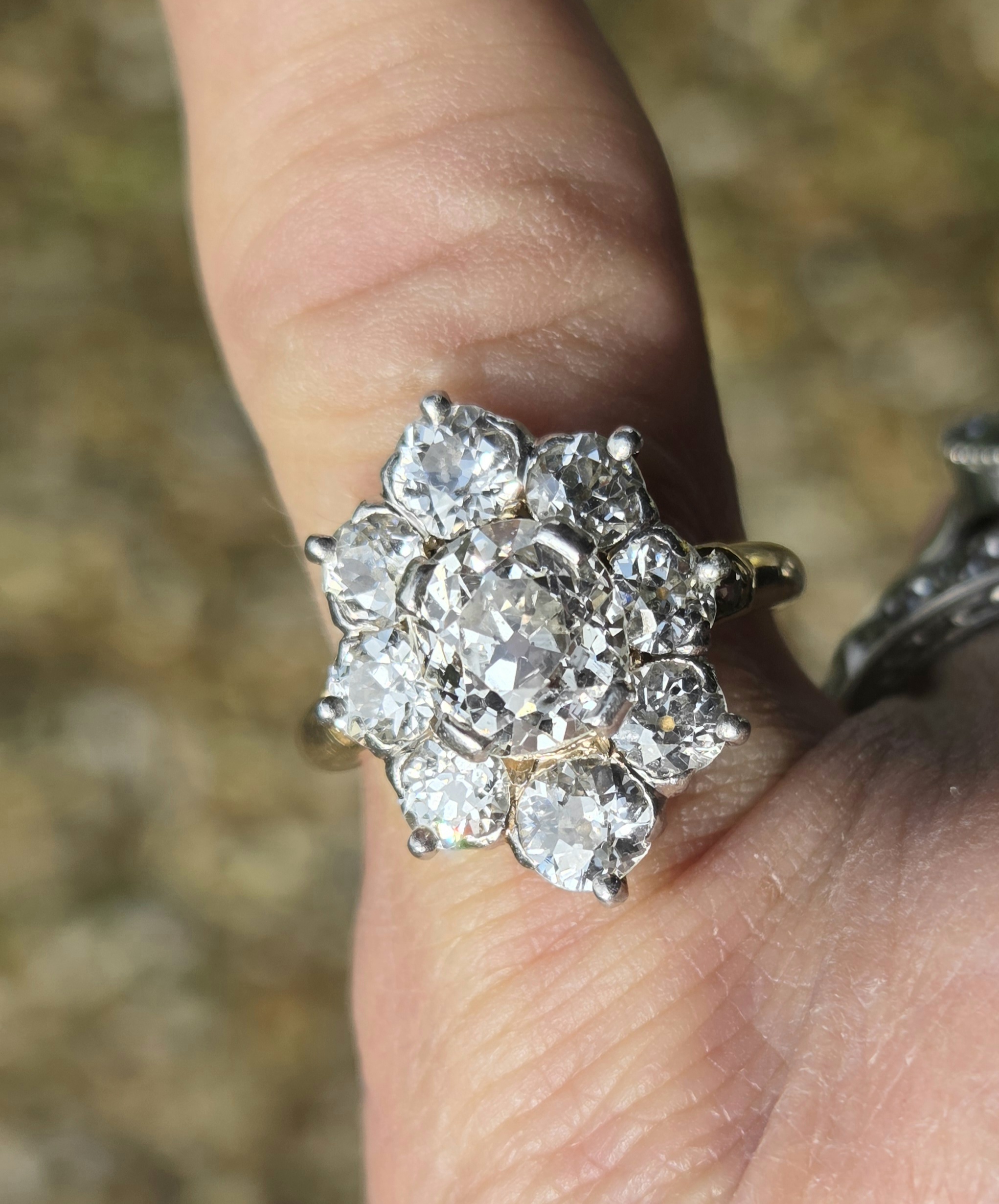 A glorious Old Mine cut is set to the centre, measuring 7.5mm x 6.8mm by 5.35mm depth, calculates to 1.80ct. SI I/J colour in my opinion.