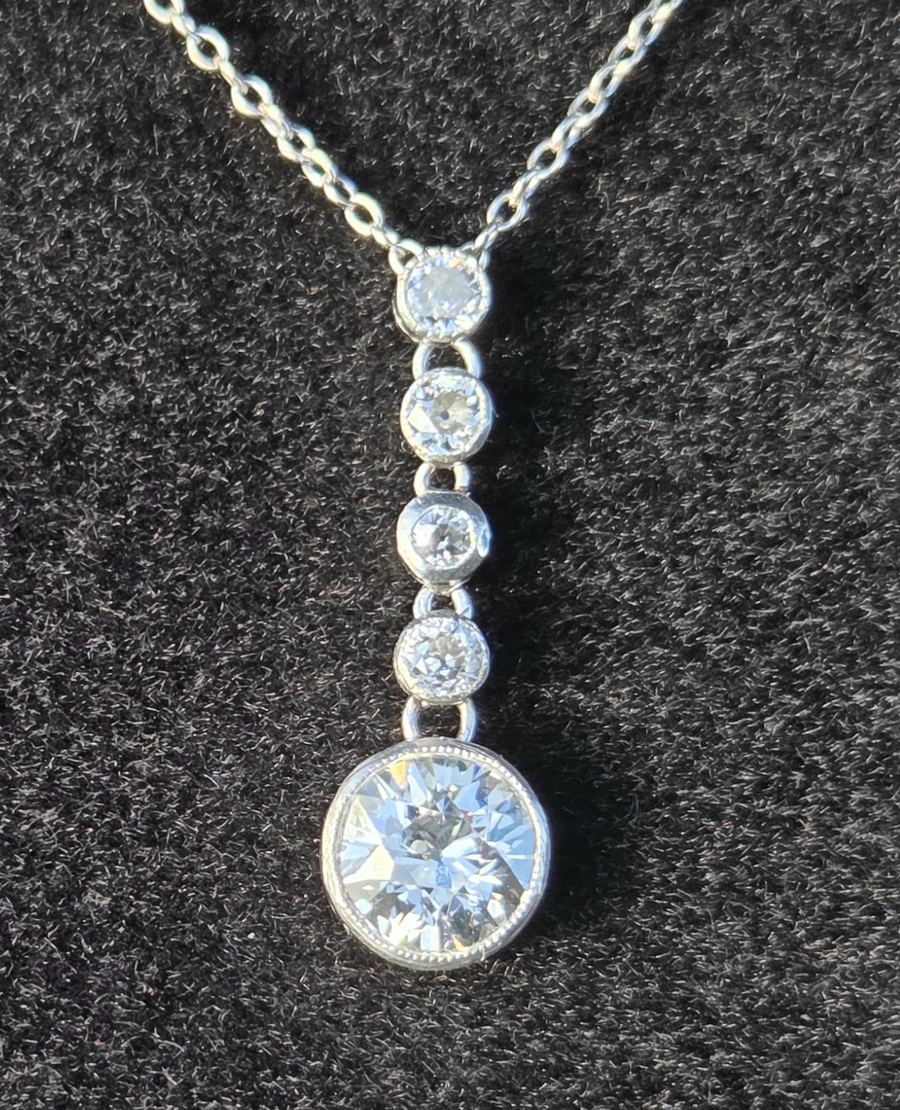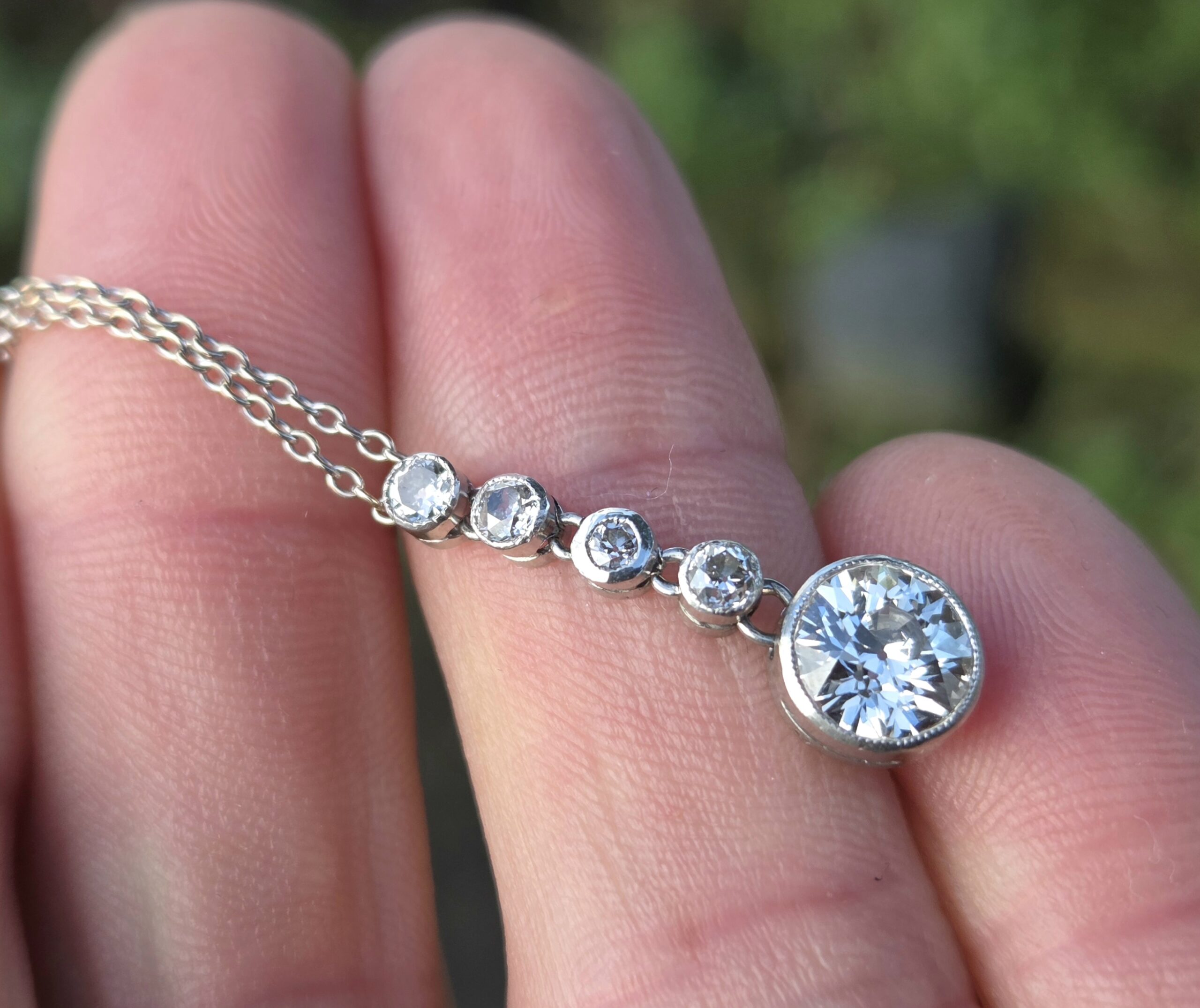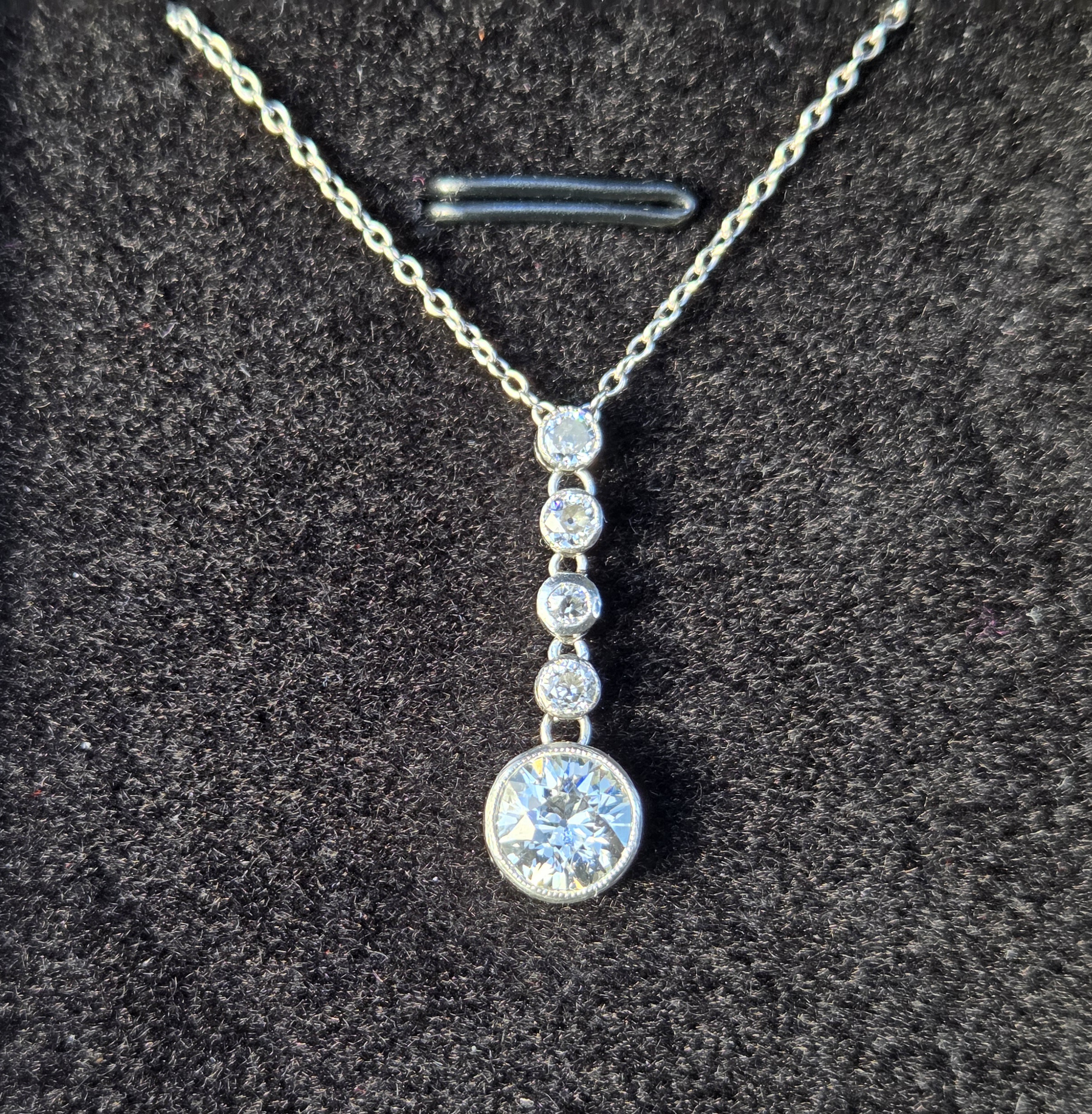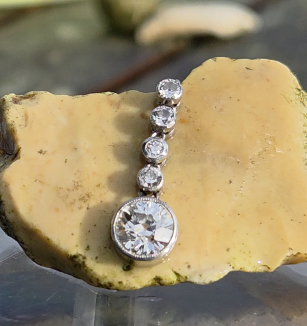 The most incredibly white Old European cut suspended from 4 smaller old cuts.