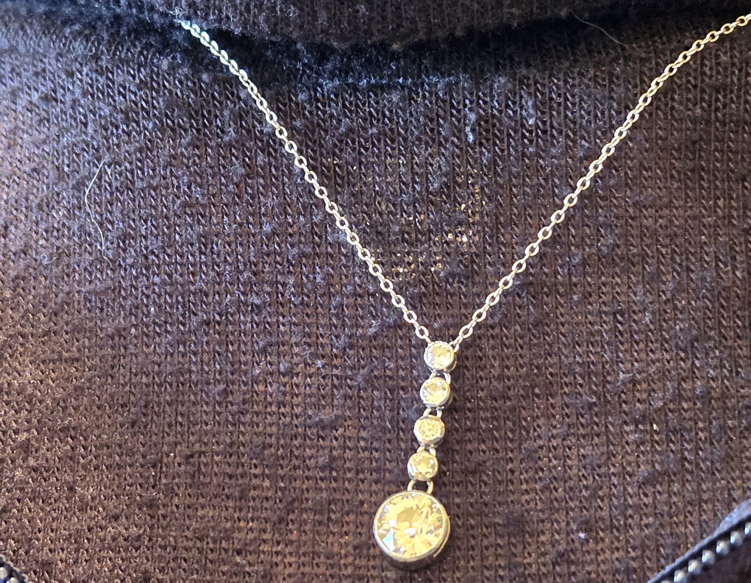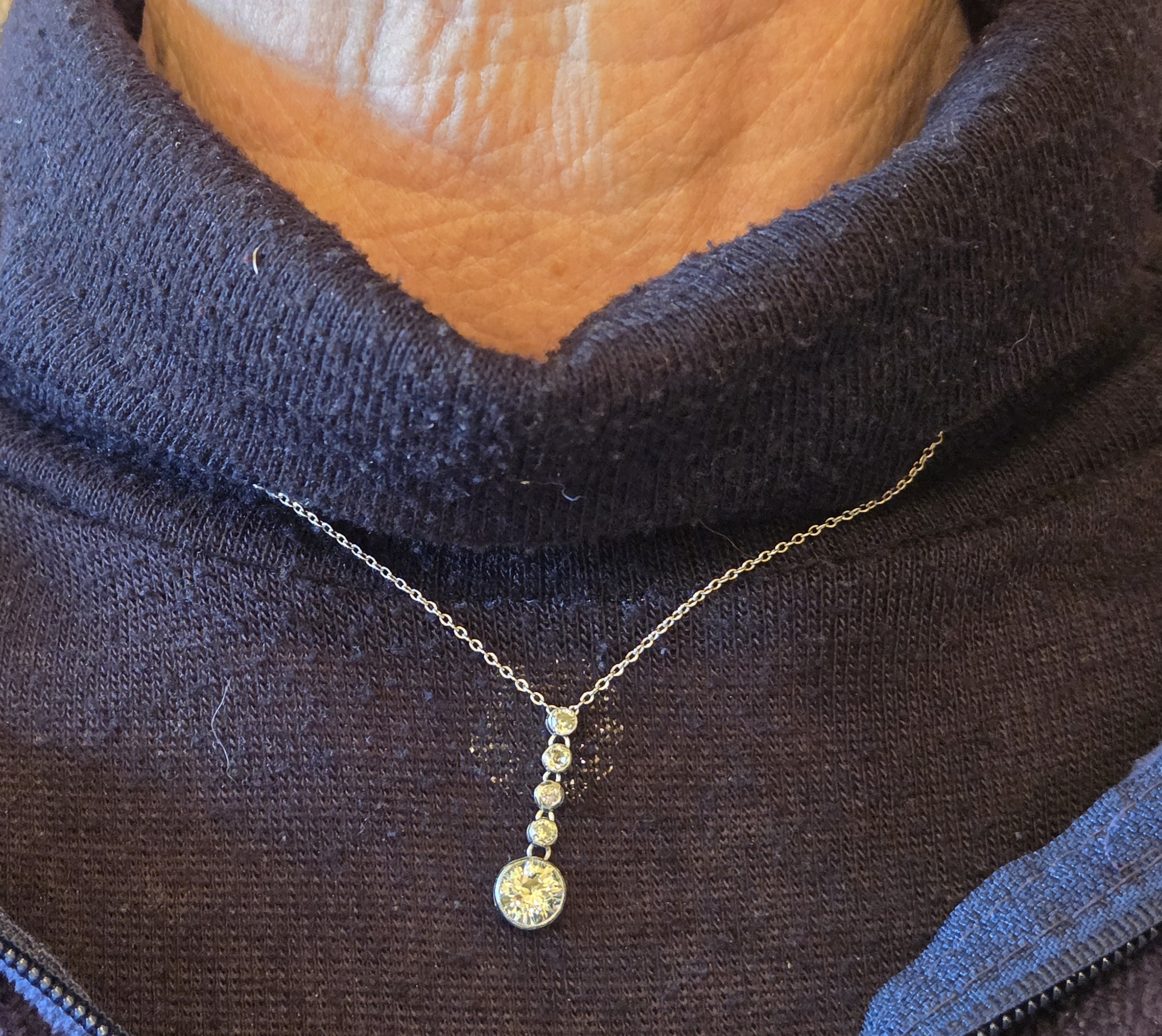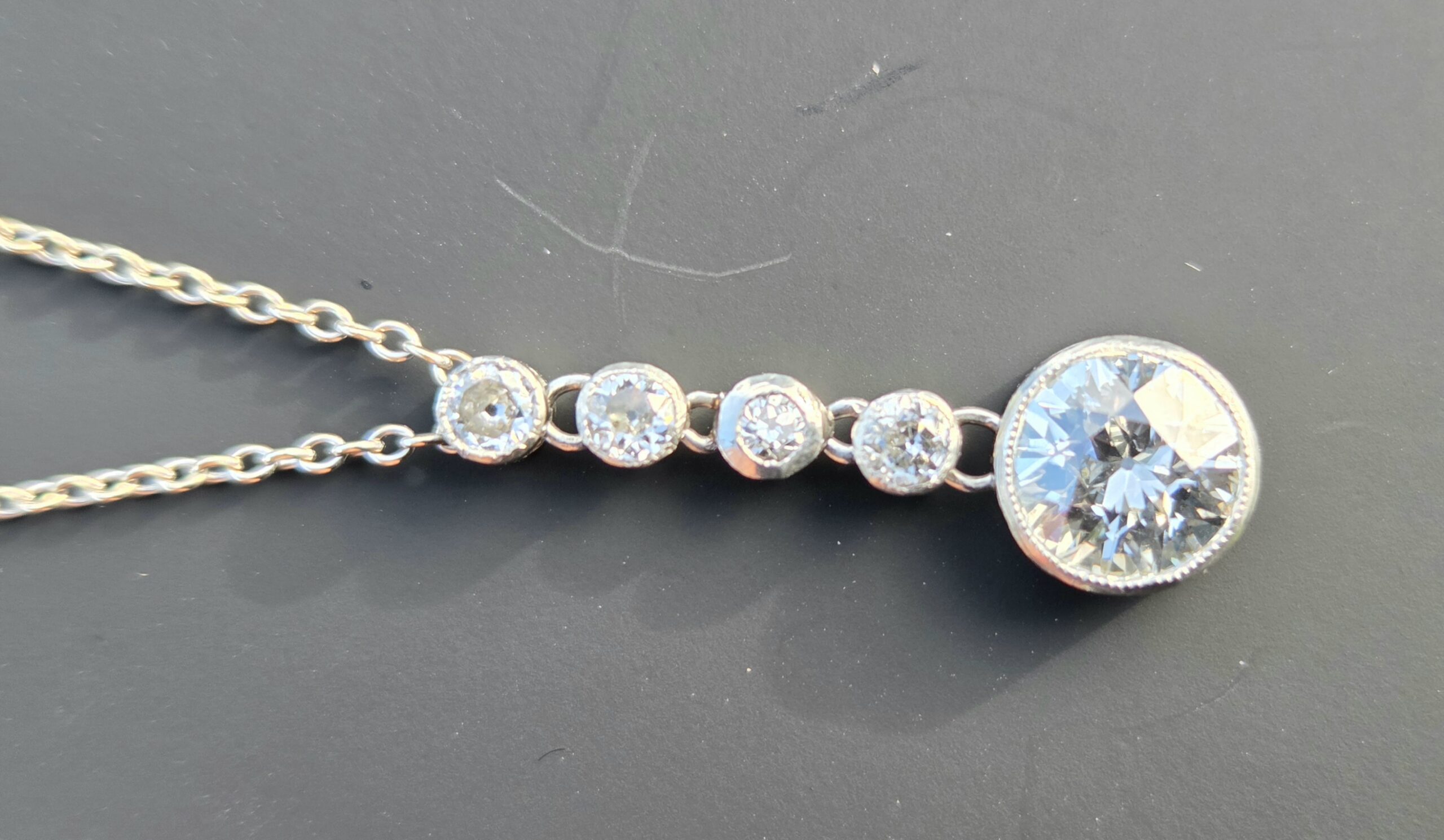 The most incredibly white Old European cut suspended from 4 smaller old cuts.