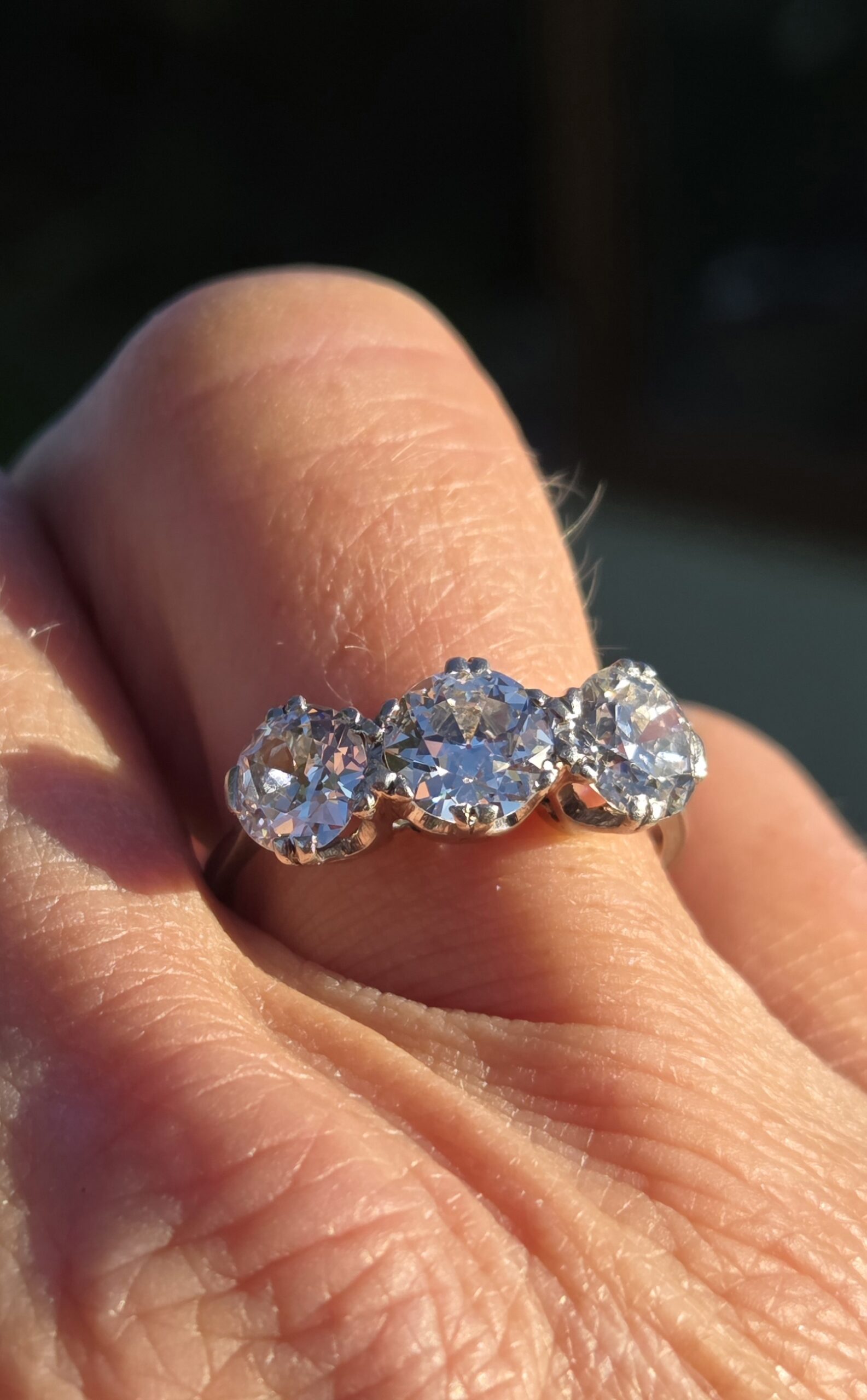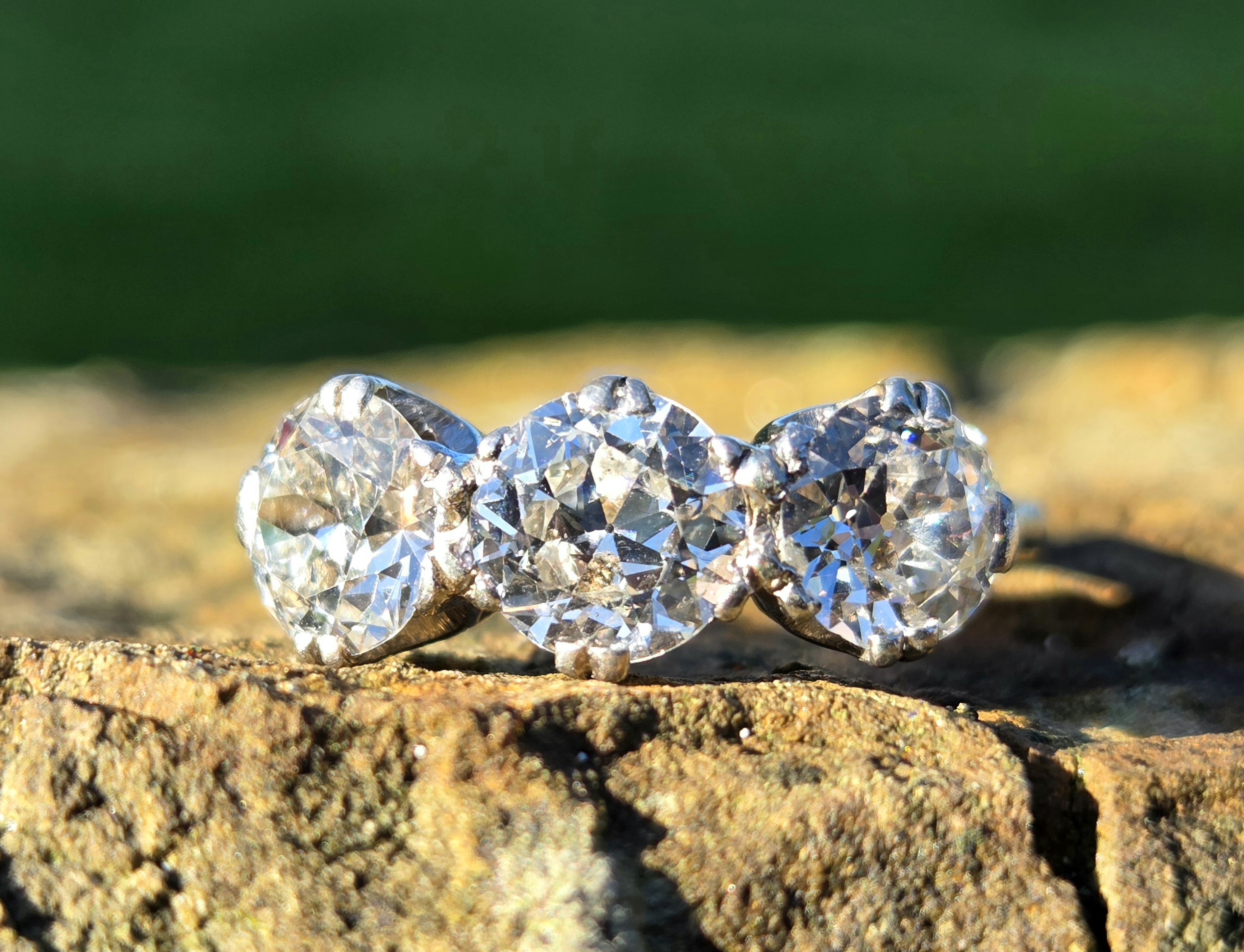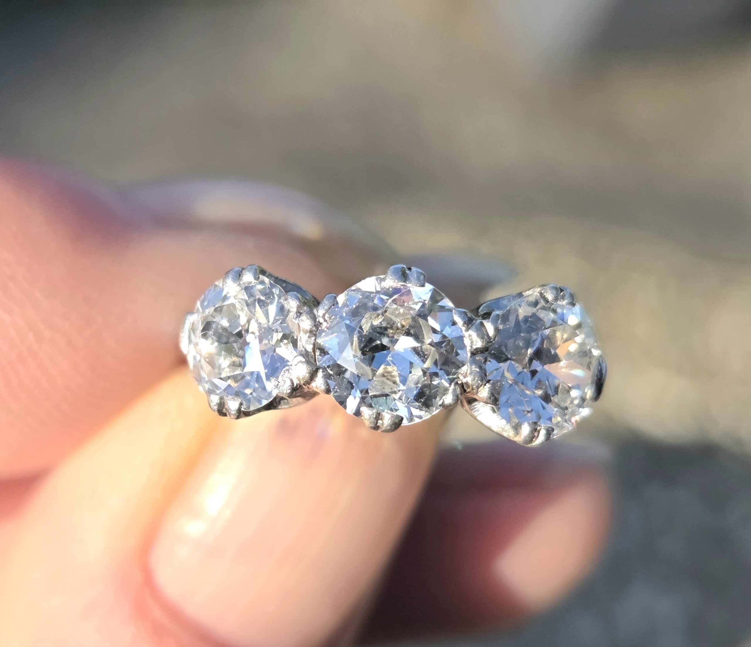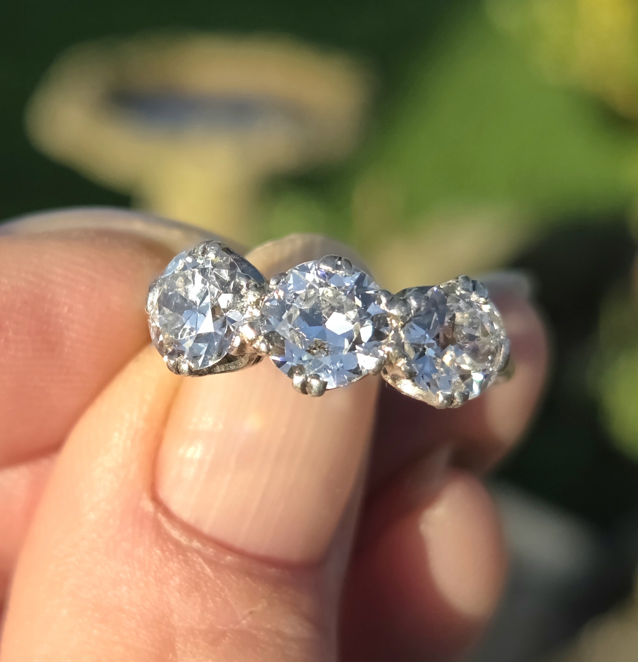 3 old European cut diamonds of almost equal size, each 6 -6.2mm approx. Claw set in platinum.