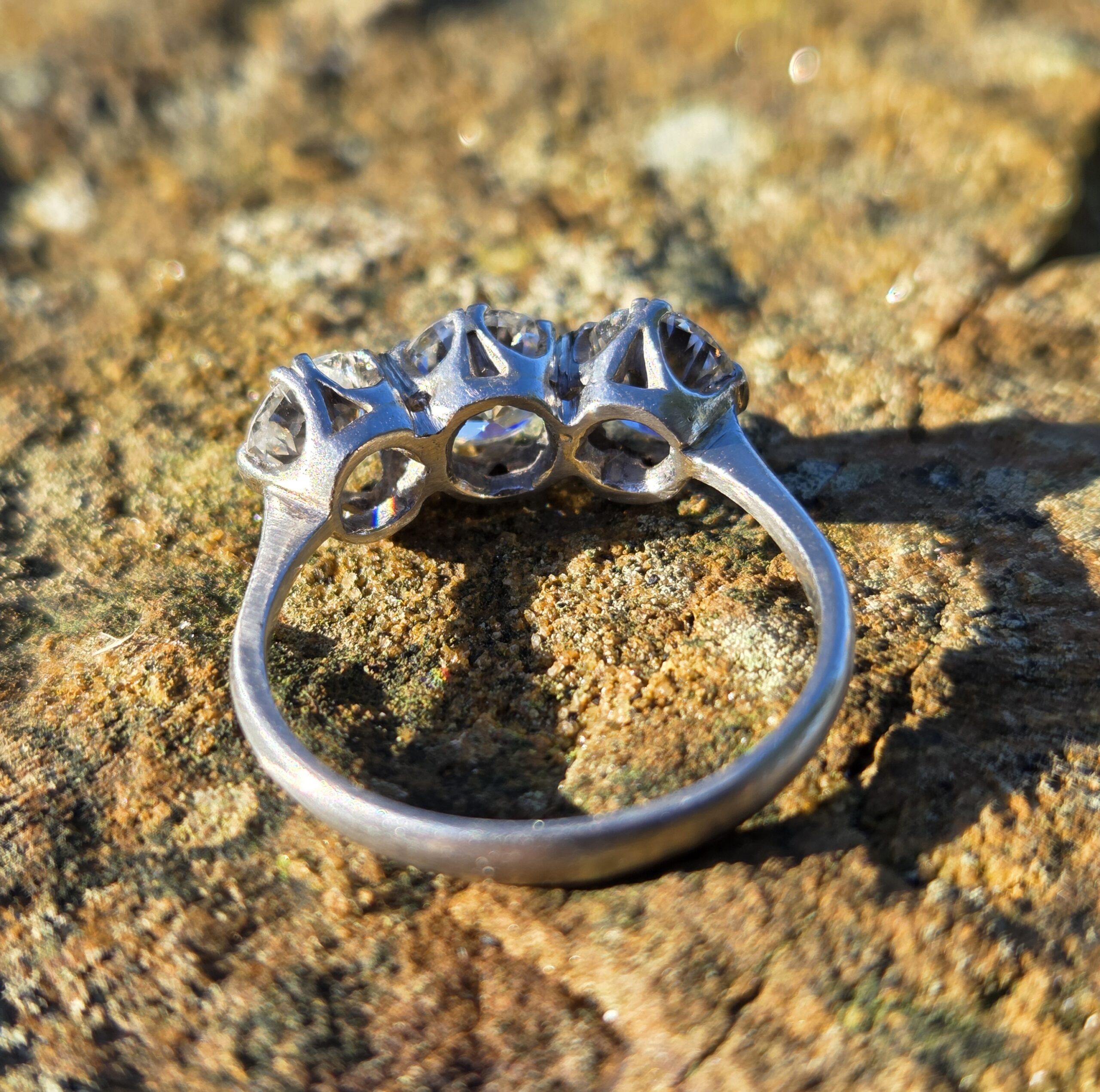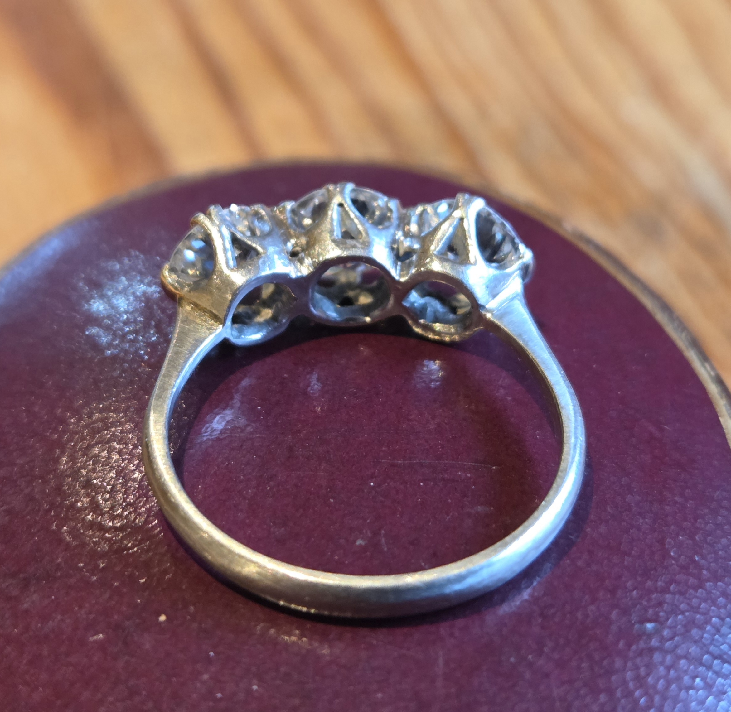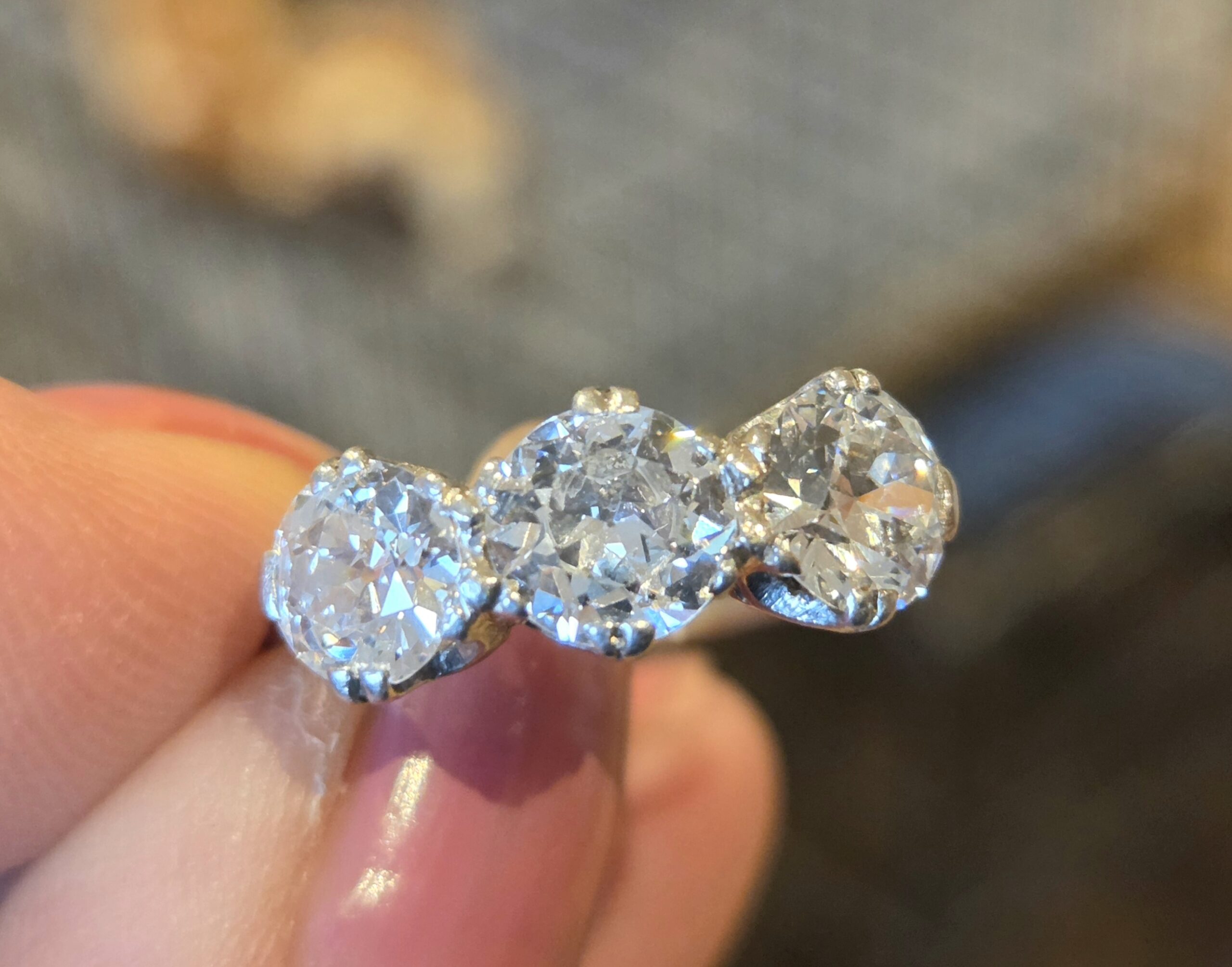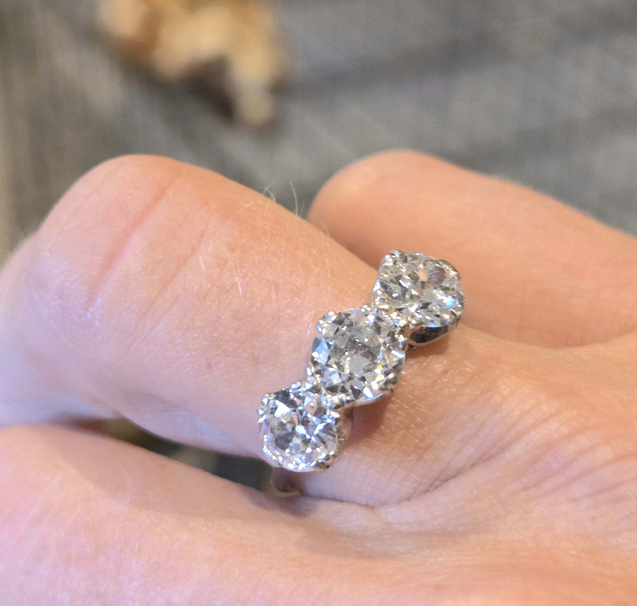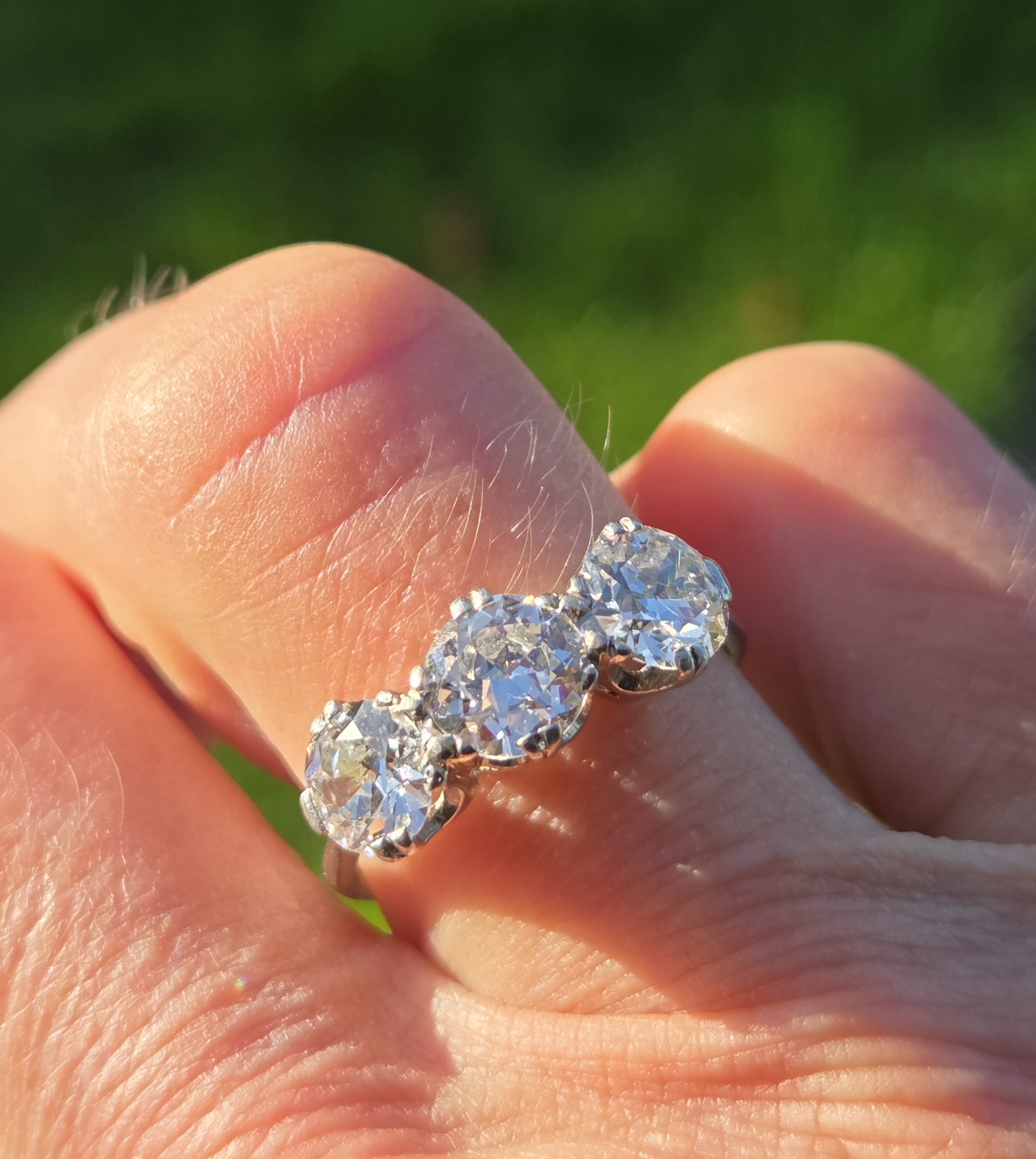 3 old European cut diamonds of almost equal size, each 6 -6.2mm approx. Claw set in platinum.