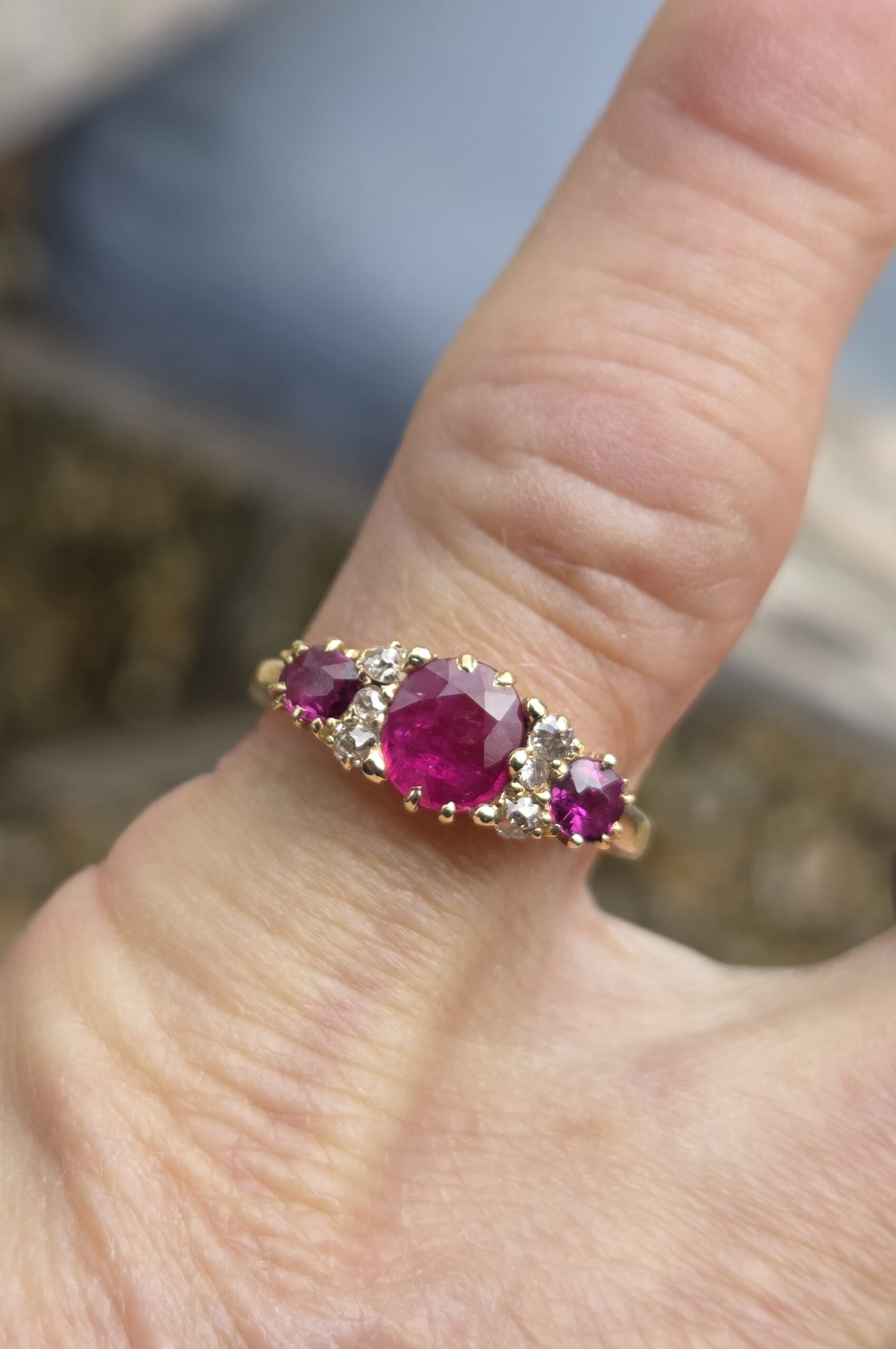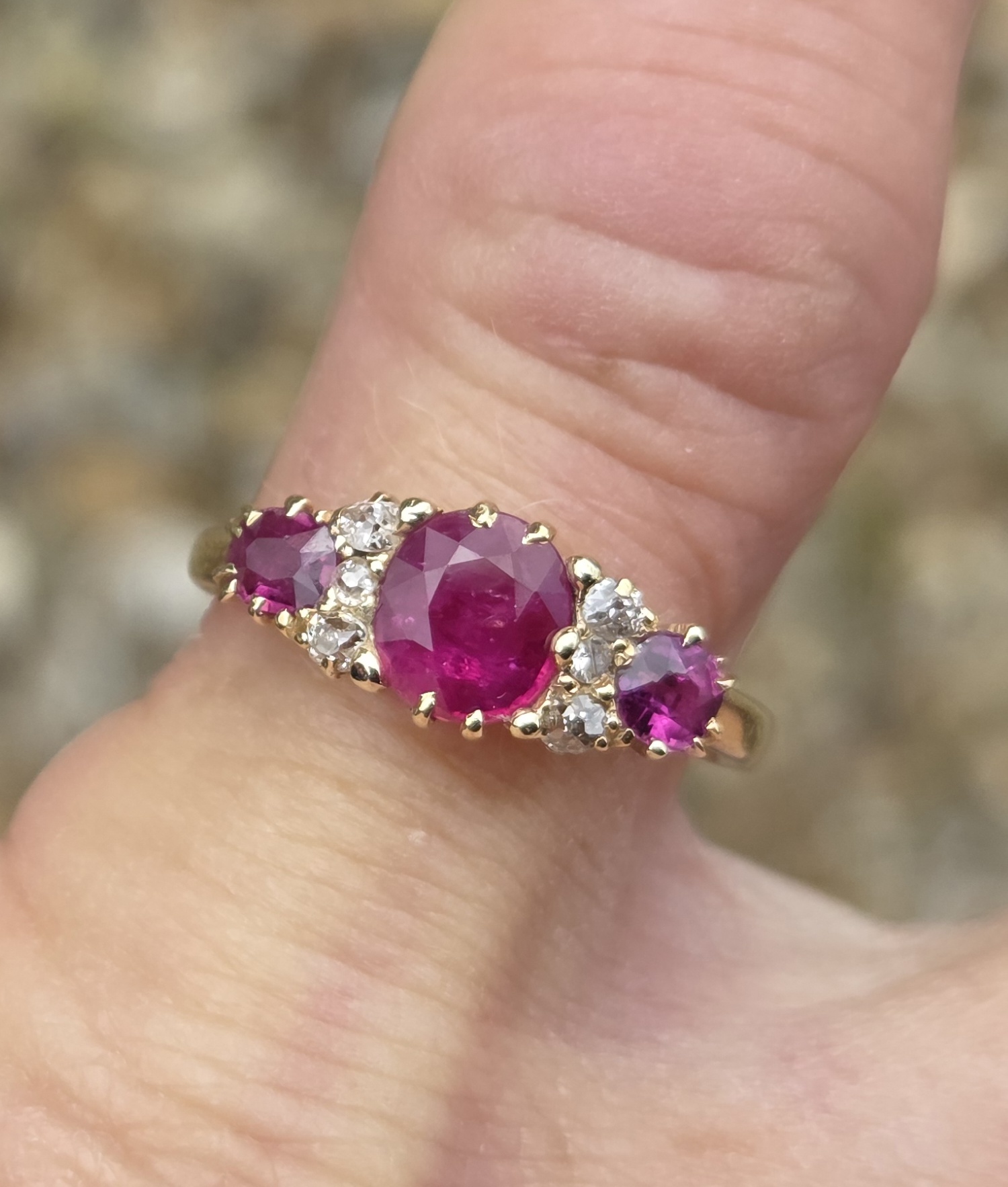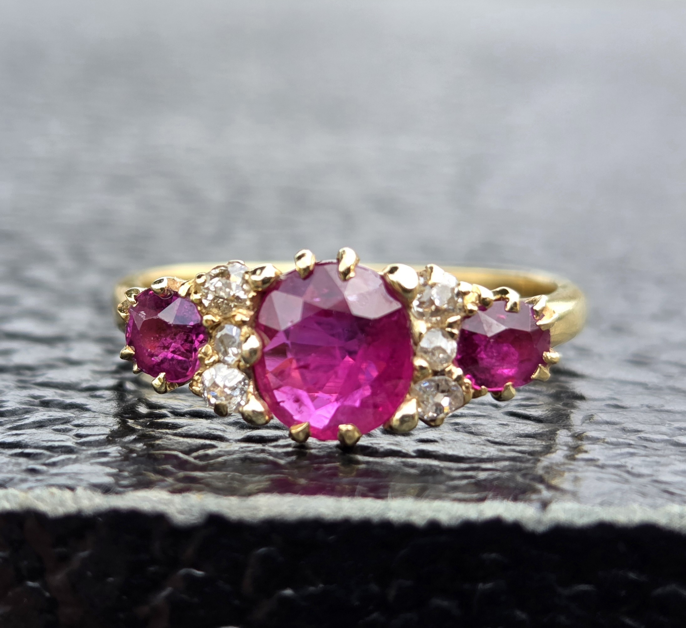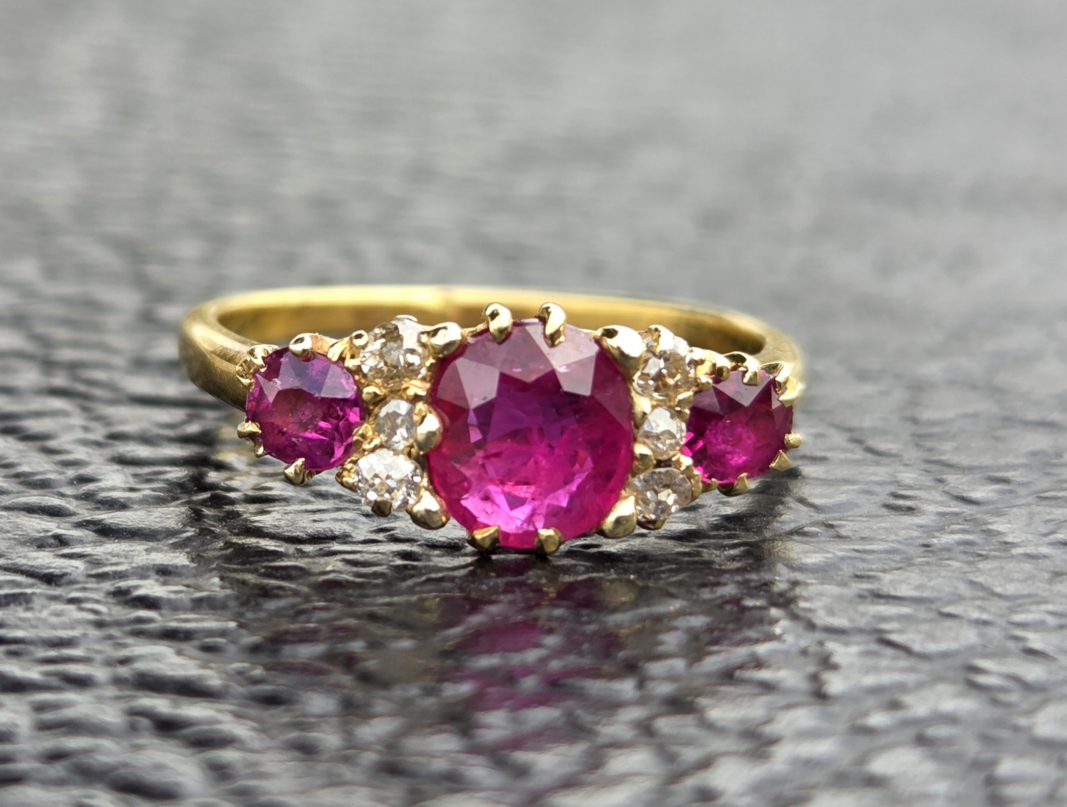 The central ruby, is natural and measures 6.5mm x 5.6mm, estimated to weigh 0.70ct. Outer rubies are 3.7mm approx. 0.15ct each