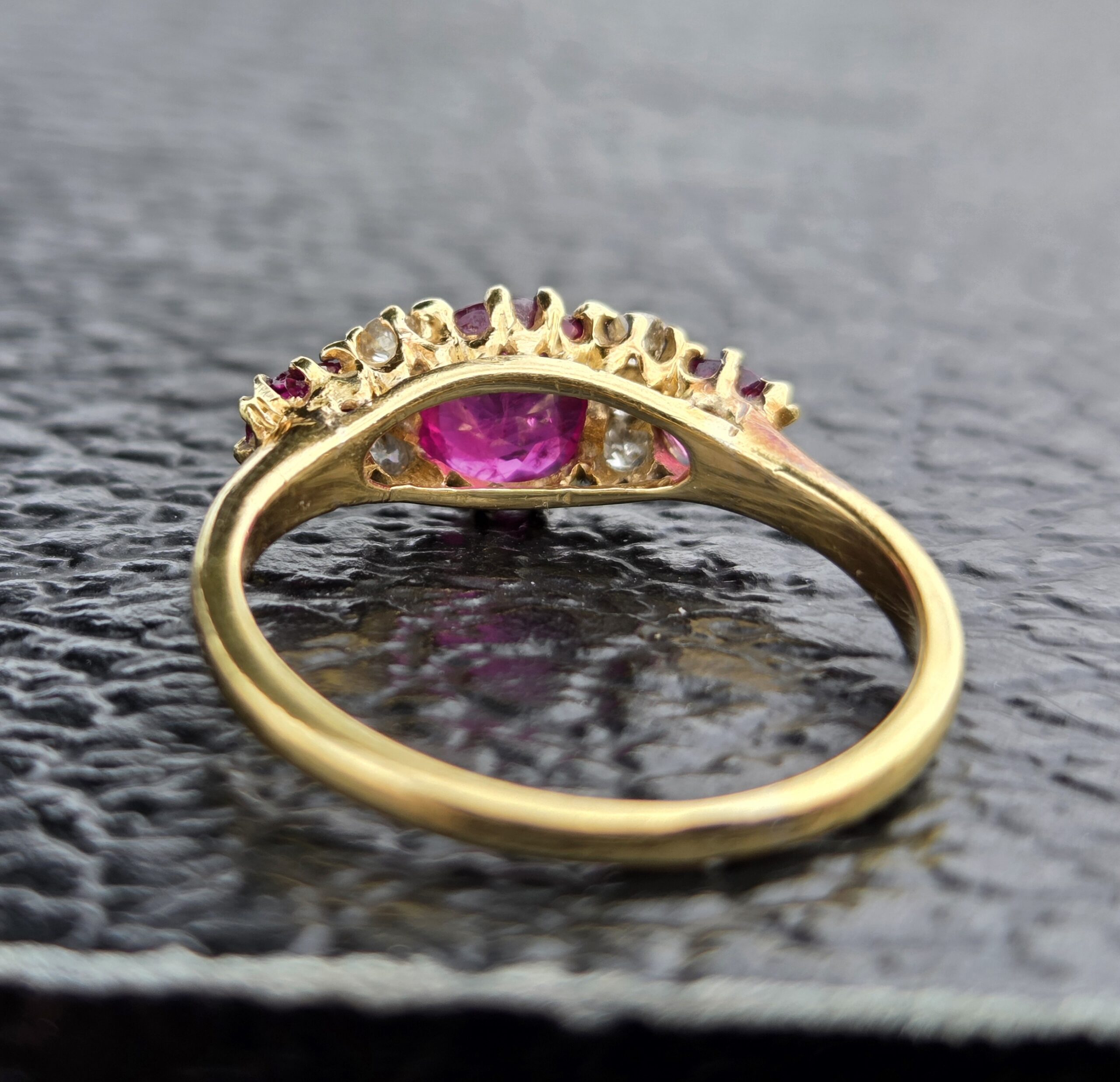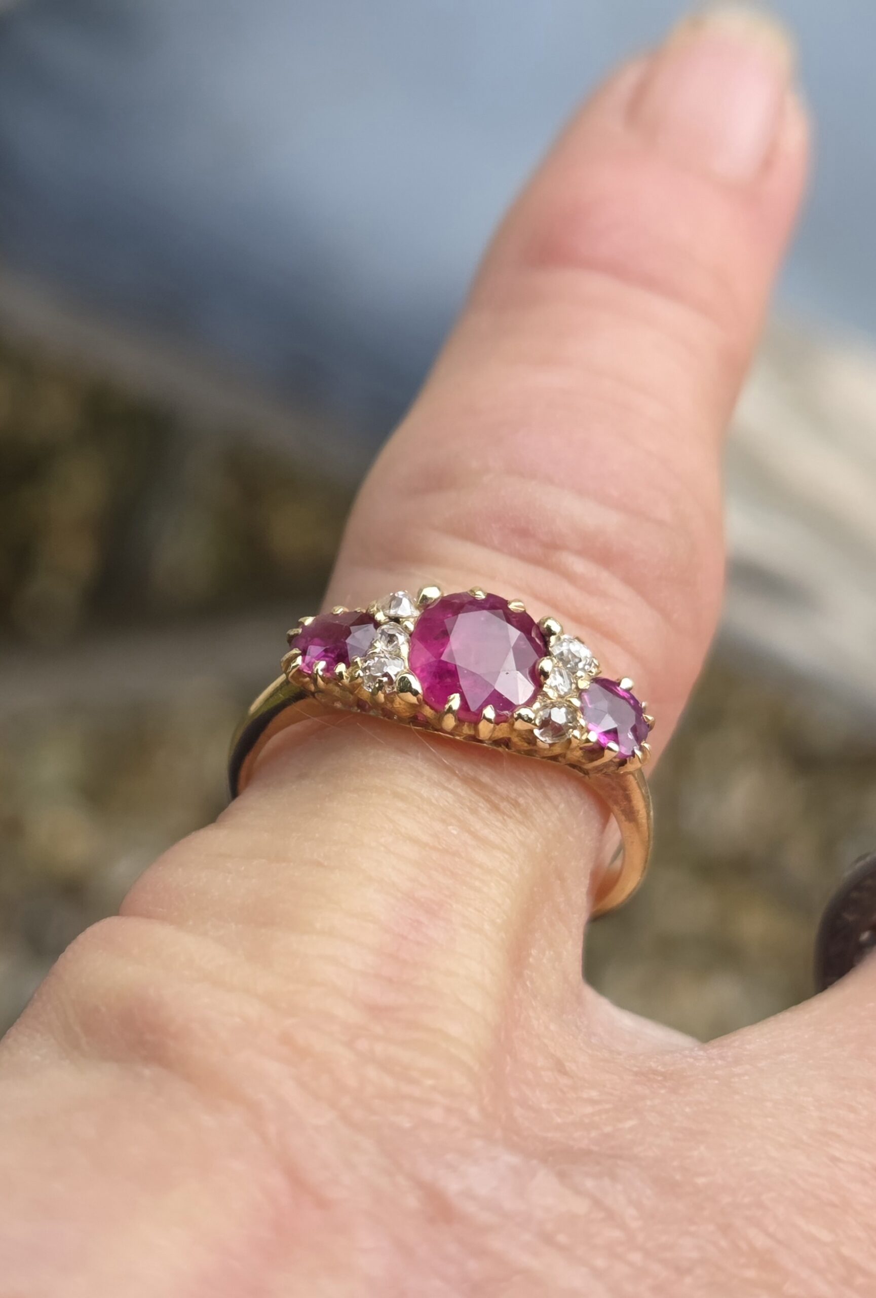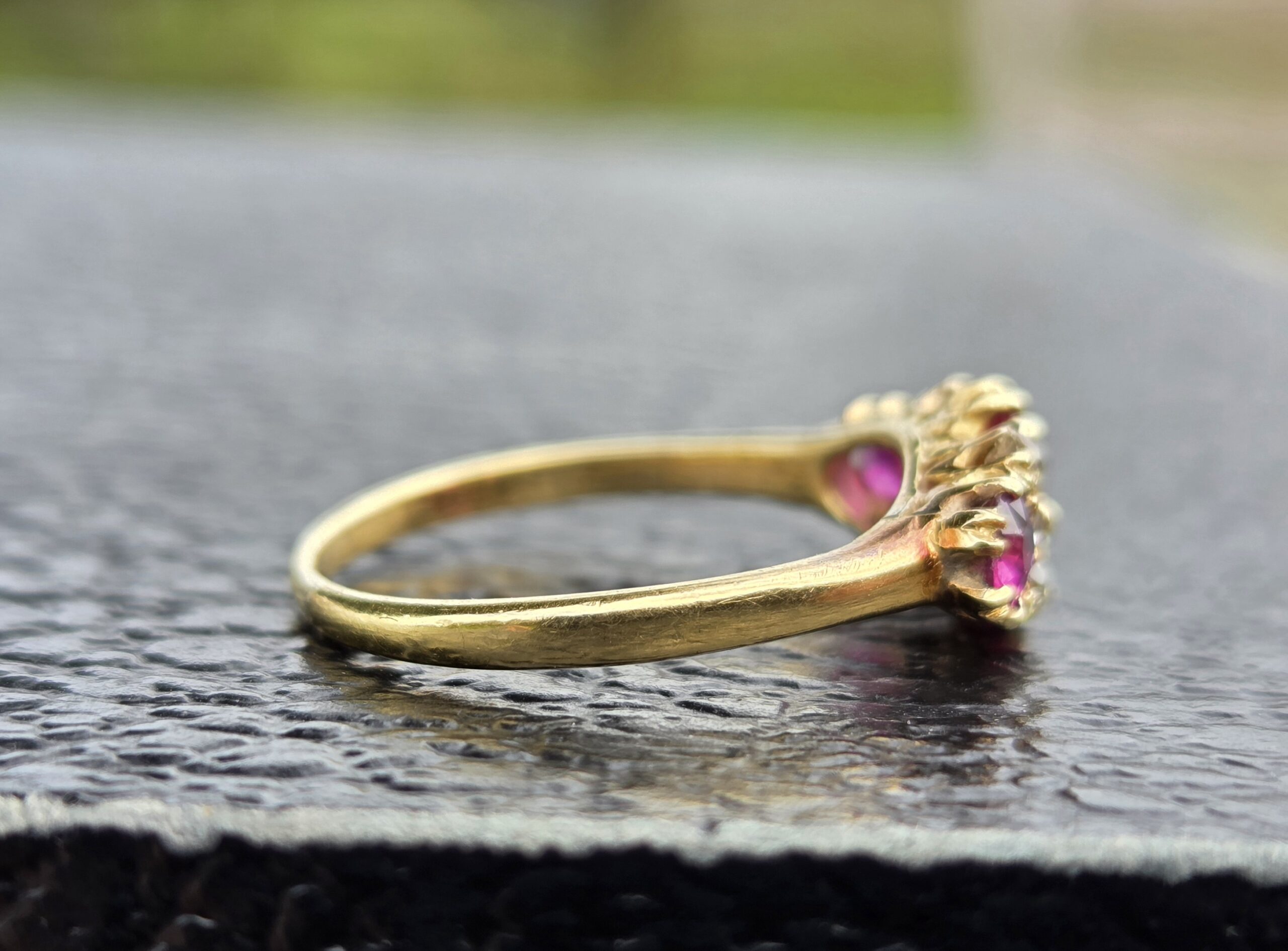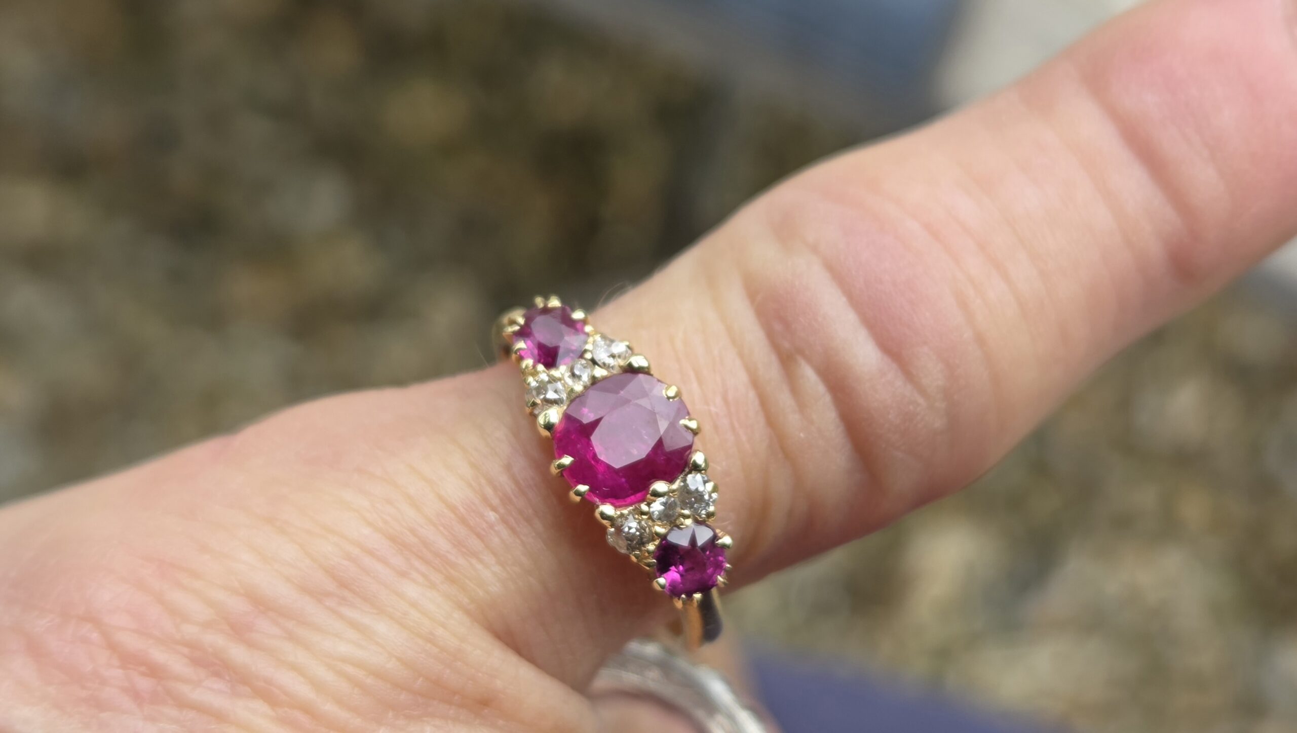 The central ruby, is natural and measures 6.5mm x 5.6mm, estimated to weigh 0.70ct. Outer rubies are 3.7mm approx. 0.15ct each
