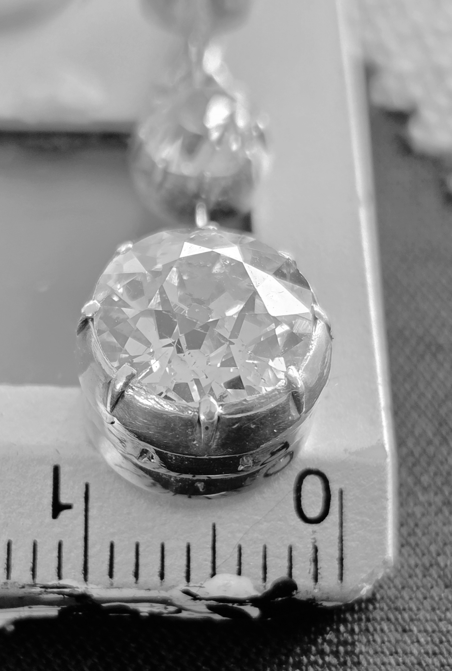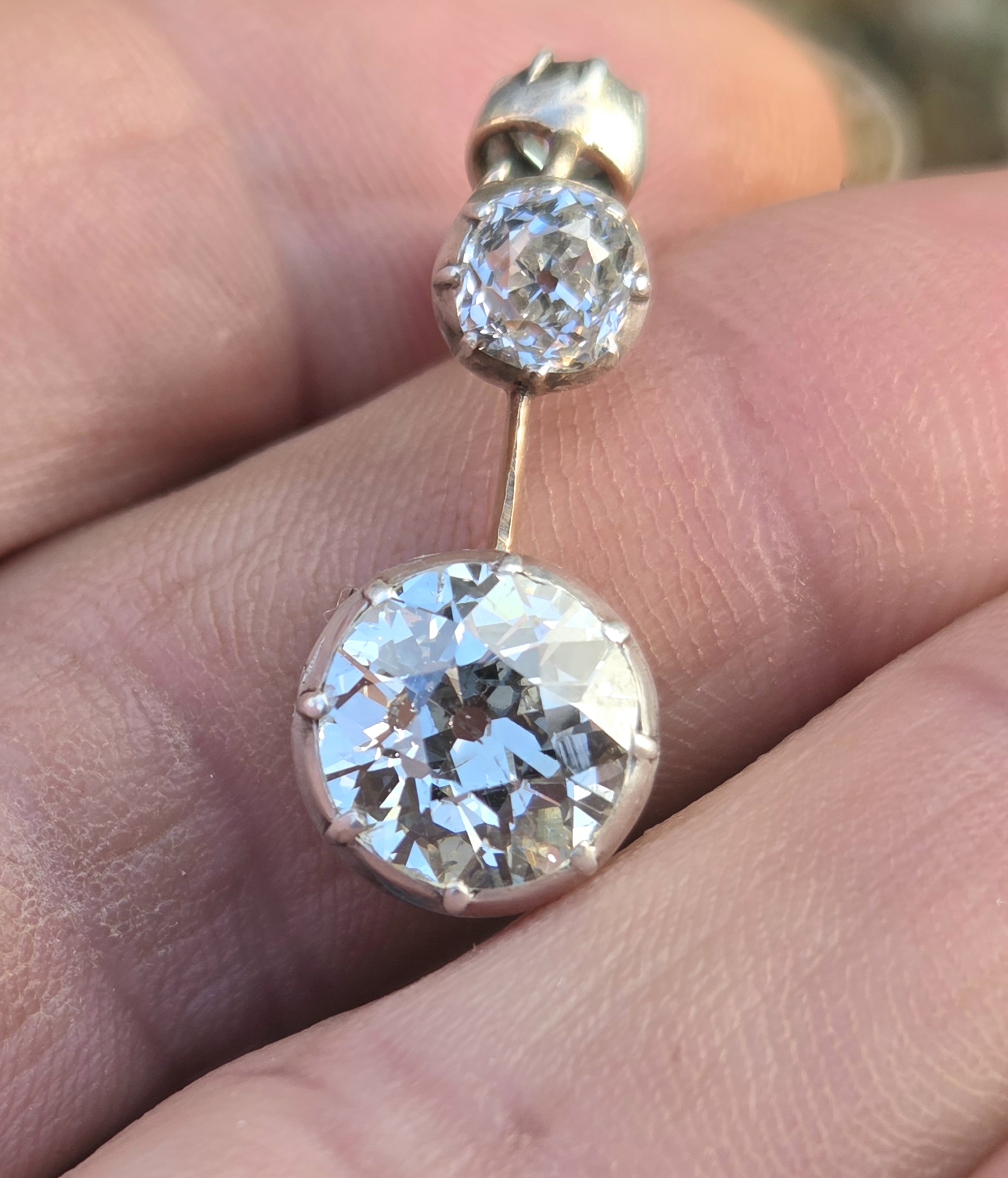 The drop is 8.9mm approx 3ct. Suspended from a 0.60ct Old Mine cut.