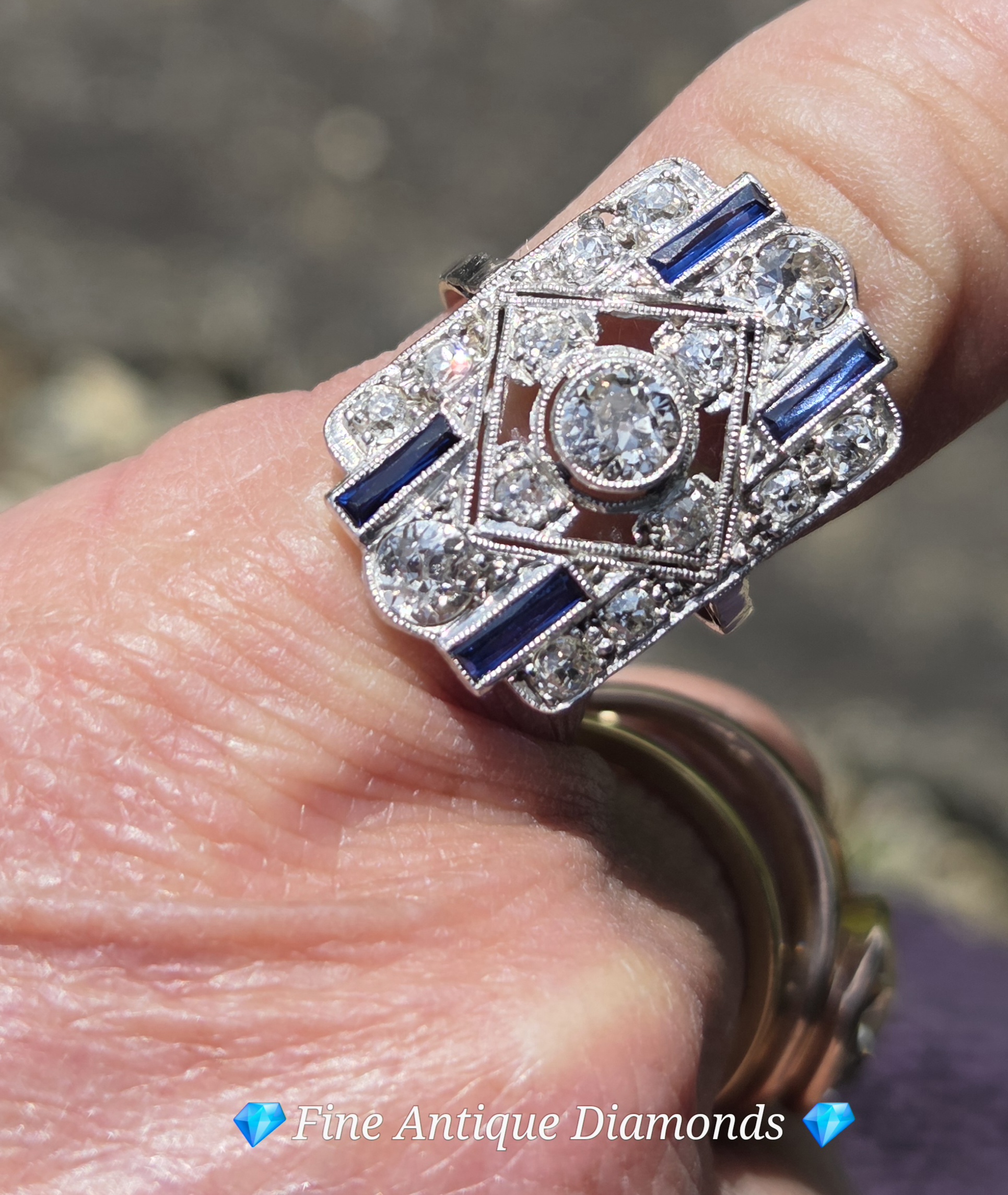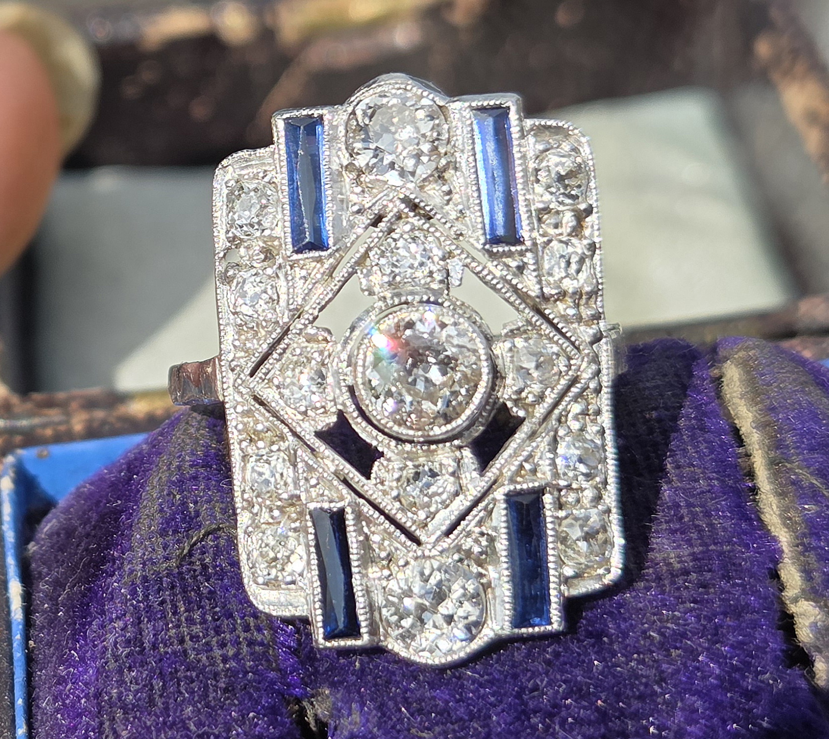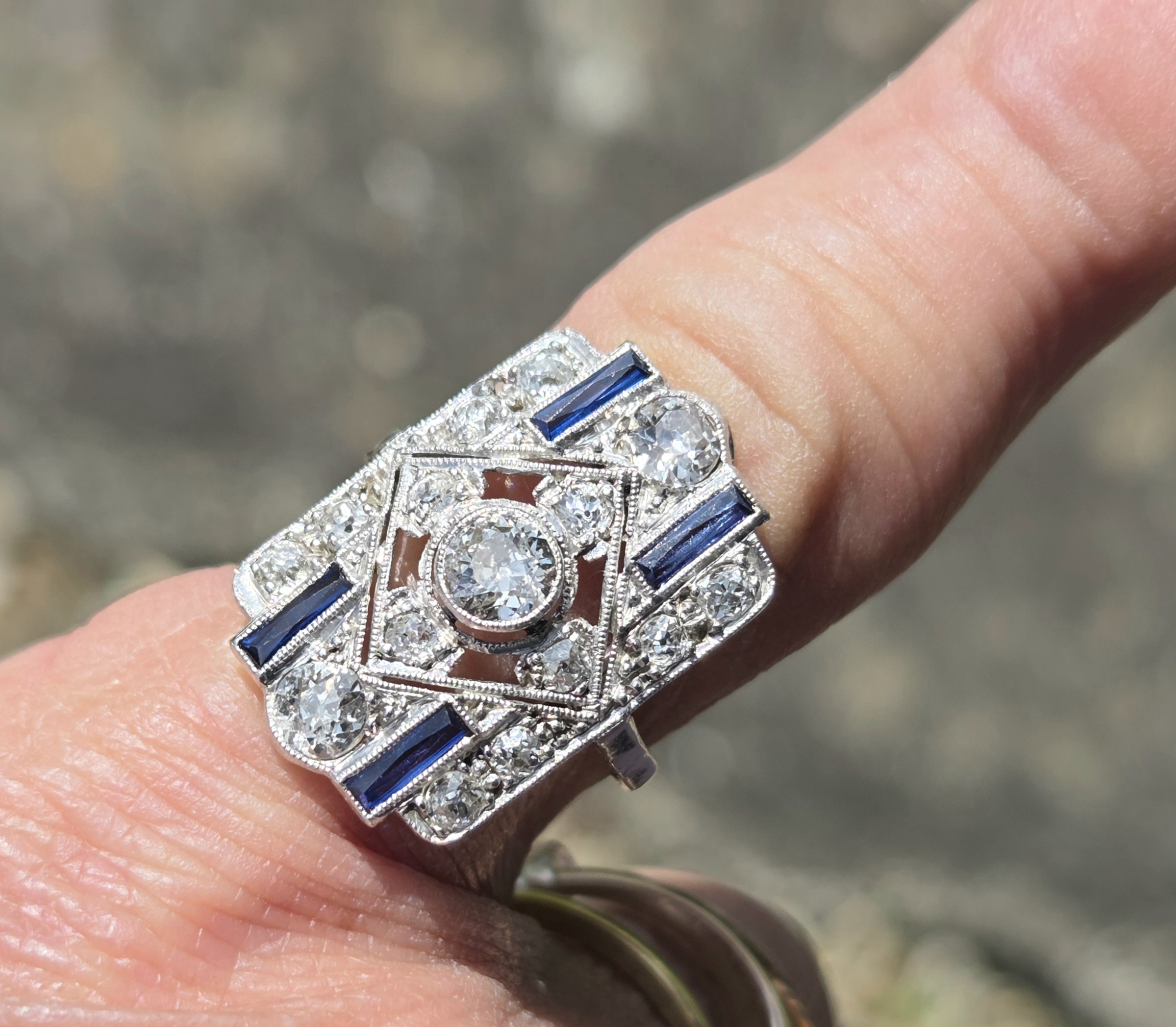 This piece is a classic Art Deco geometric plaque ring, likely dating from the 1920s or 1930s. It features a central old European cut diamond surrounded by a symmetrical arrangement of smaller diamonds and blue sapphire accents.