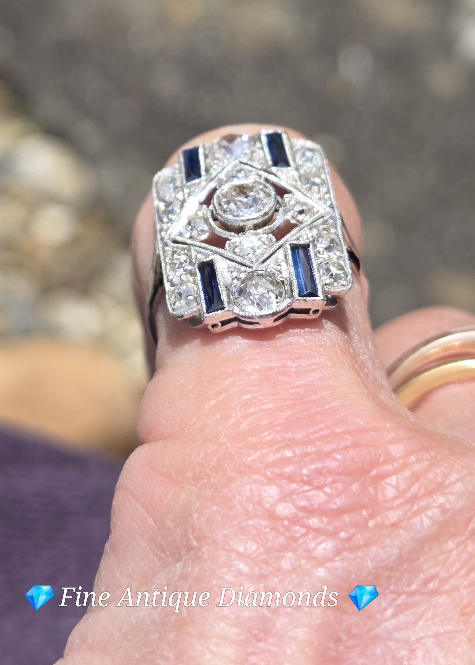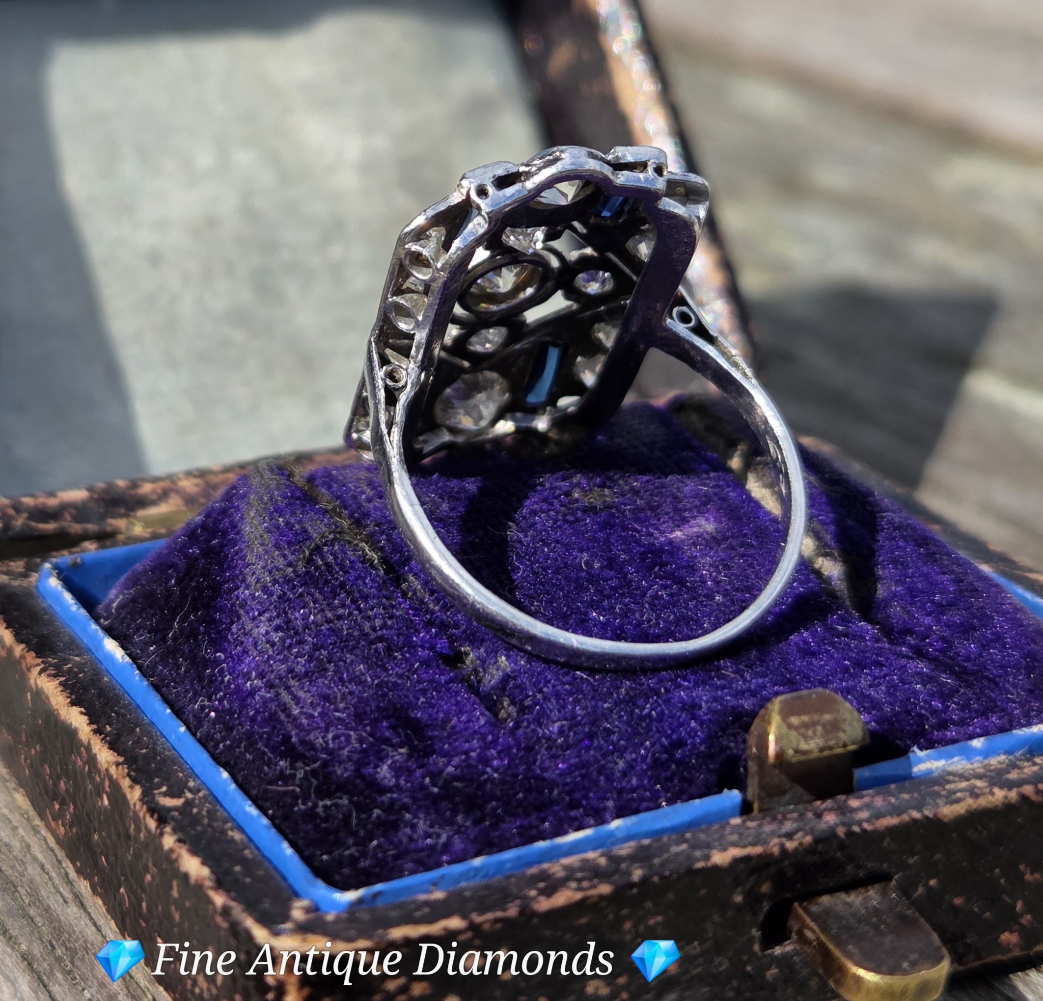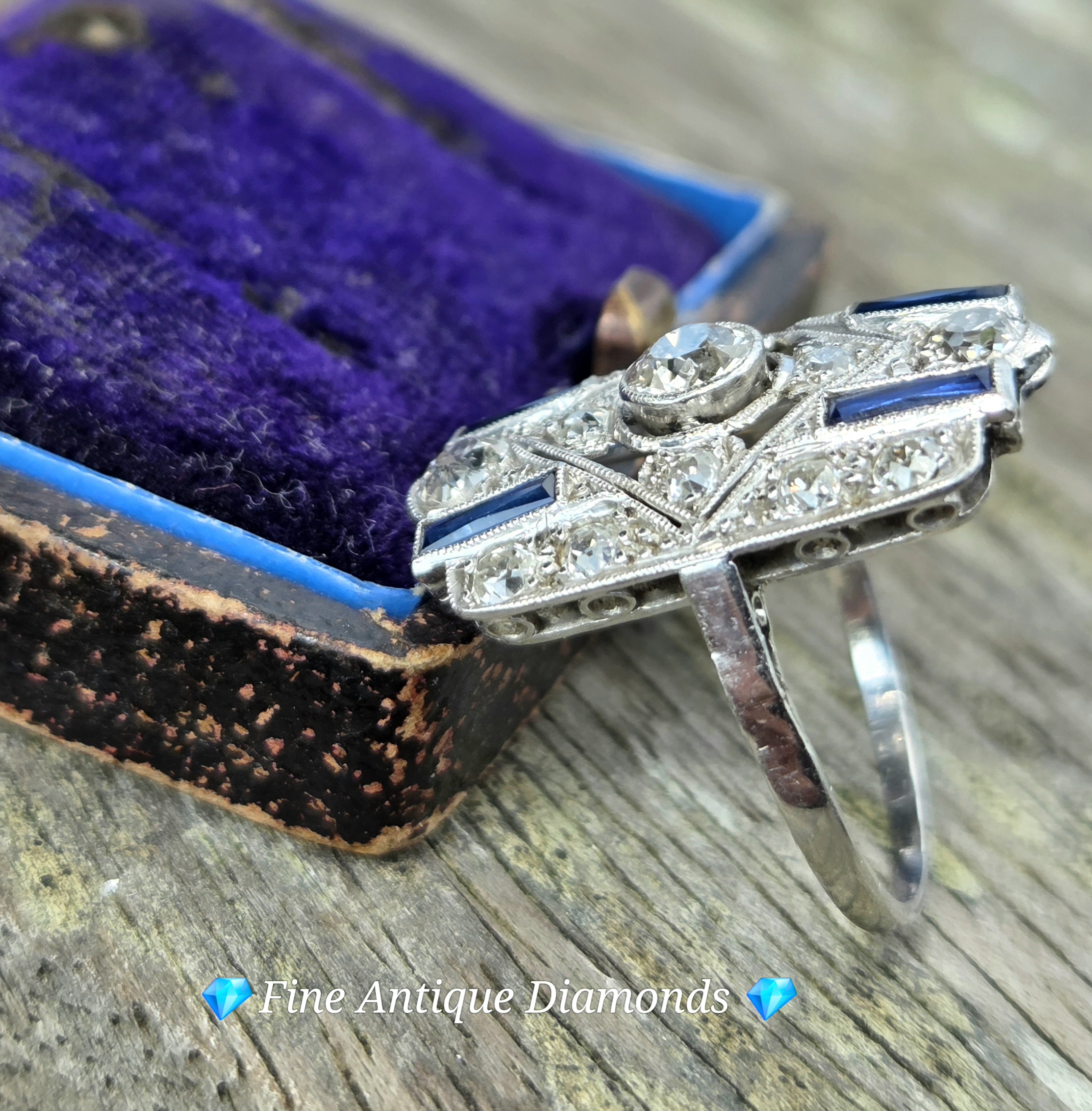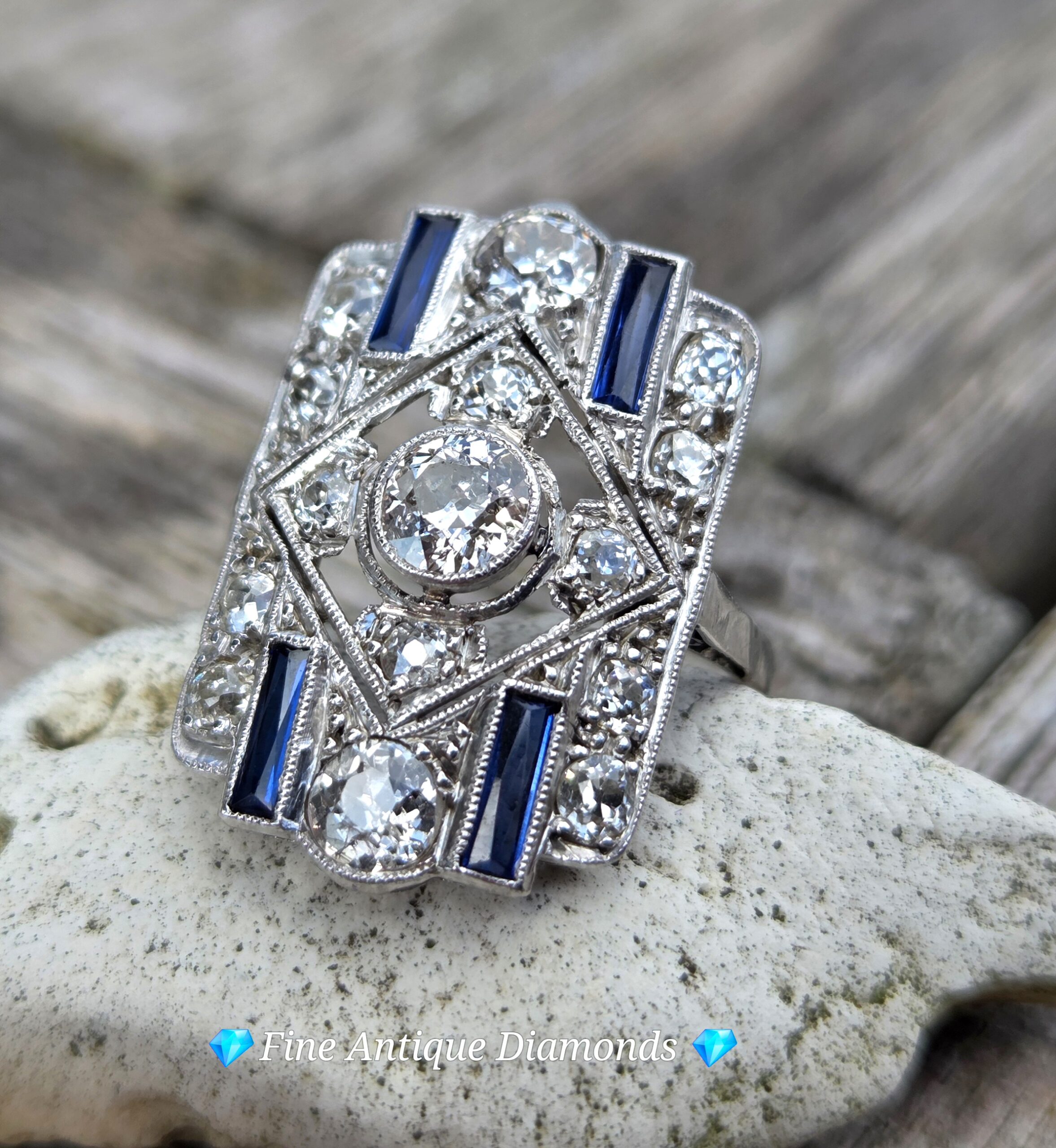 This piece is a classic Art Deco geometric plaque ring, likely dating from the 1920s or 1930s. It features a central old European cut diamond surrounded by a symmetrical arrangement of smaller diamonds and blue sapphire accents.