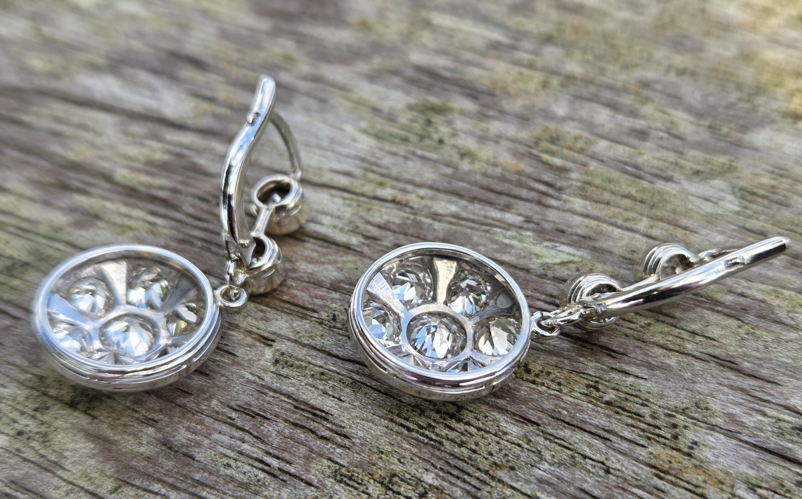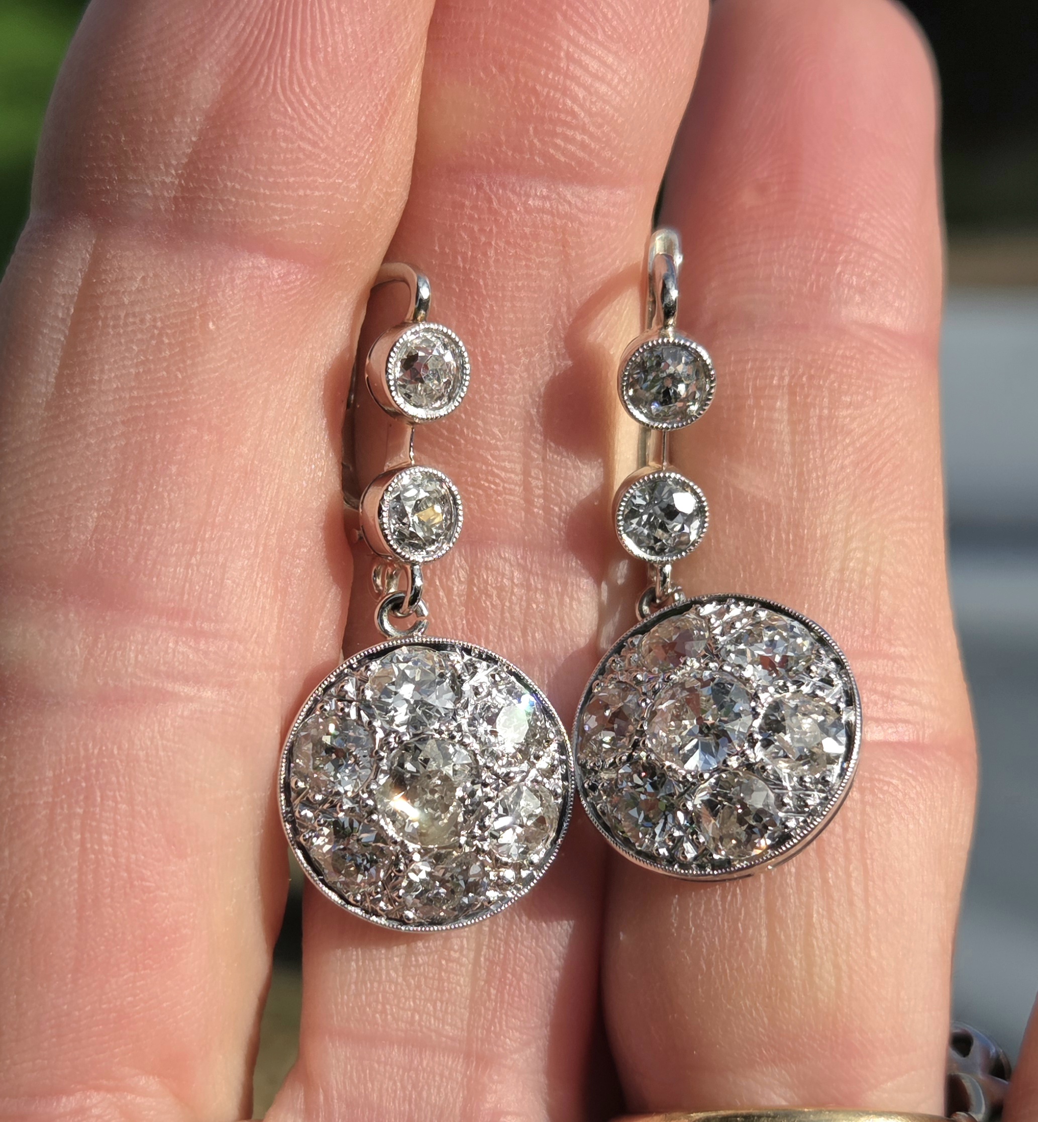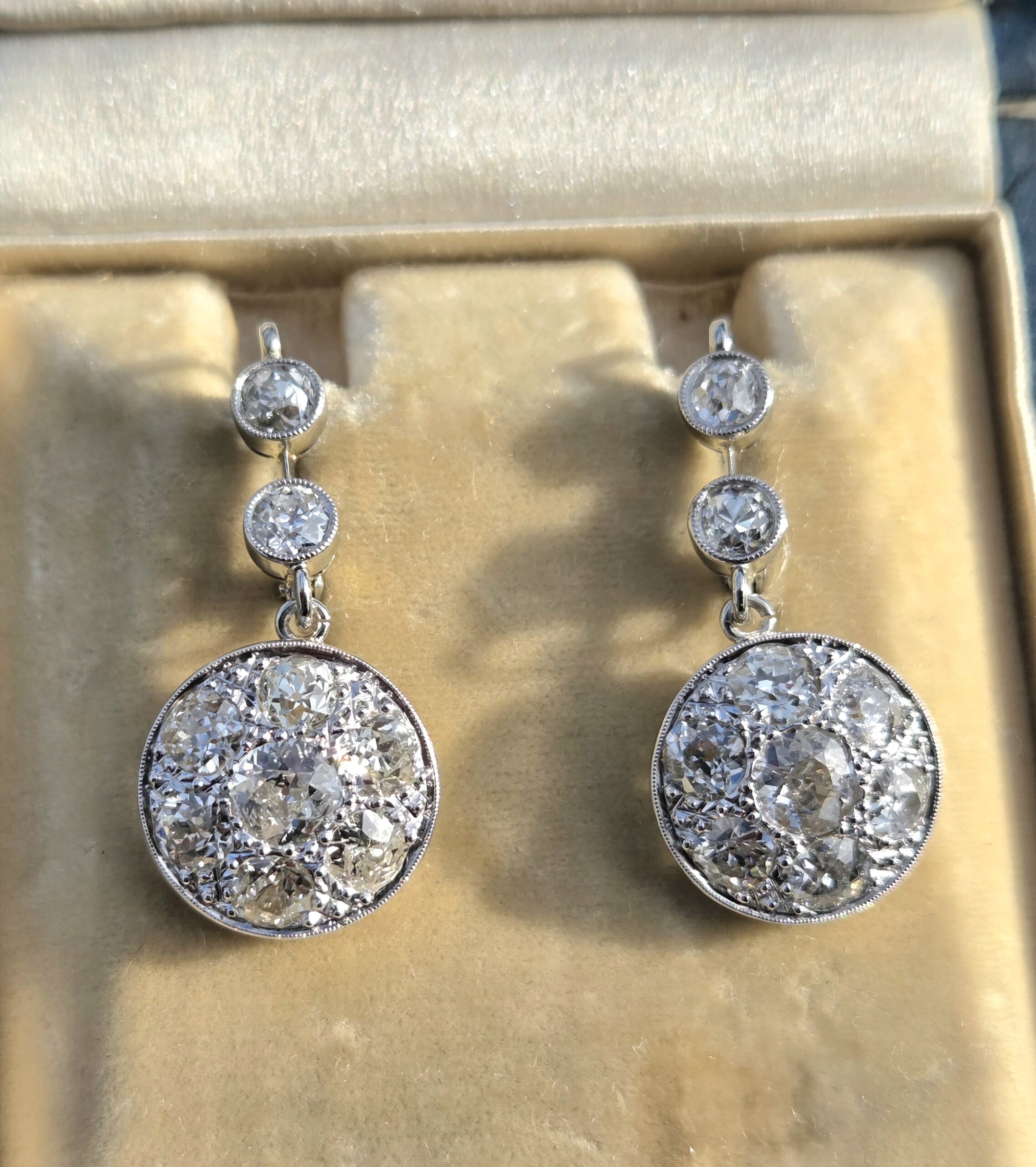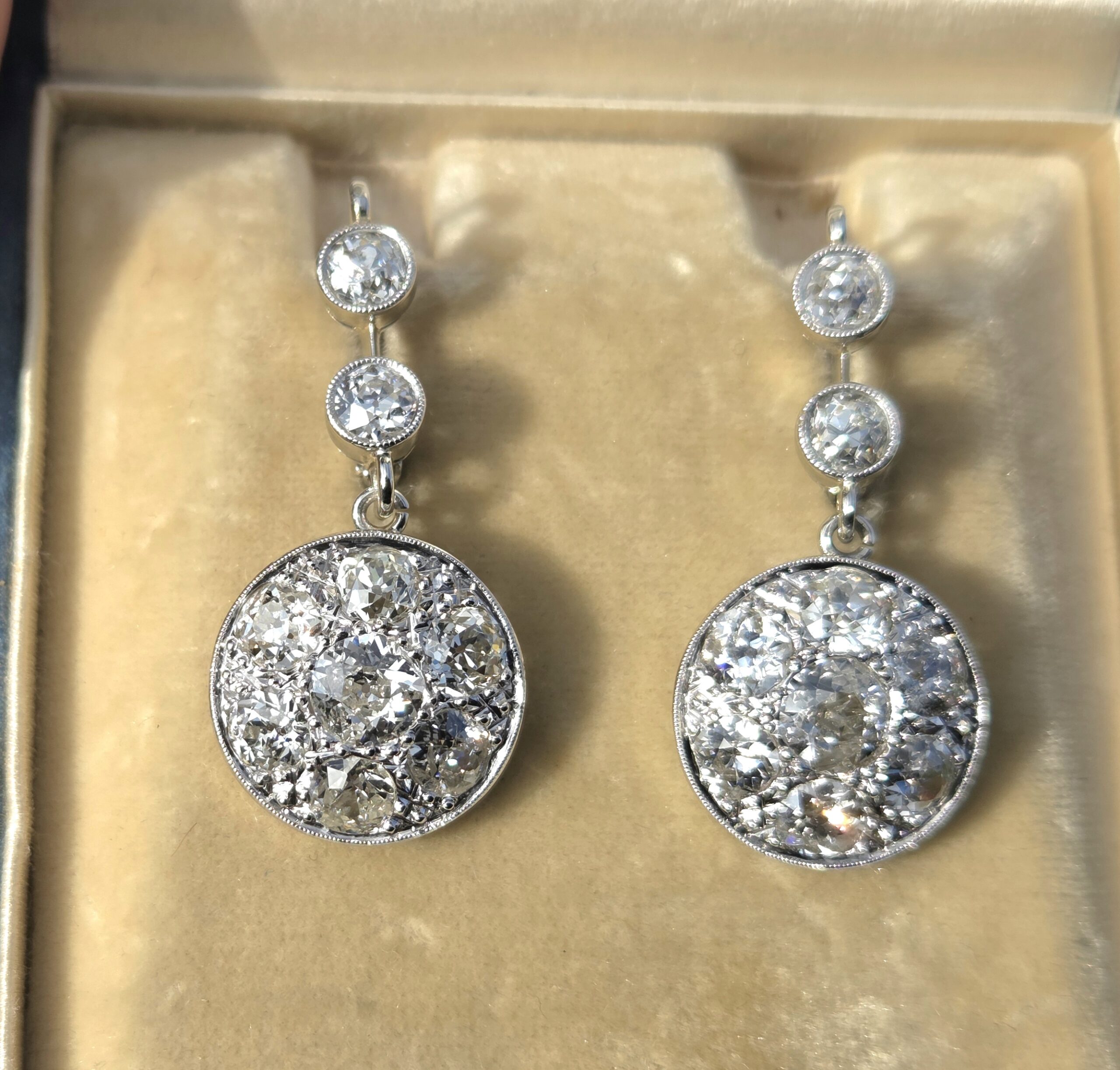 Surrounded by 6 Old cut diamonds each 30 to 35 points. Absolutely huge diamond weight of 2.40ct each earring!! Almost 5ct in just the drop sections!