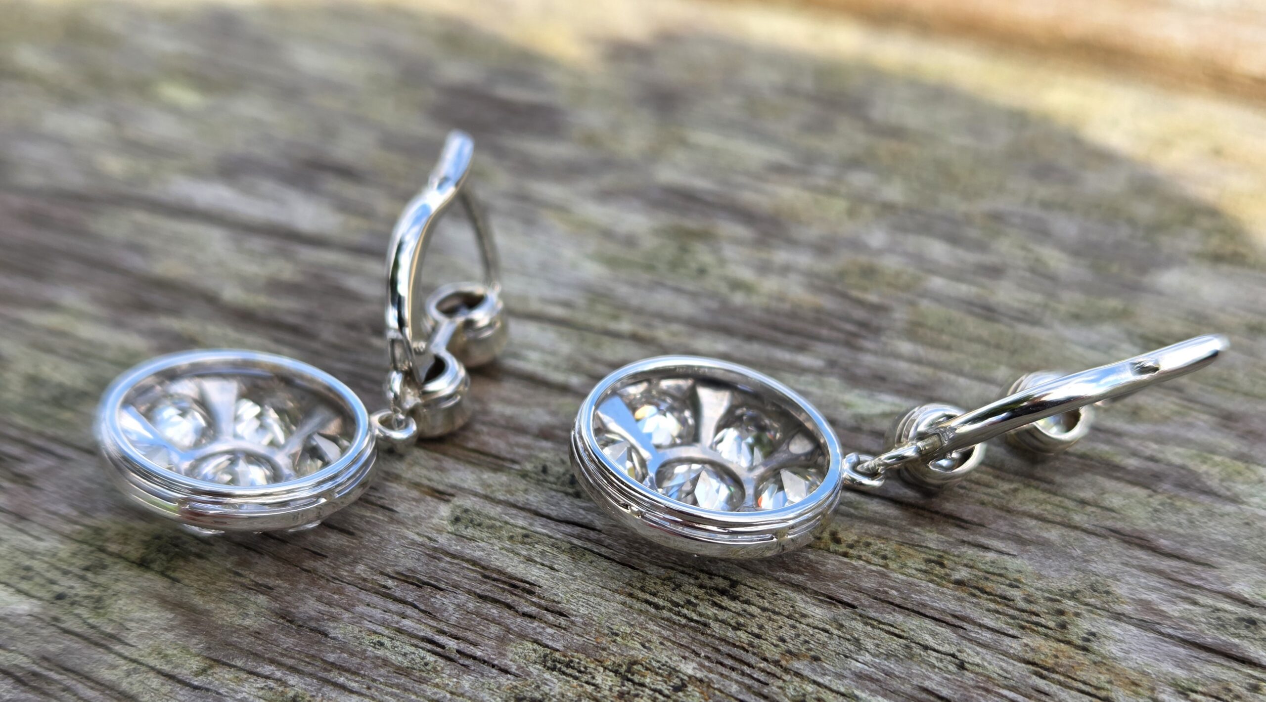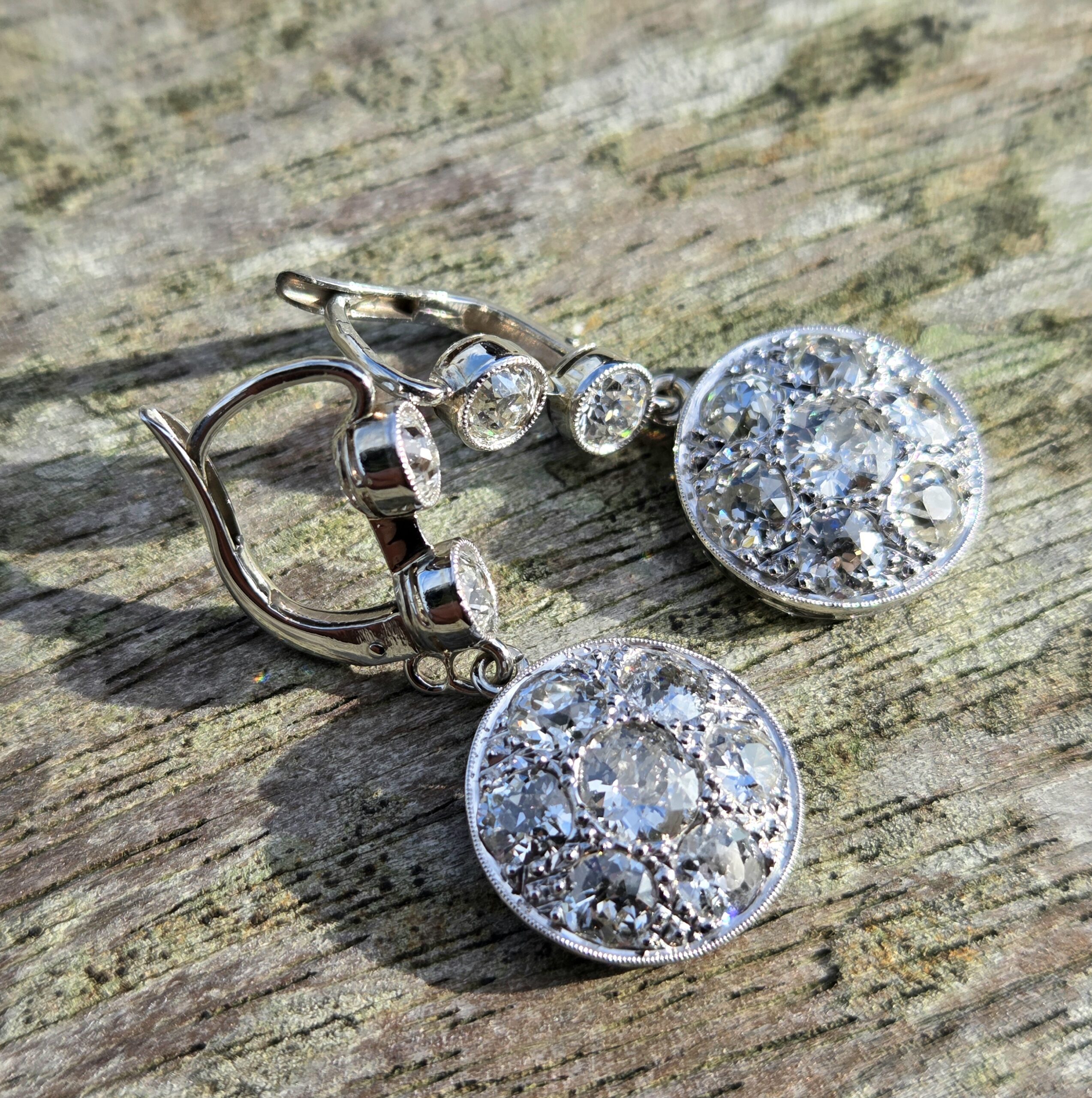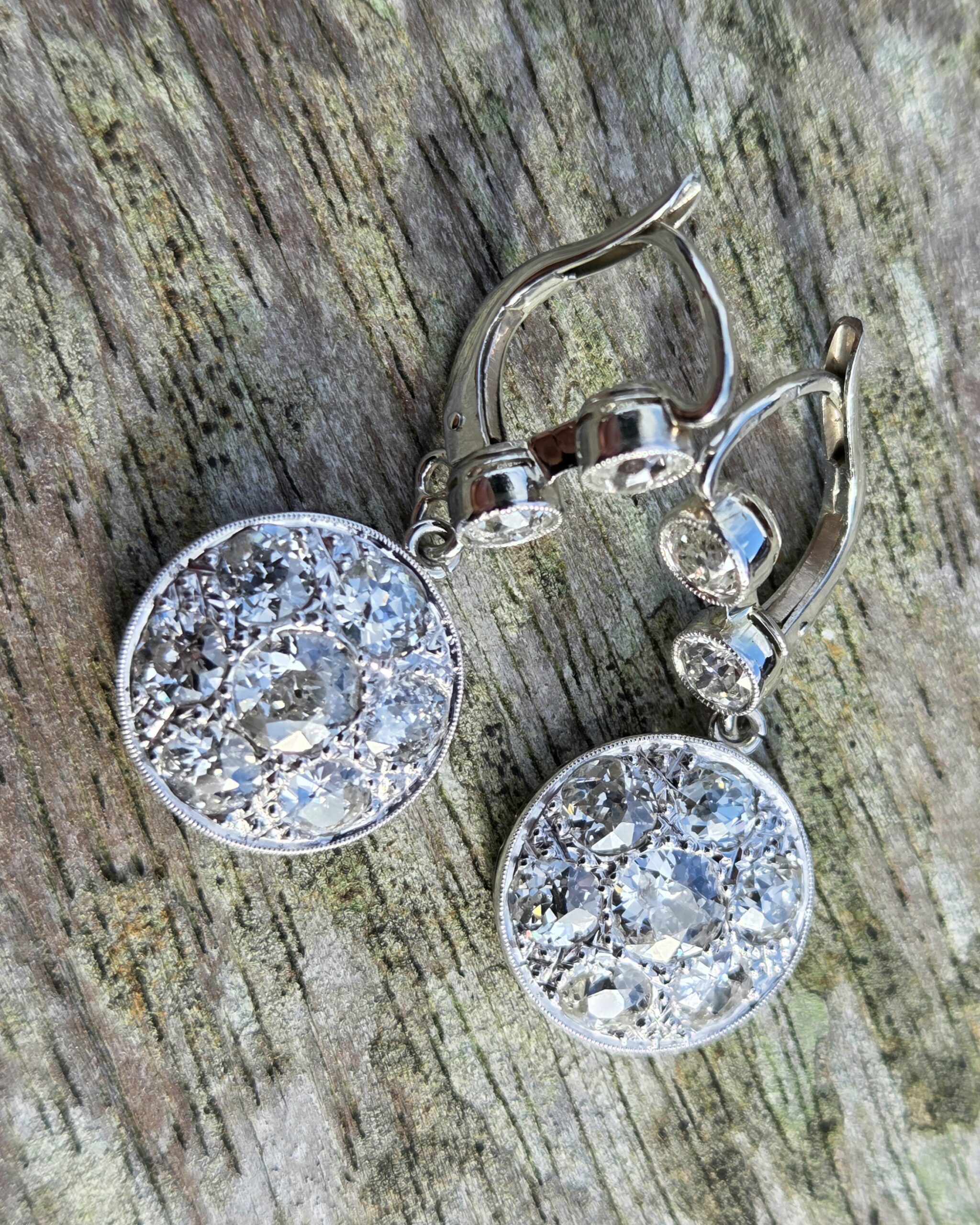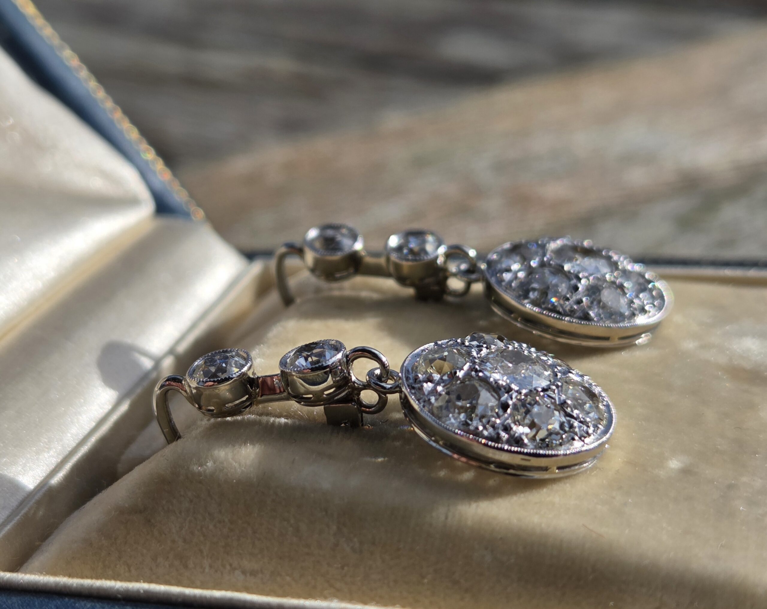 Surrounded by 6 Old cut diamonds each 30 to 35 points. Absolutely huge diamond weight of 2.40ct each earring!! Almost 5ct in just the drop sections!