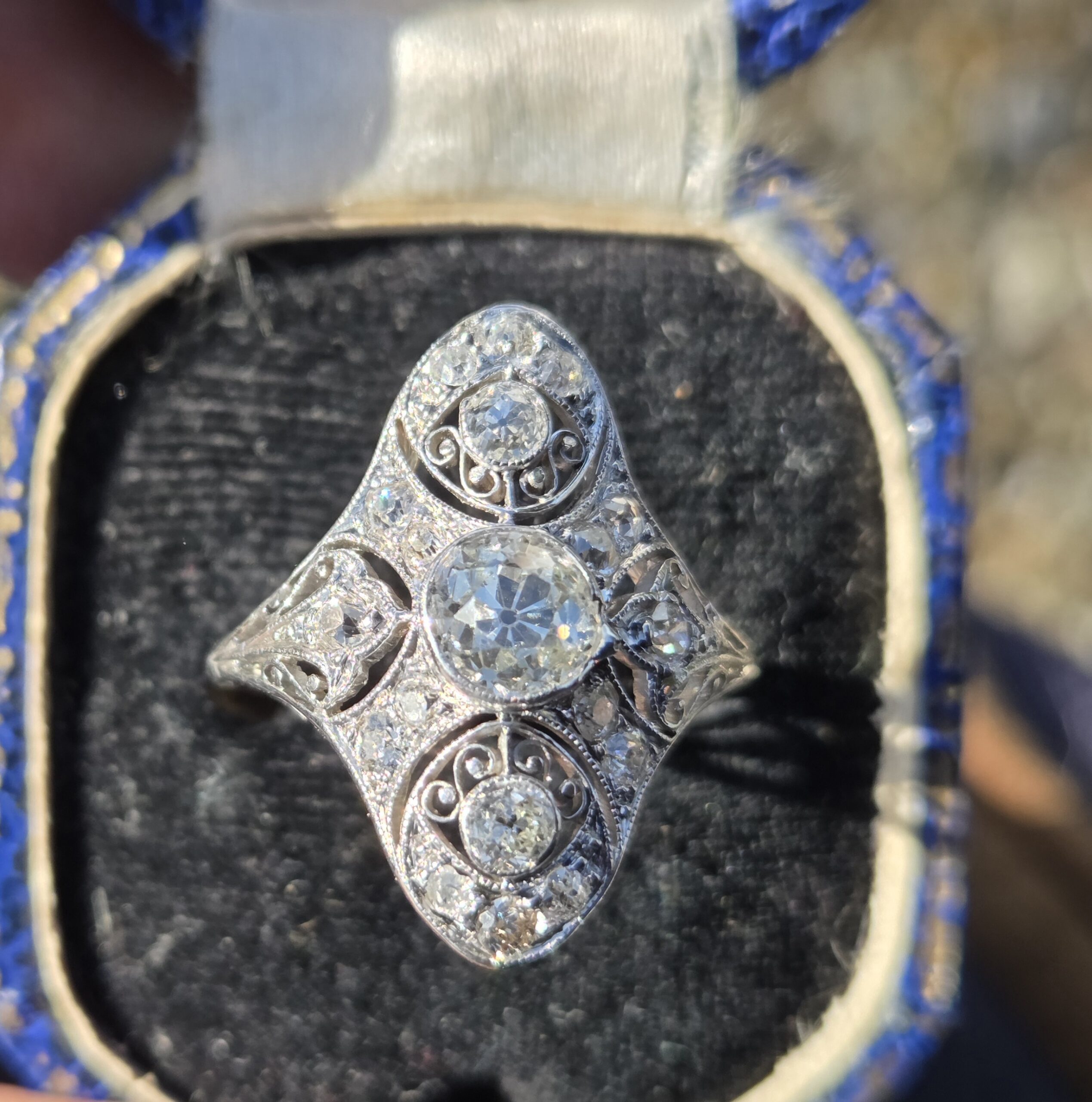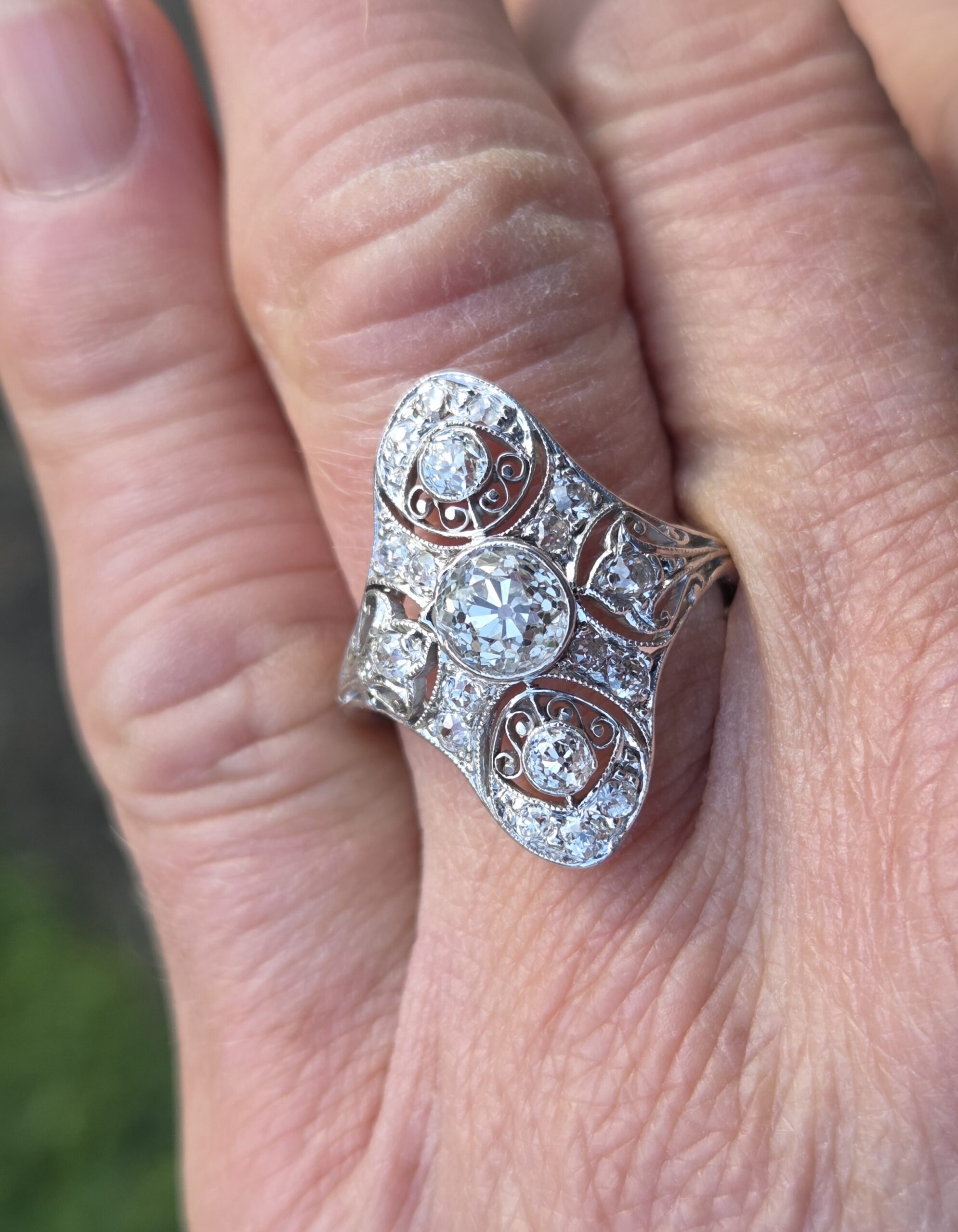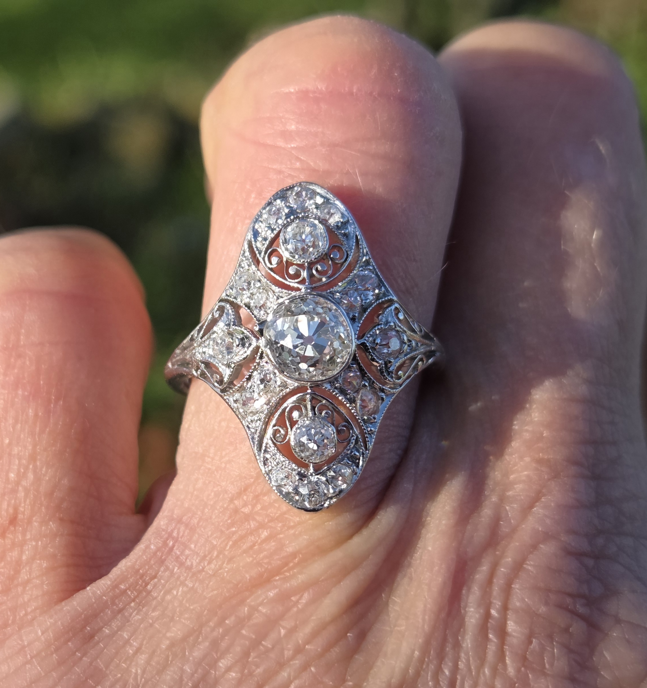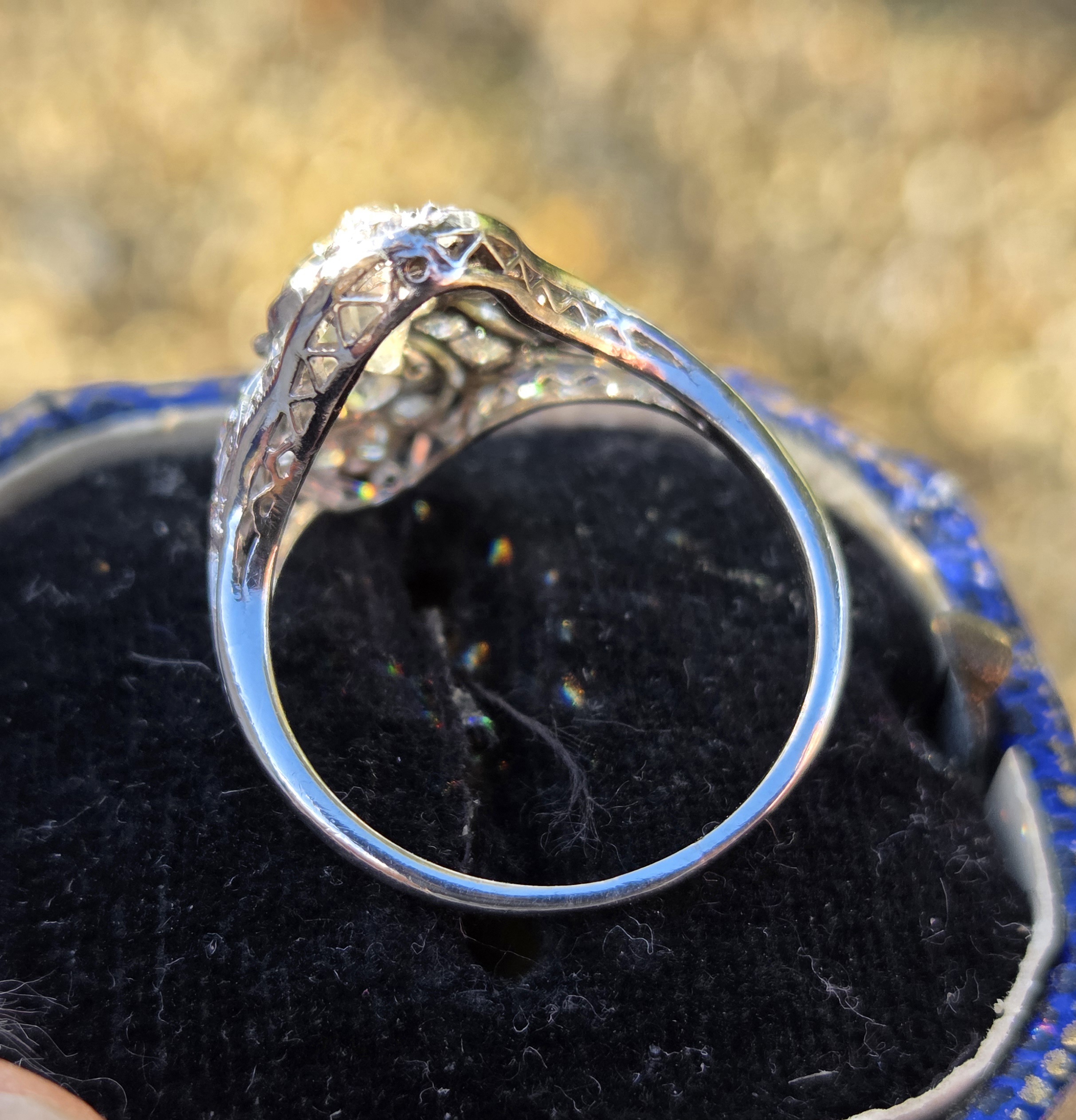 An exceptional old cut diamond to the centre of approximately 3/4 ct and lovely further old cuts of approximately 10 down to 3 points each, an incredible art deco period diamond cluster ring, It is set with exceptionally white clean sparkly diamonds.