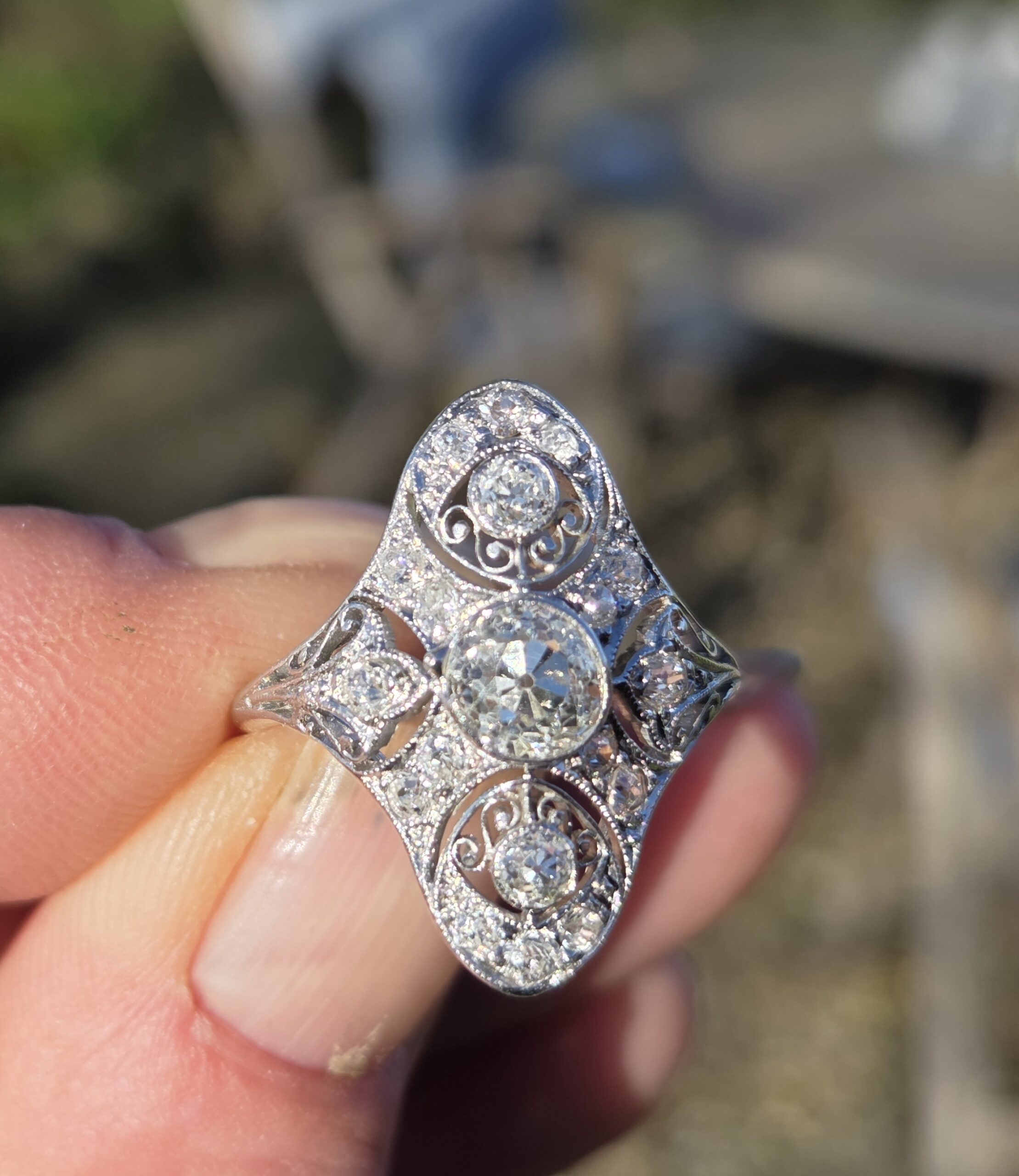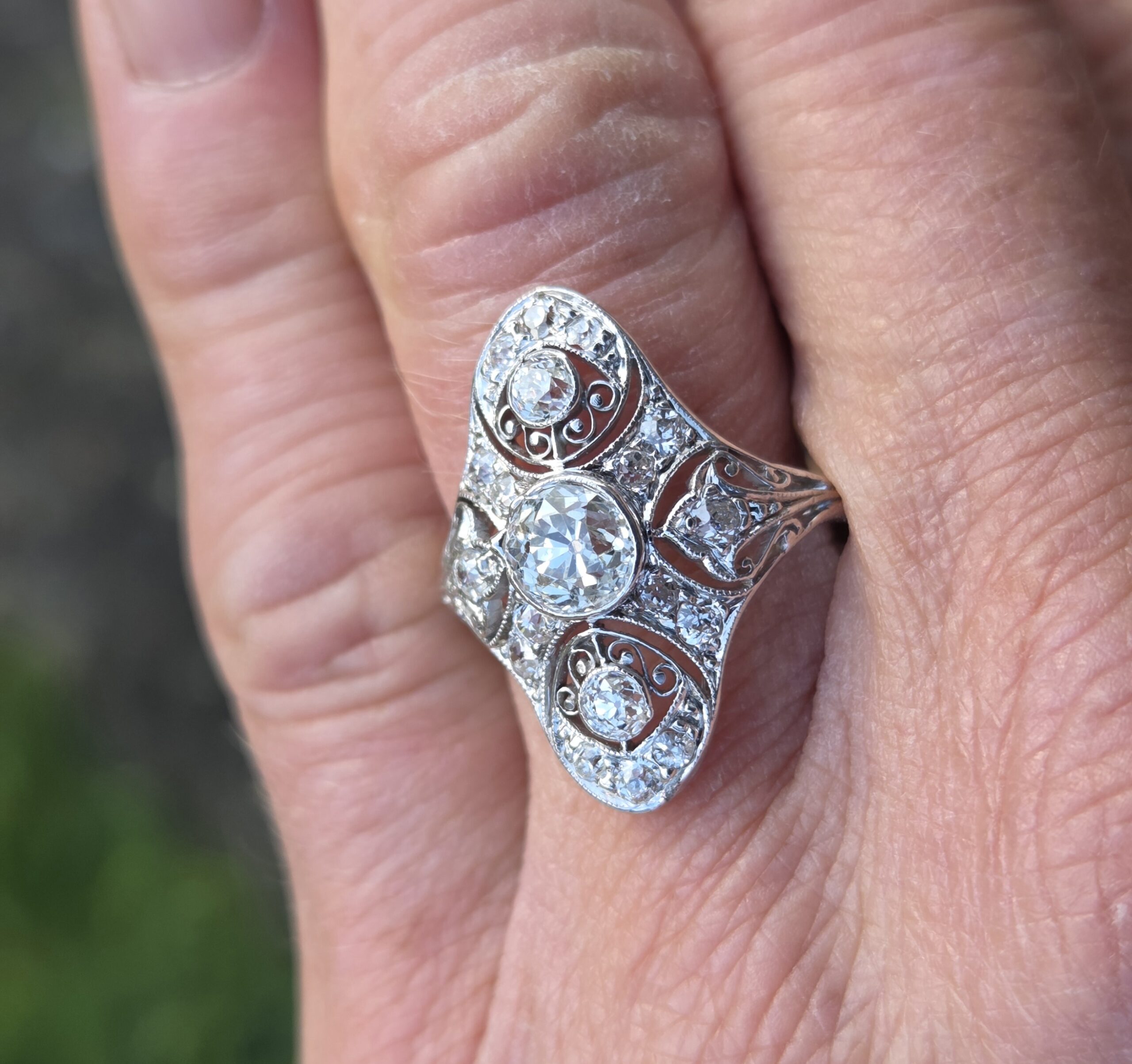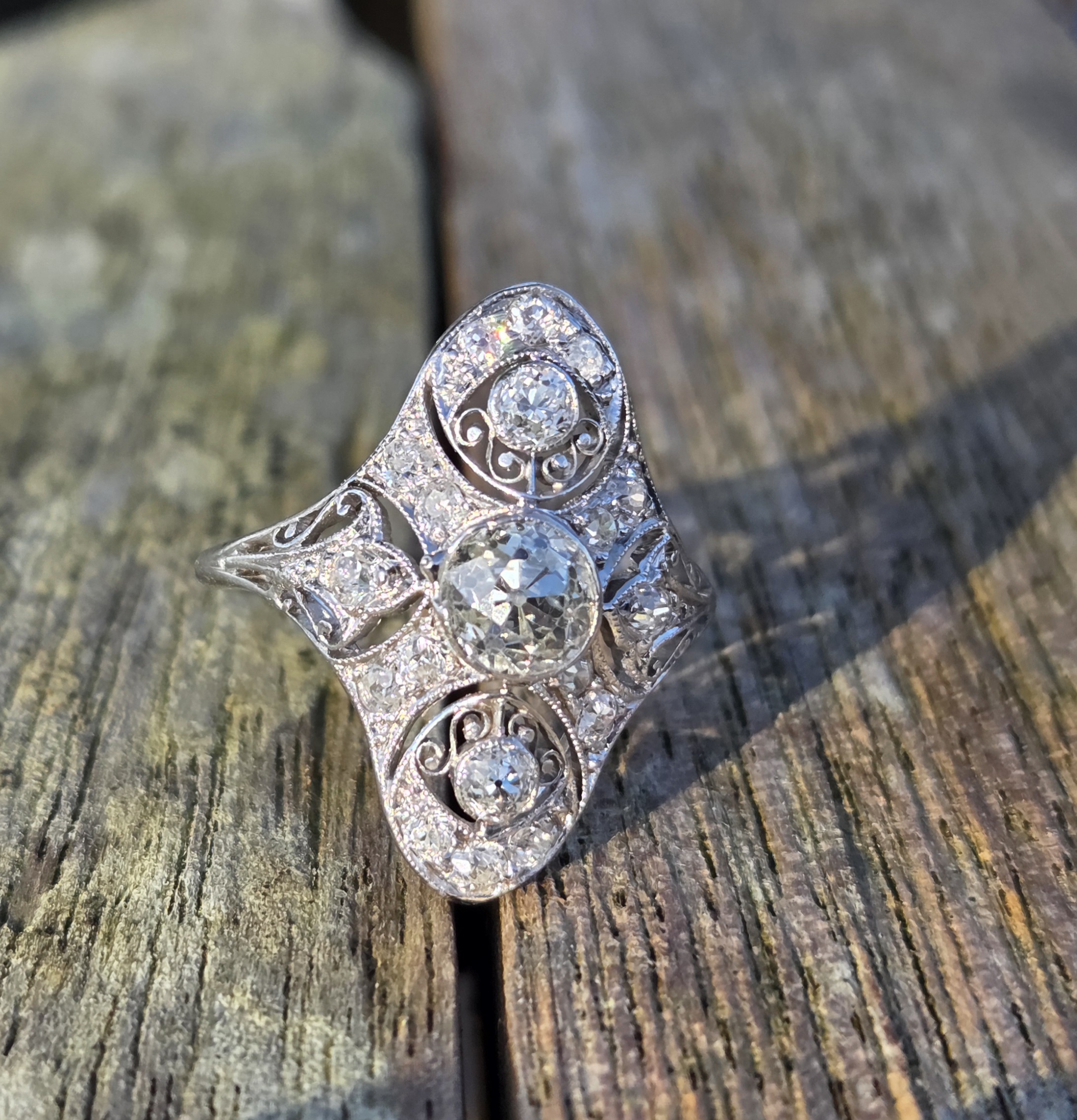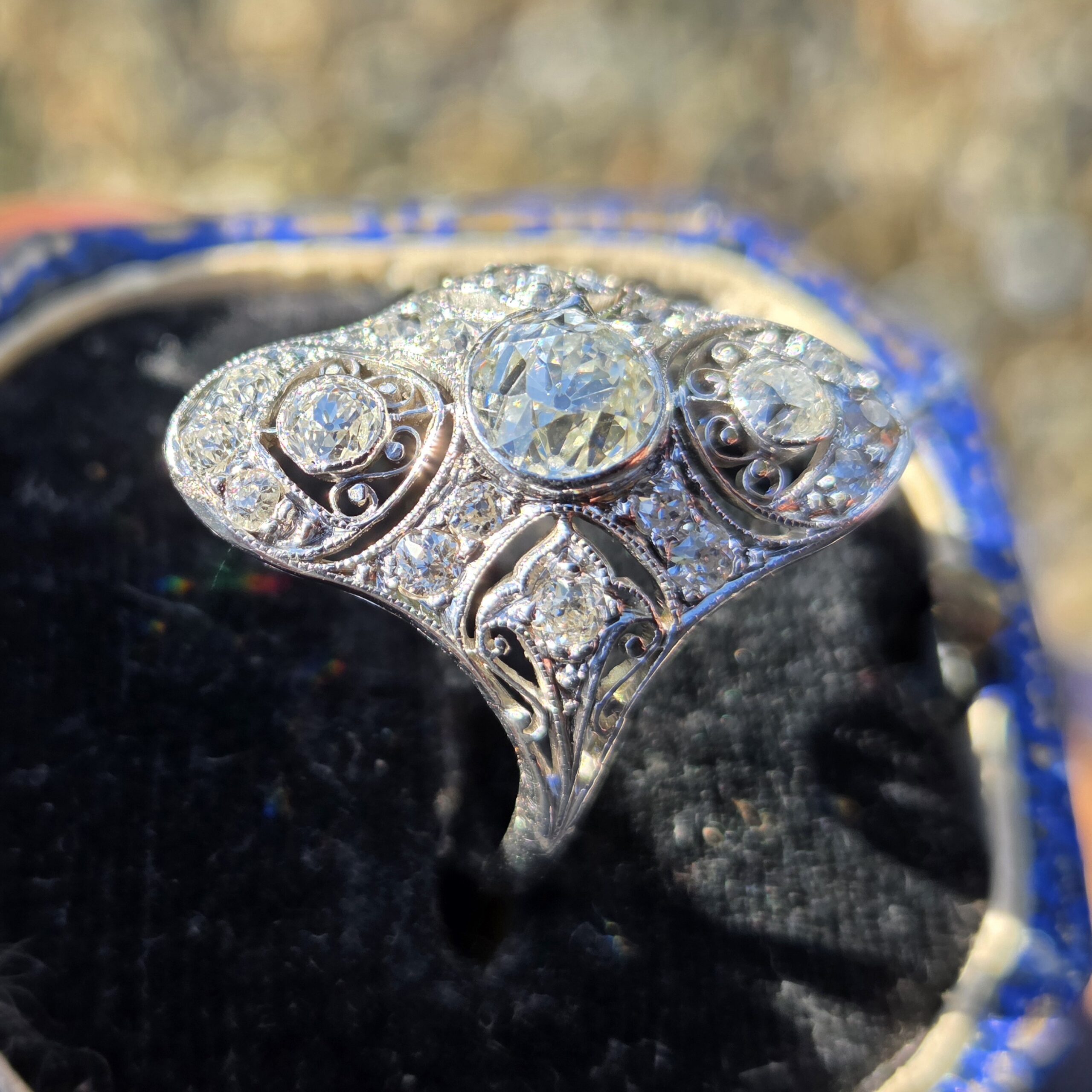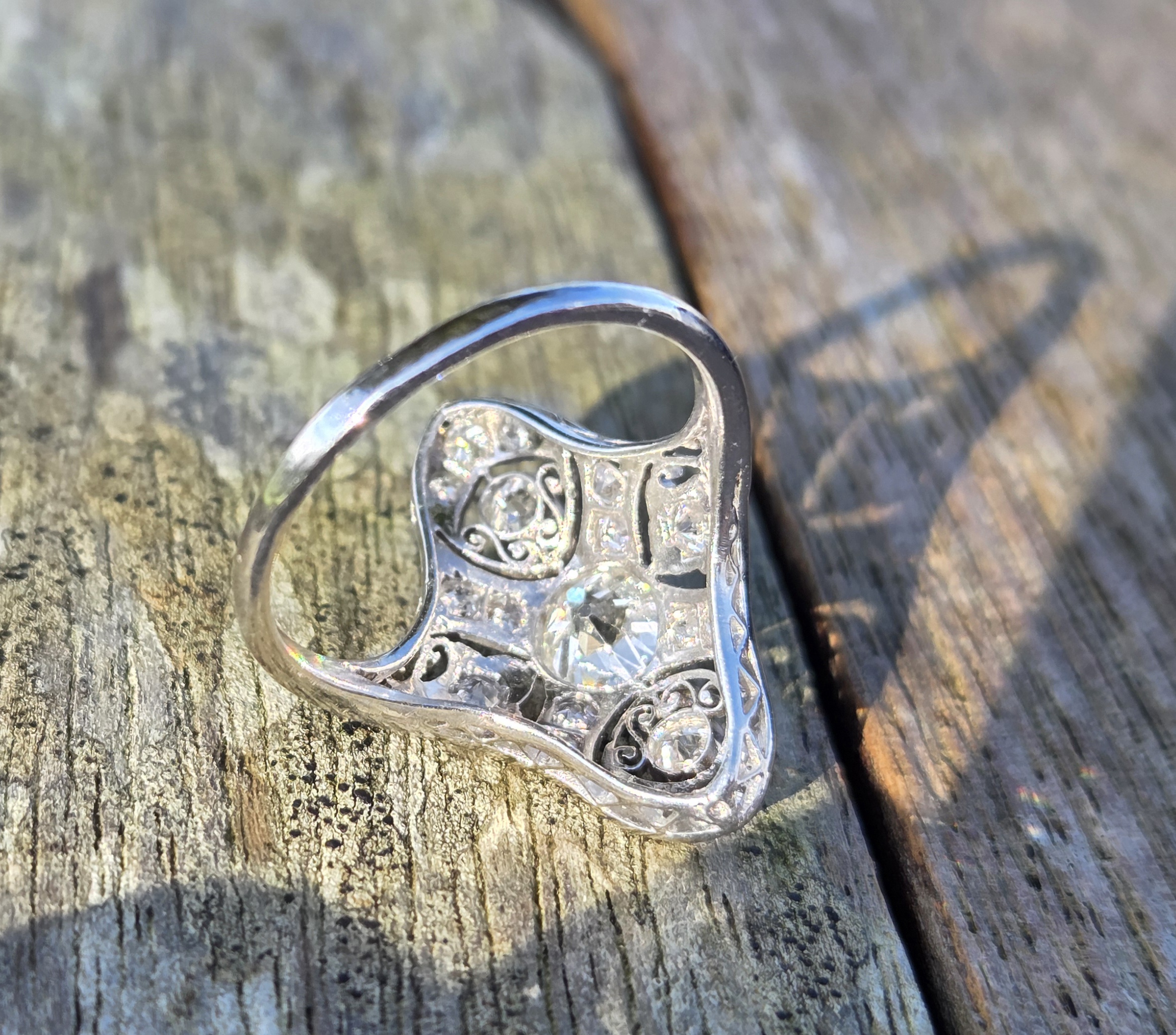 An exceptional old cut diamond to the centre of approximately 3/4 ct and lovely further old cuts of approximately 10 down to 3 points each, an incredible art deco period diamond cluster ring, It is set with exceptionally white clean sparkly diamonds.