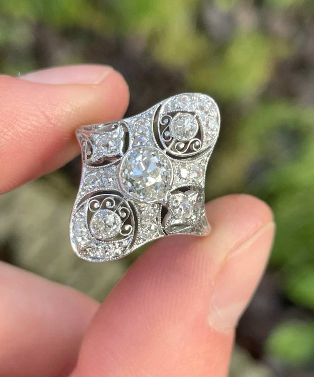 Please find for sale a fine 18 ct old old cut diamond art deco period cluster/panel ring