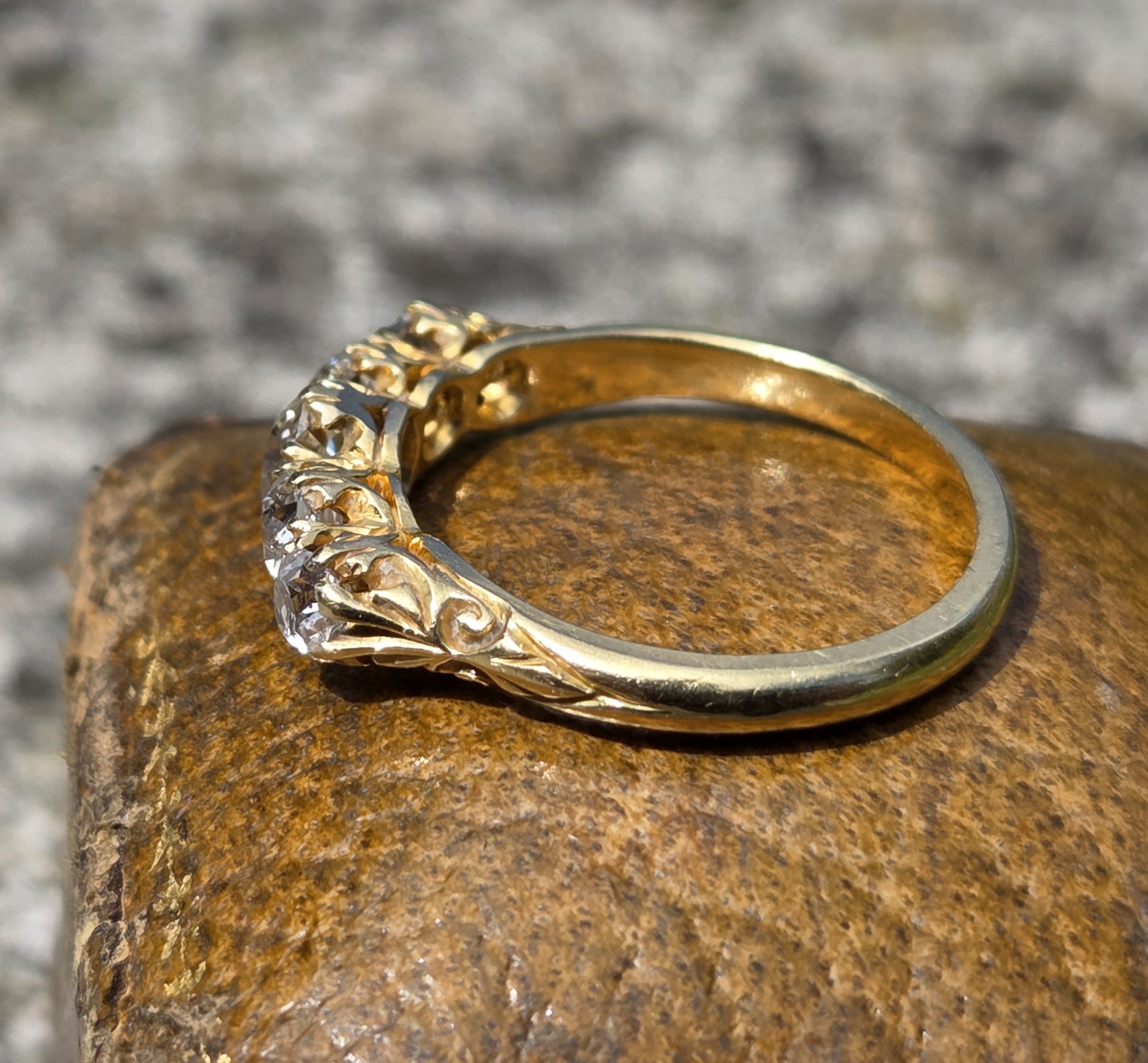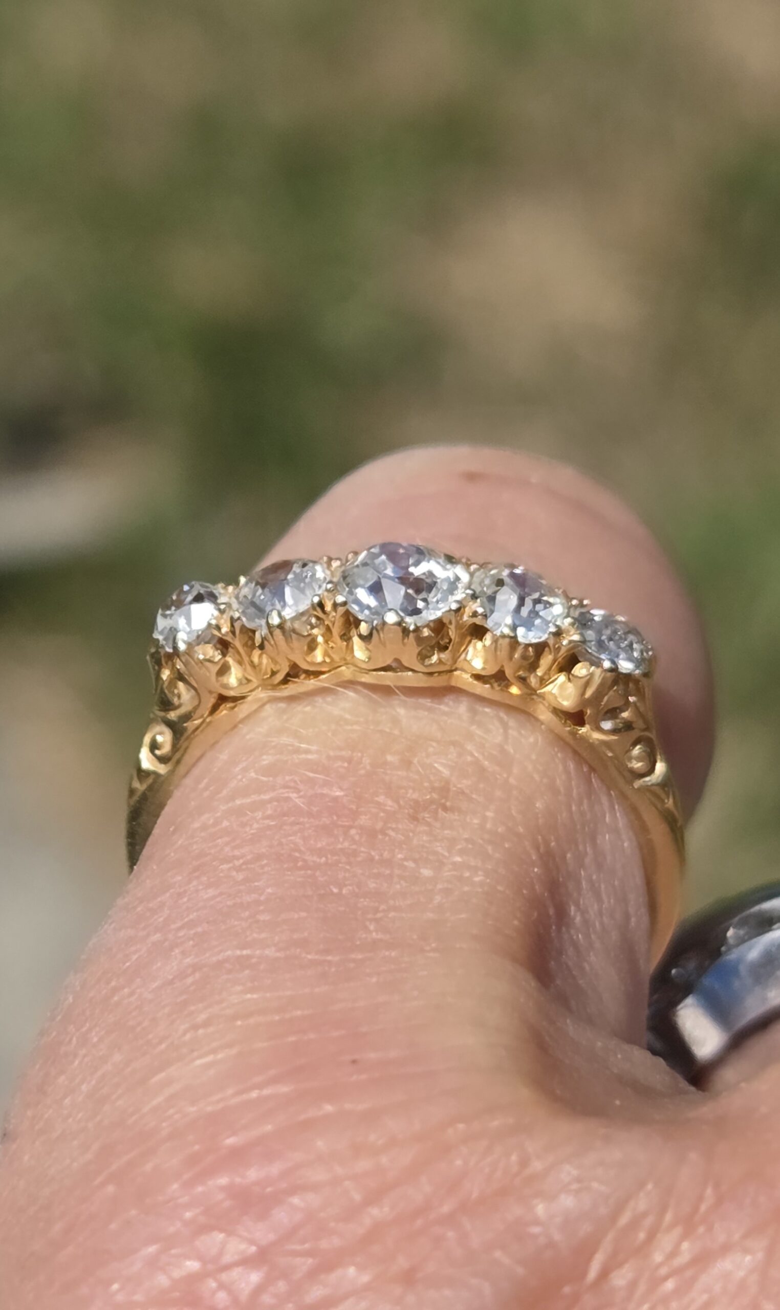 Victorian carved claw 5 stone diamond ring with incredibly white, well cut Old diamonds.