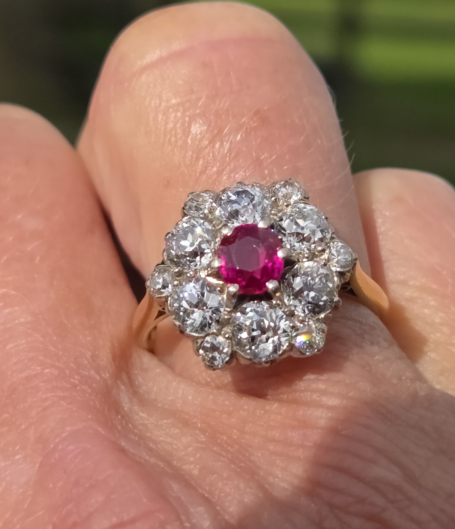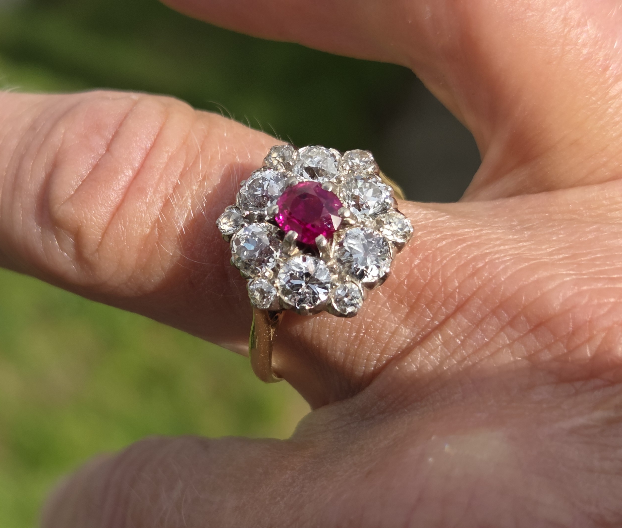 Surrounding this gorgeous Burma ruby are 6 large old mine cuts, each 5mm, estimated at 0.40ct each.