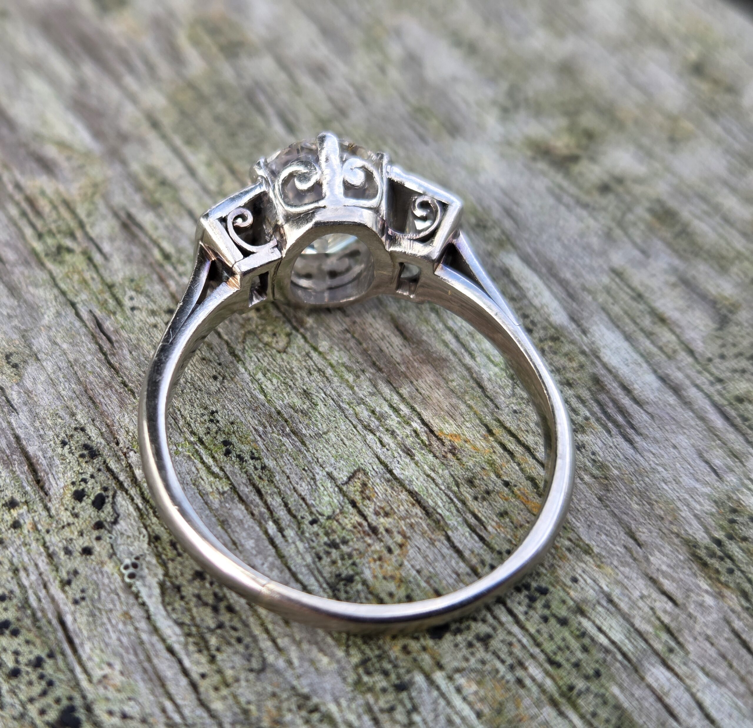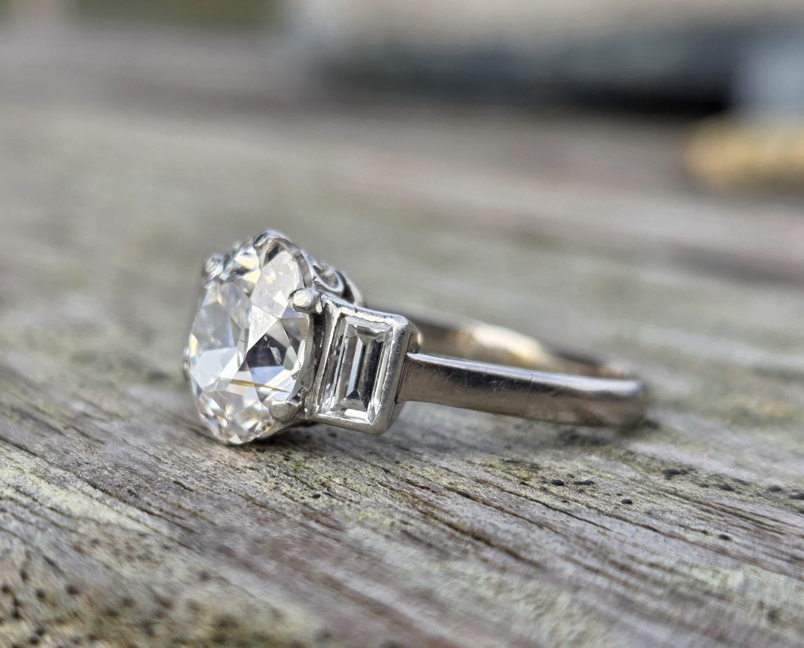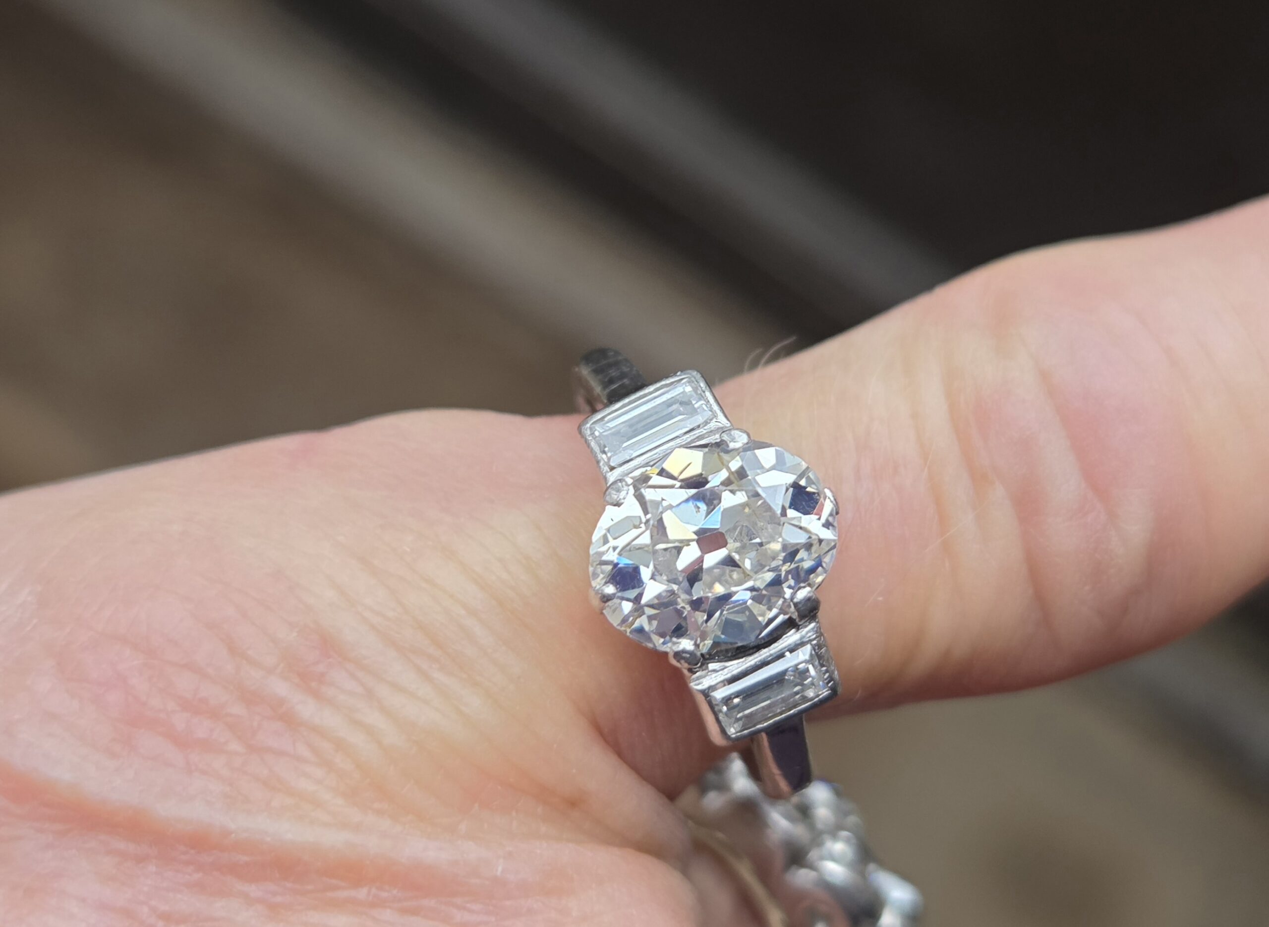 Platinum set in a lovely low profile Deco mount with diamond single baguettes to the shoulders.