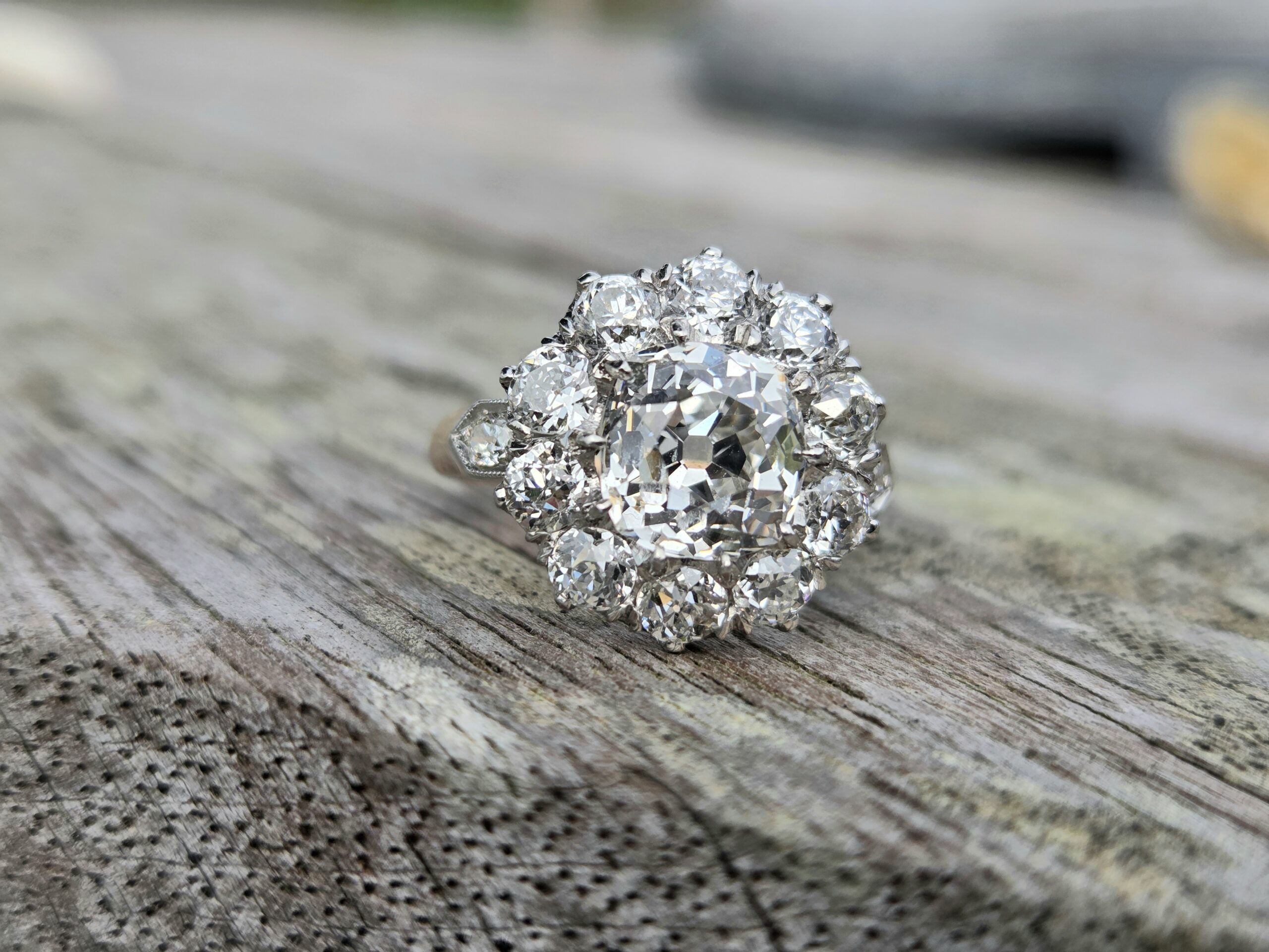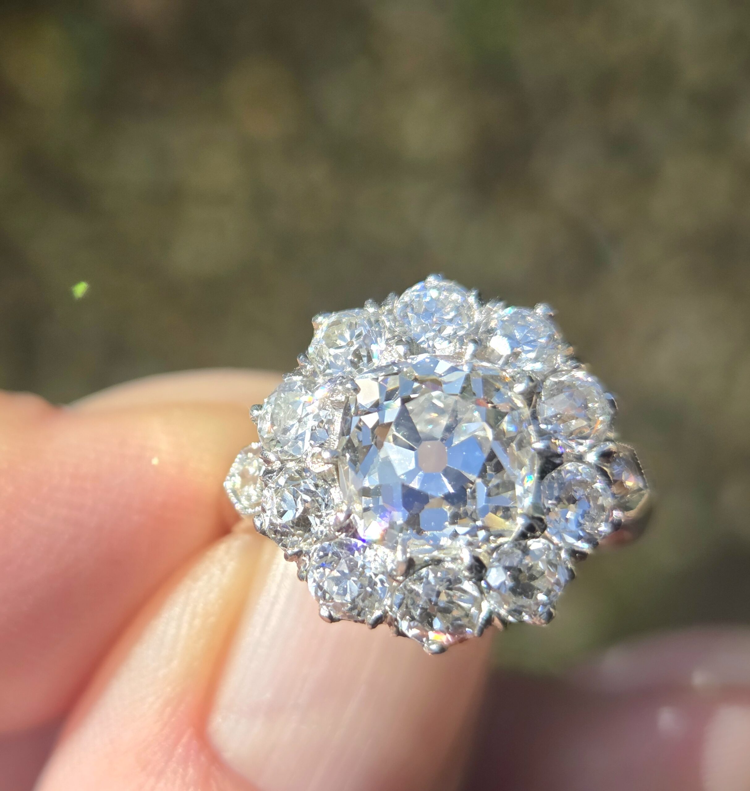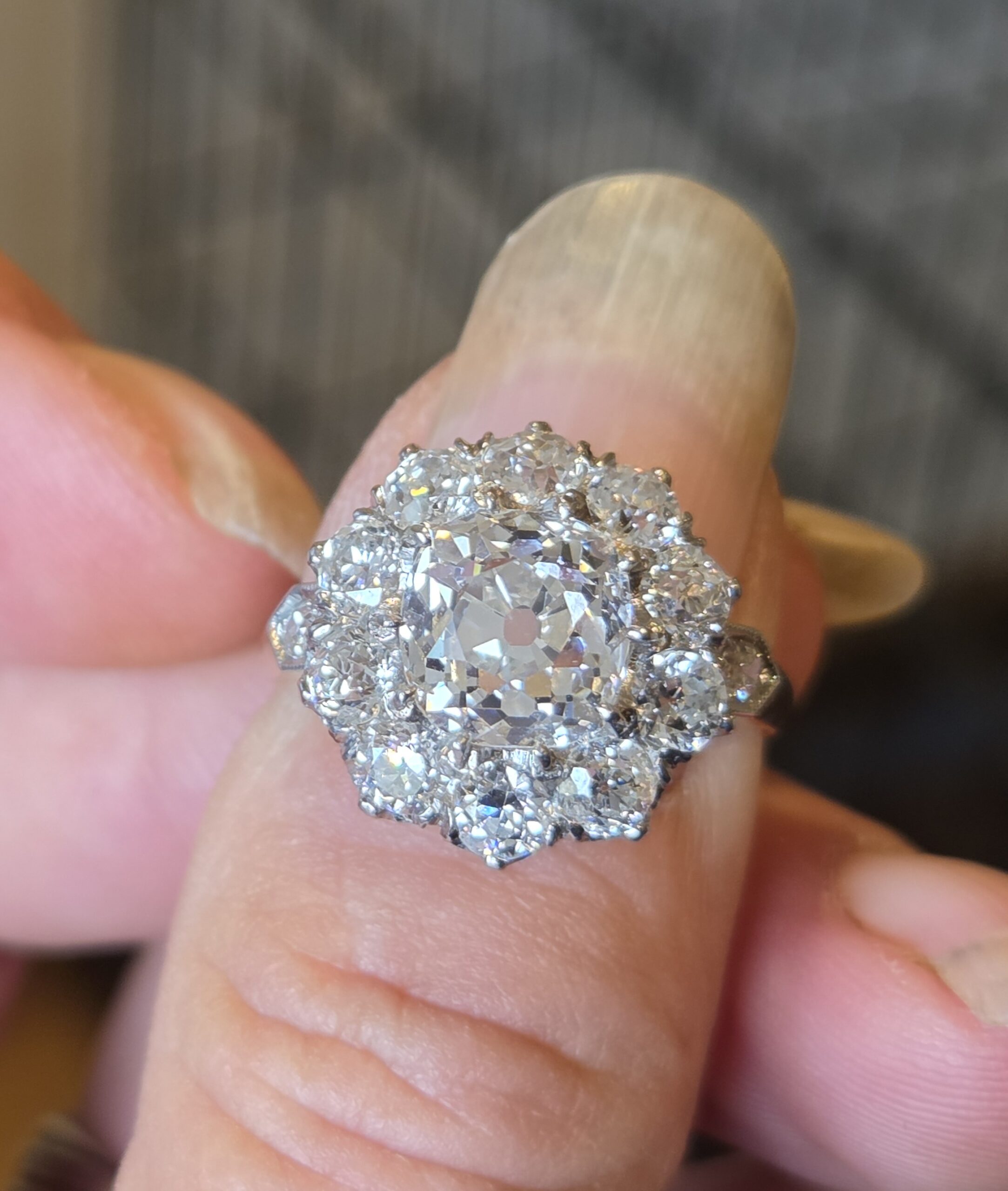 Surrounding this exceptional diamond are 10 gorgeous plump old mine cuts each measuring 4mm. 0.25ct each! F/G colour VS clarity.