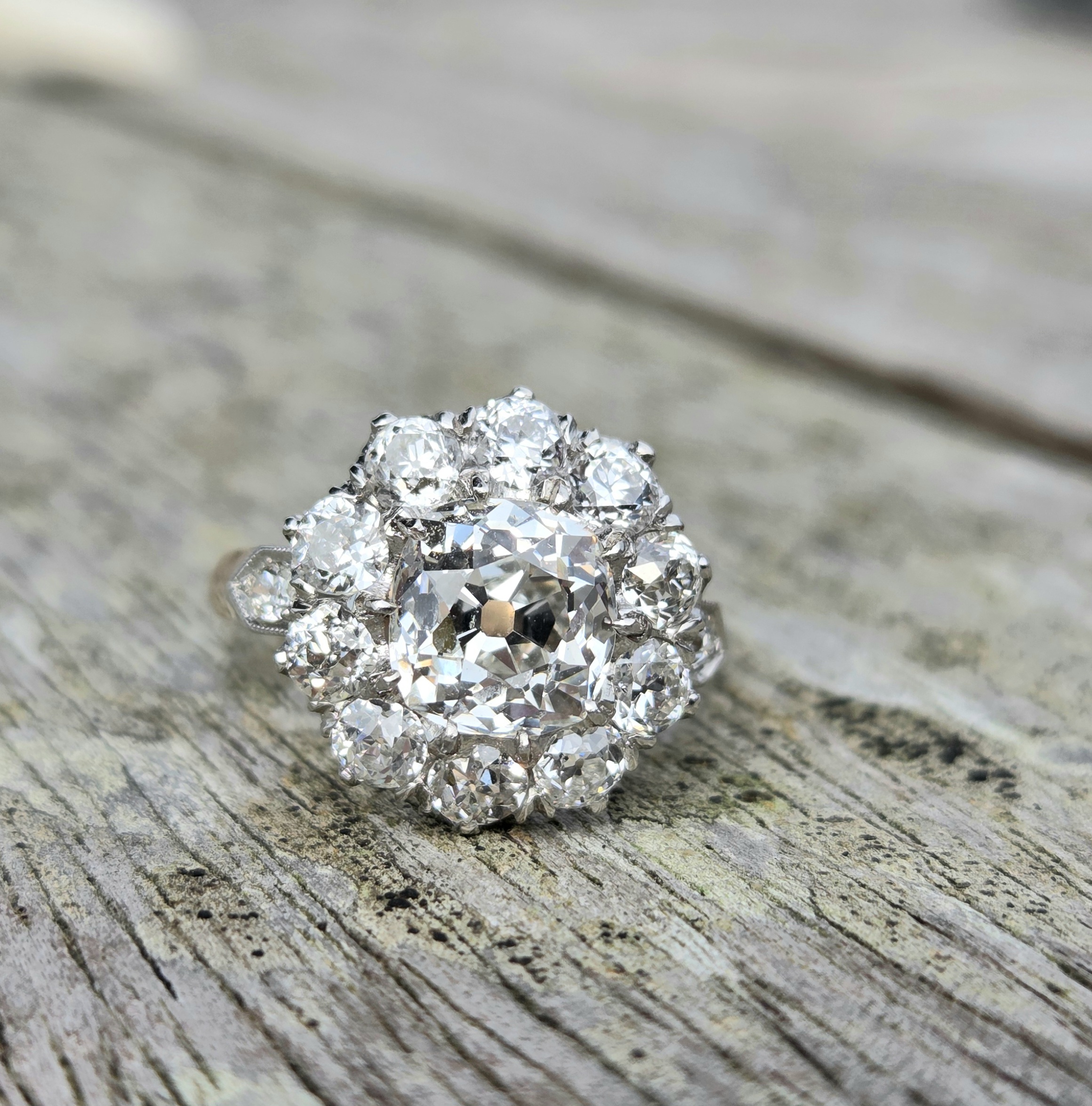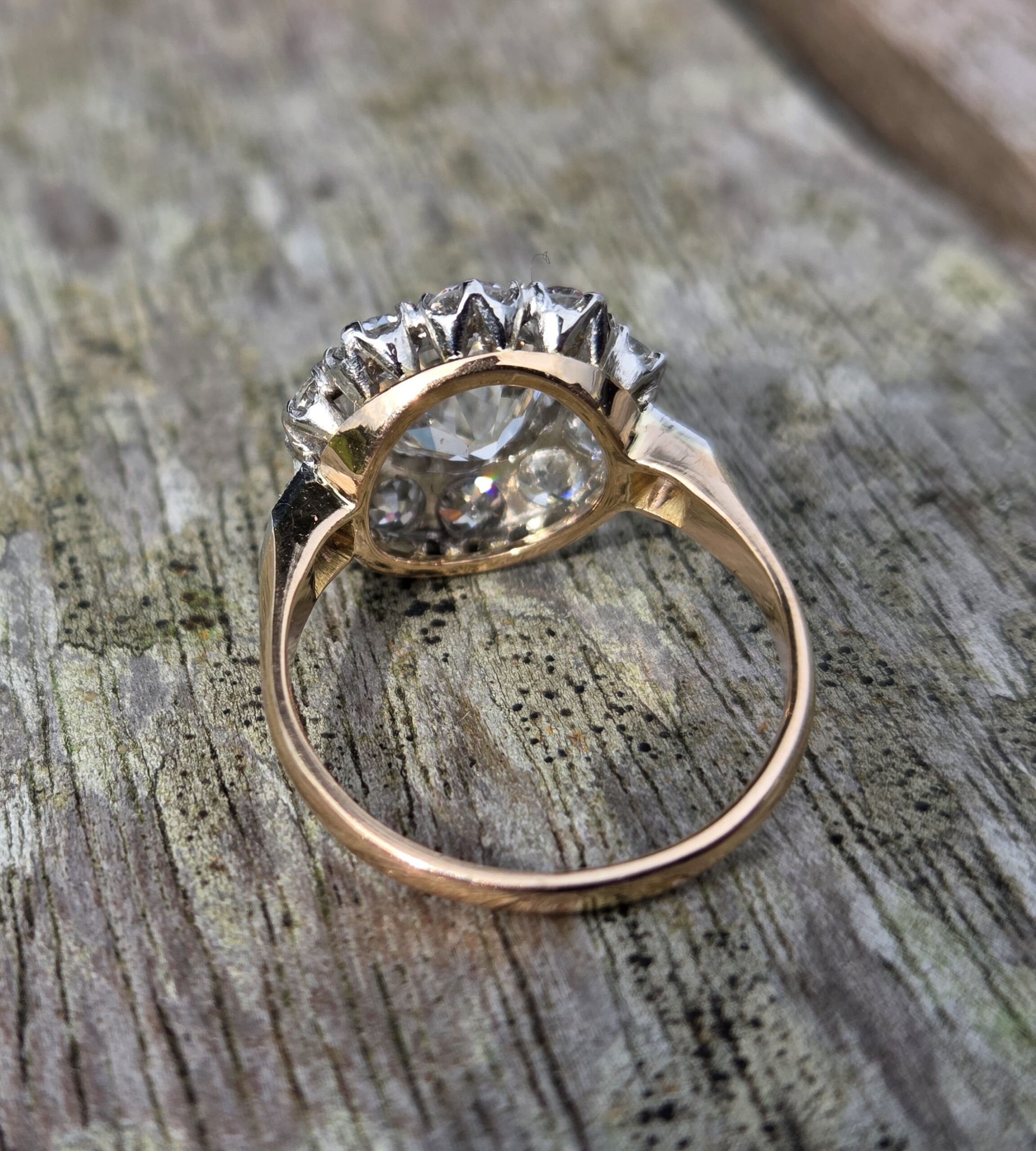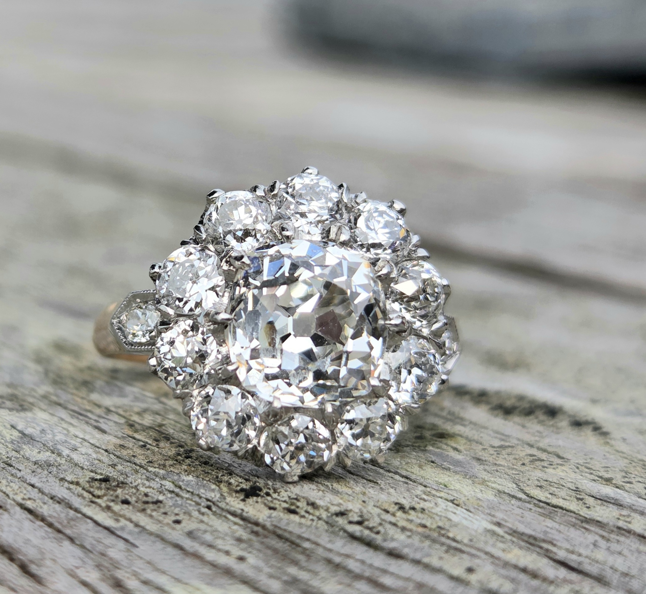 Surrounding this exceptional diamond are 10 gorgeous plump old mine cuts each measuring 4mm. 0.25ct each! F/G colour VS clarity.