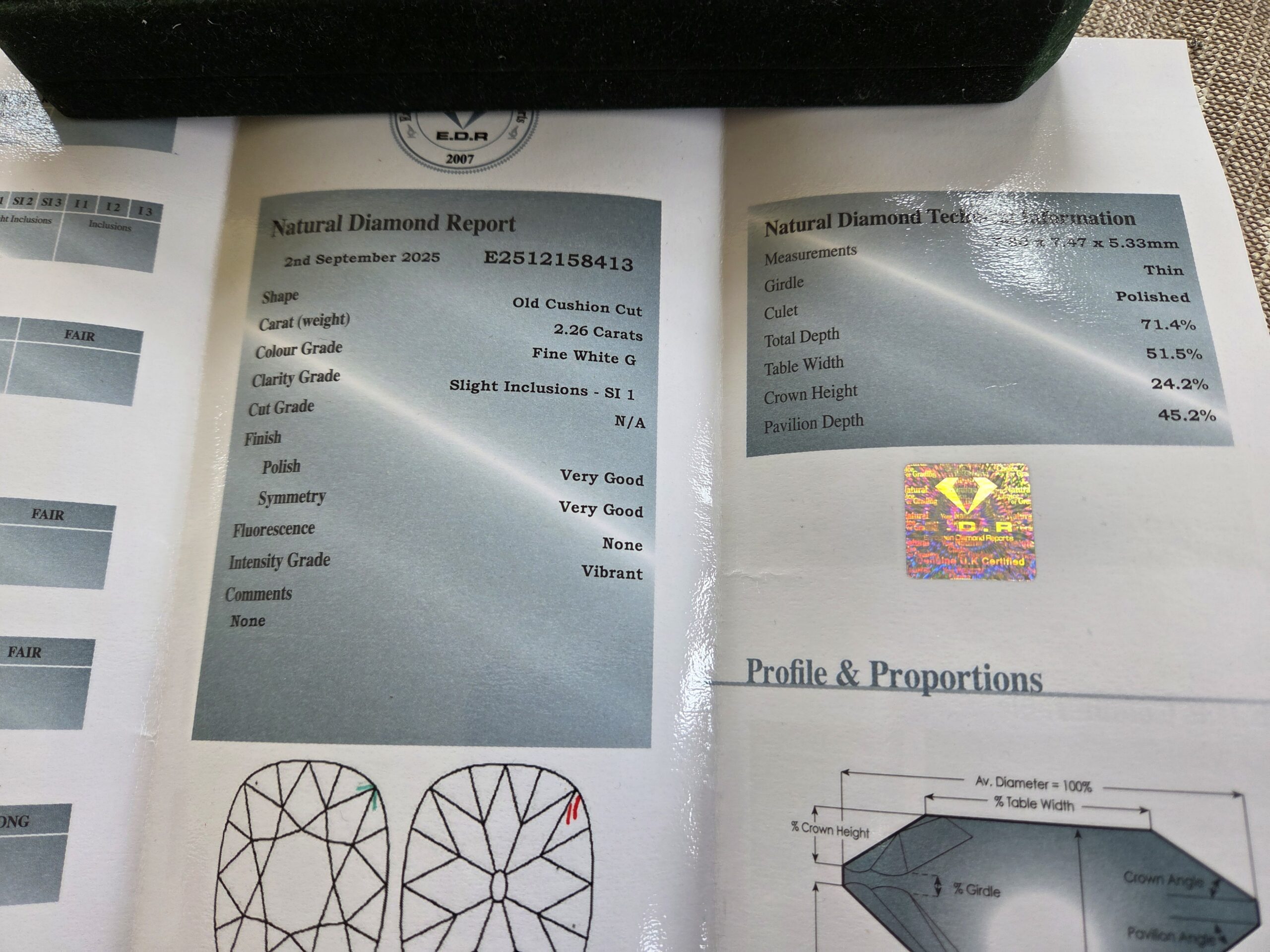 Here we have an exceptional certified Old Cushion Cut 2.25ct stated G colour but in my opinion she is whiter still!!