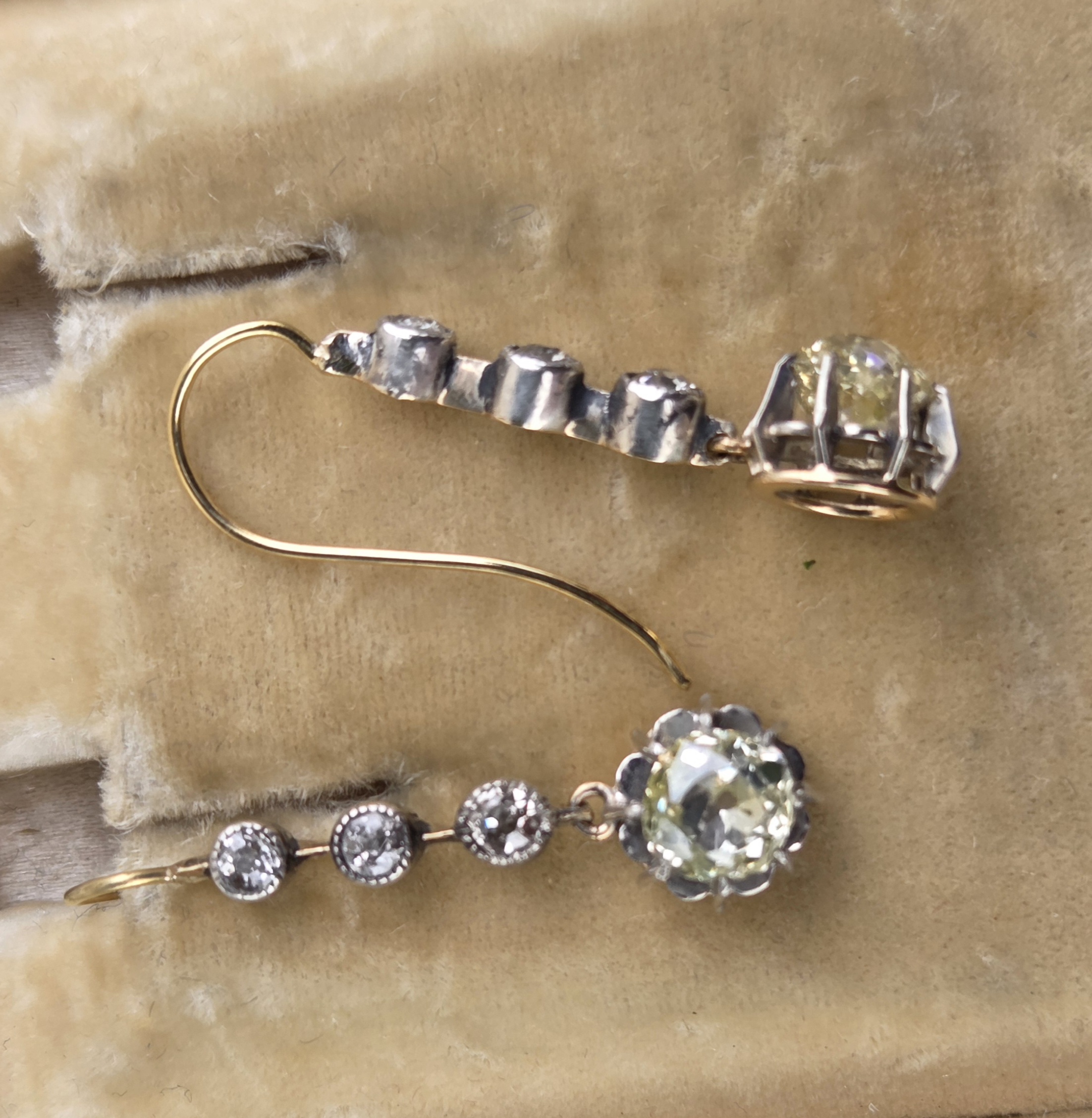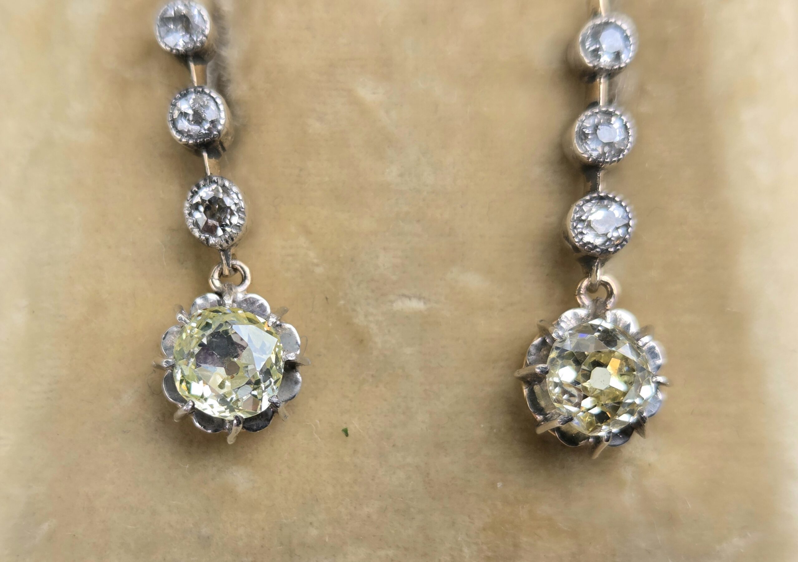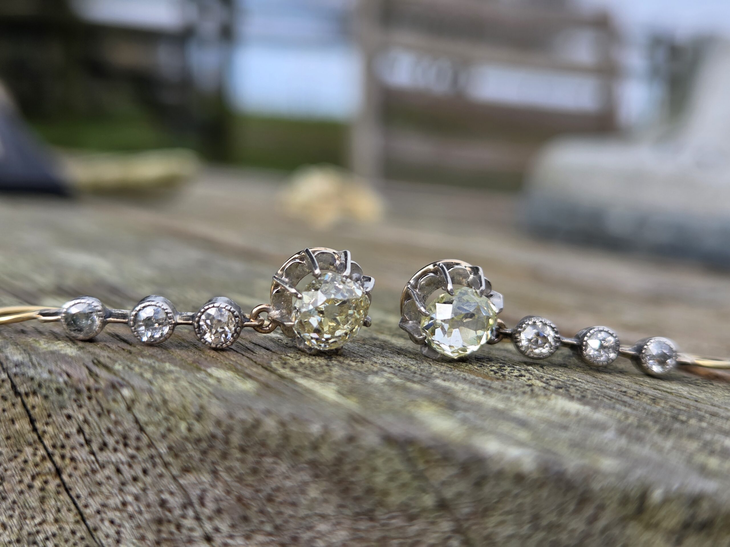 Pale yellow natural old cuts each is 1ct plus 3 top old European cuts milligrain/bezel set above in platinum on yellow gold. Total diamond weight of 2.60ct approx.