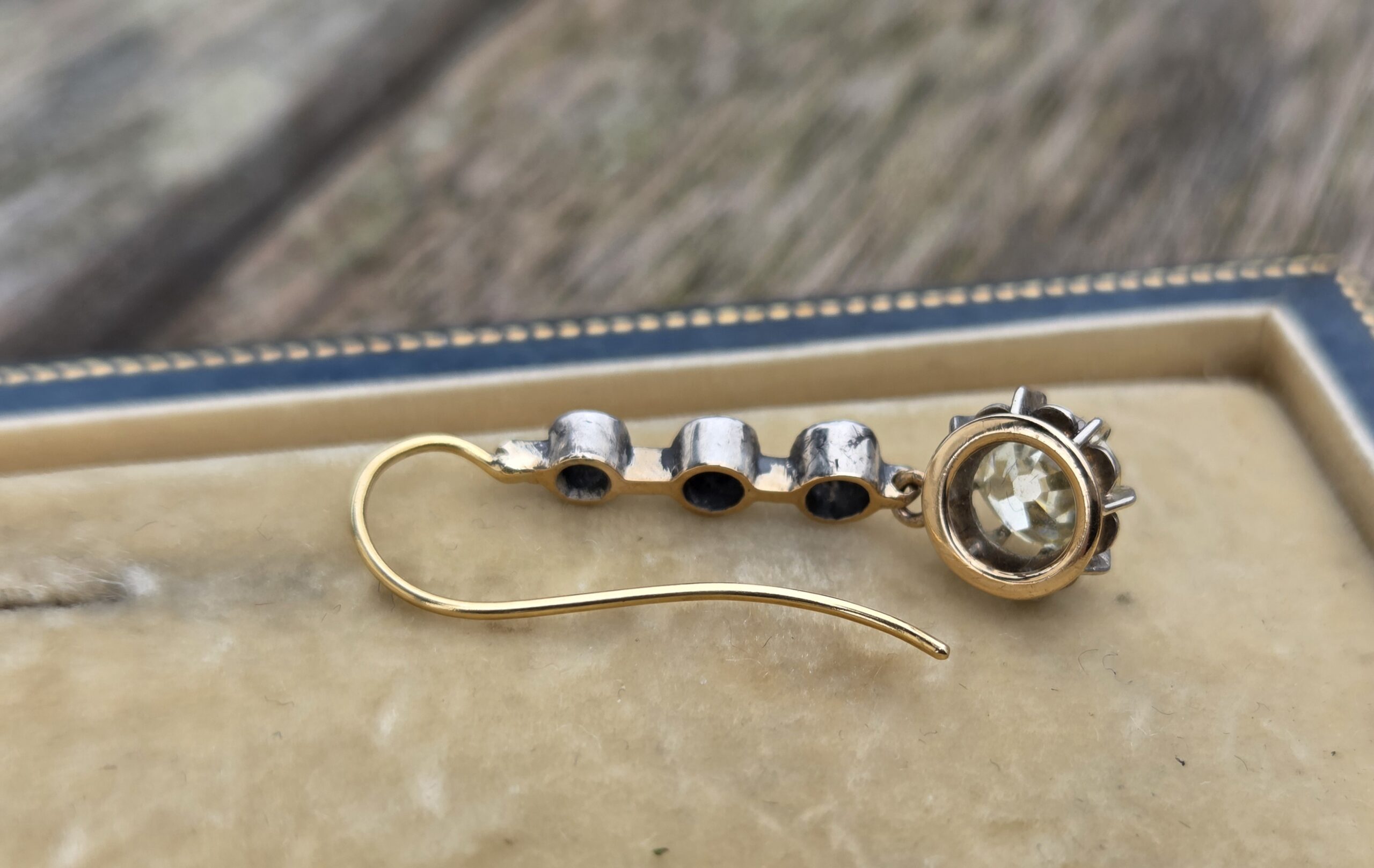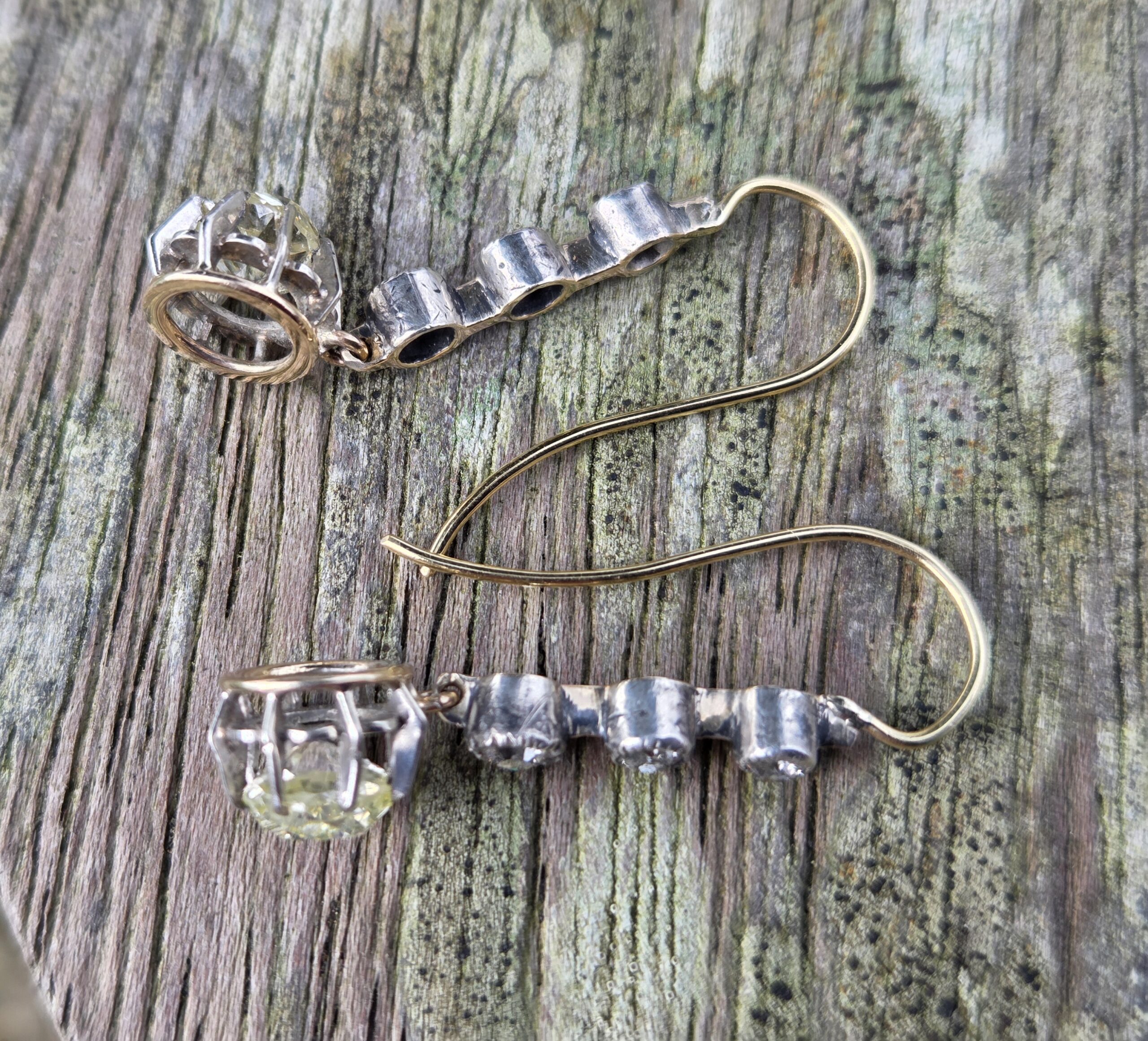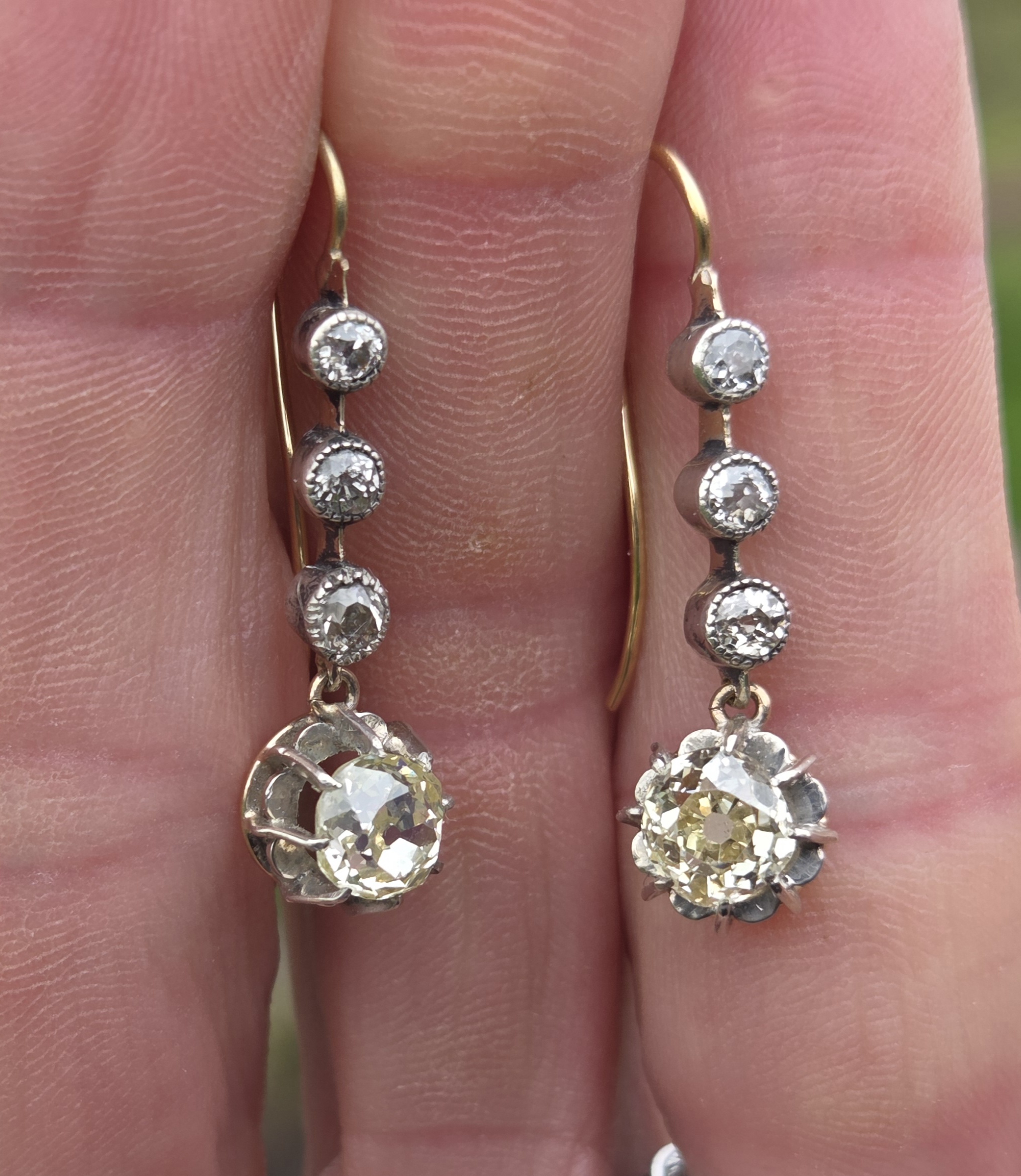 Pale yellow natural old cuts each is 1ct plus 3 top old European cuts milligrain/bezel set above in platinum on yellow gold. Total diamond weight of 2.60ct approx.
