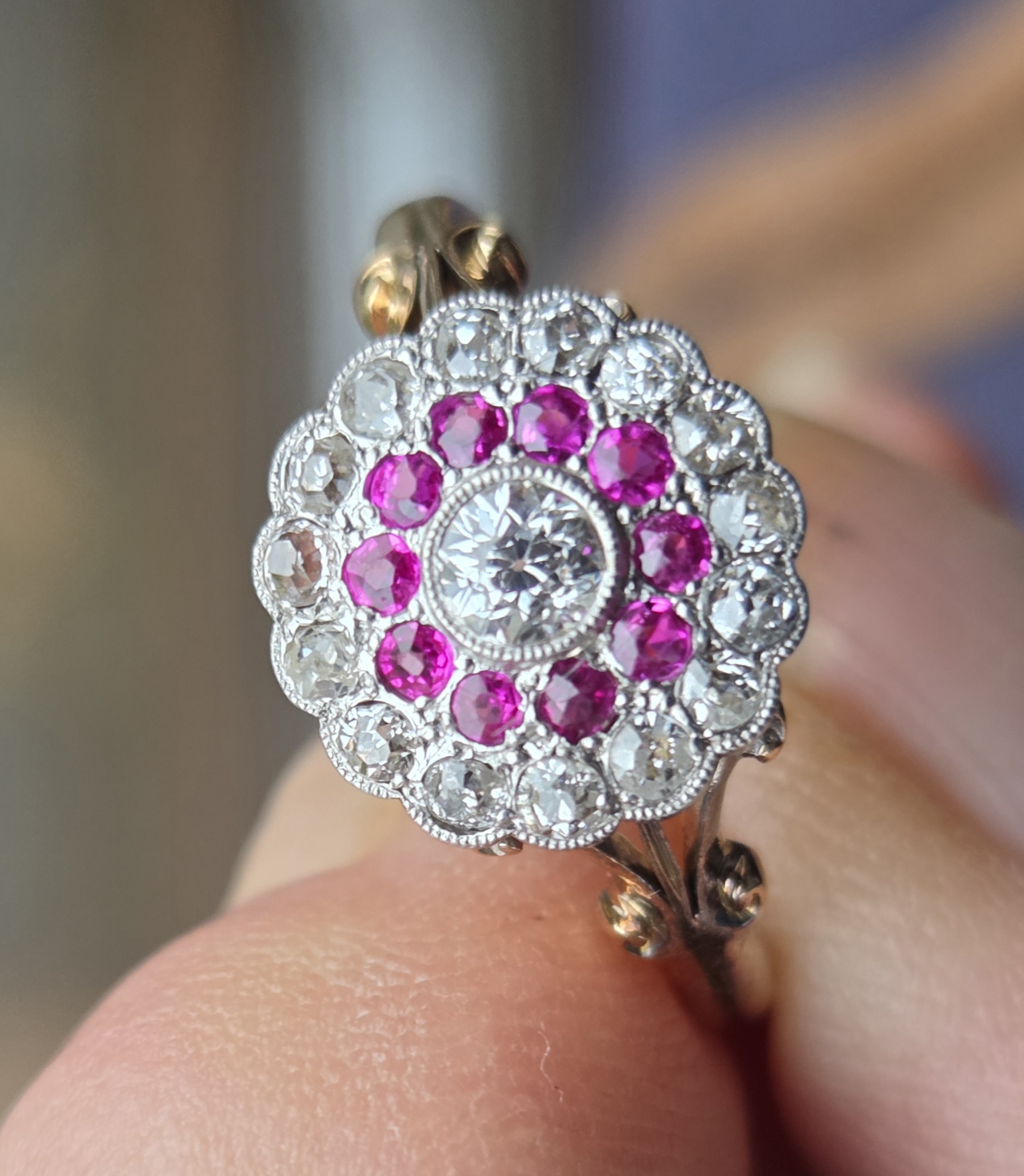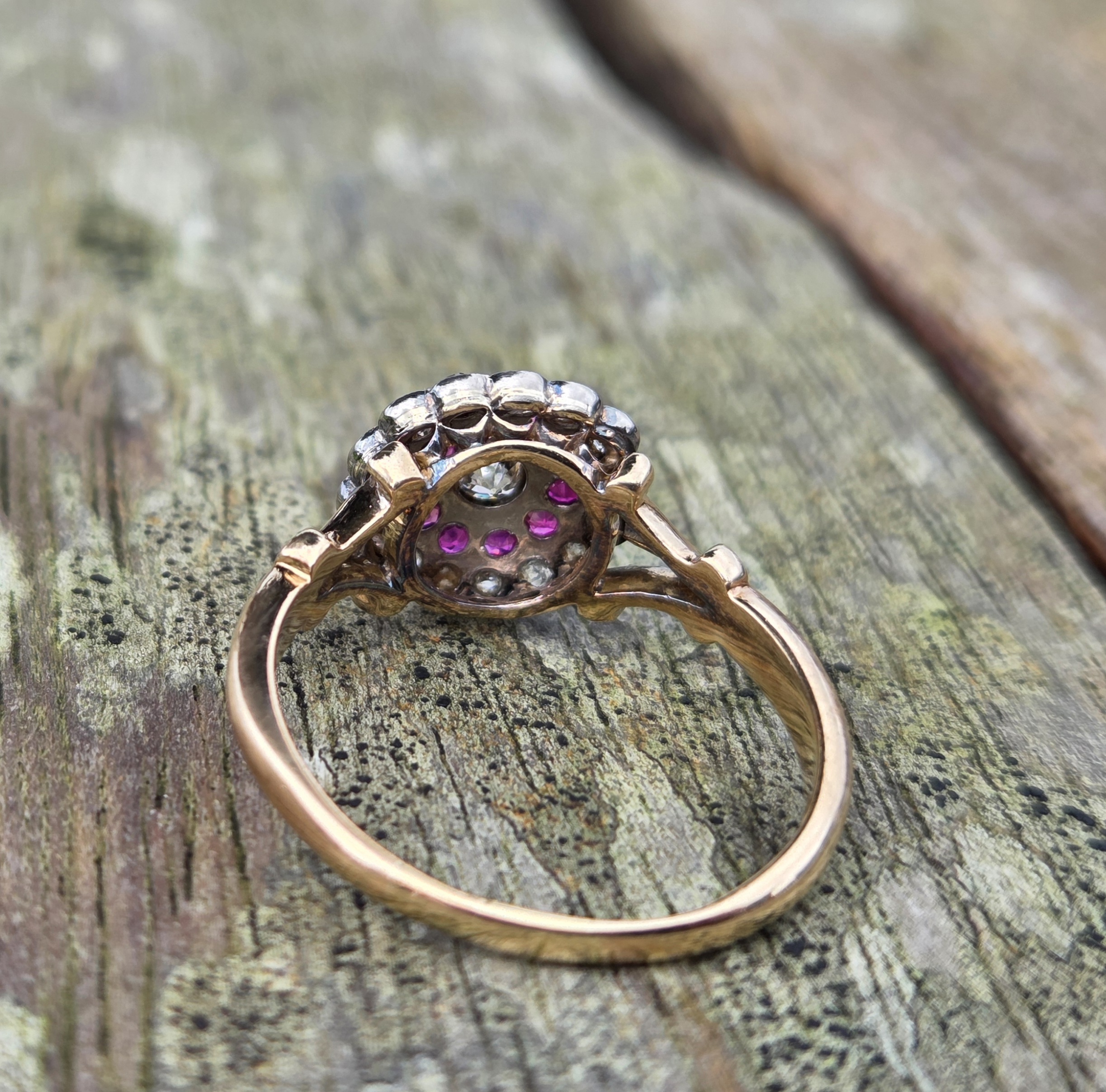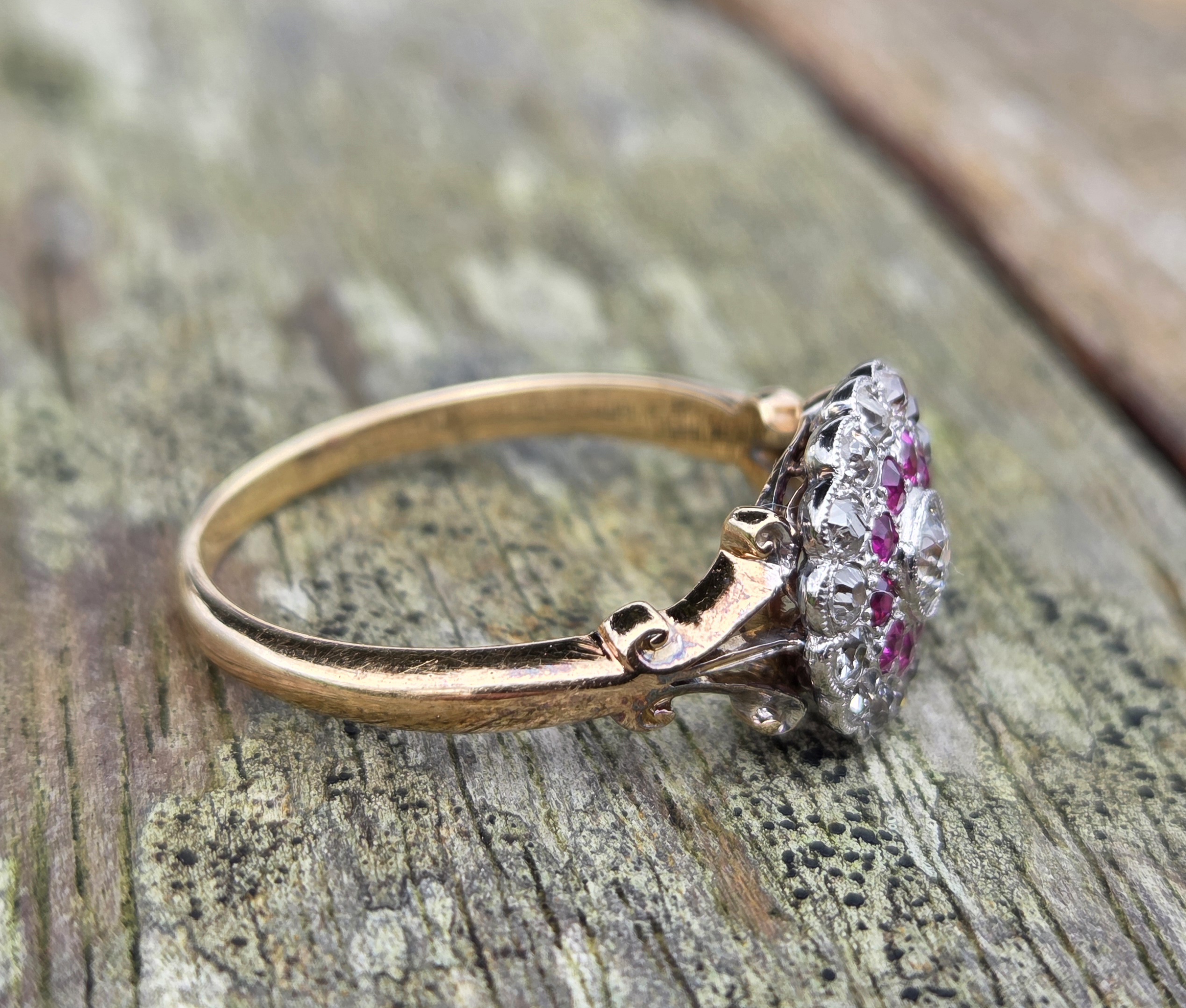 Art Nouveau/Edwardian old cut diamond & natural Ruby cluster ring.