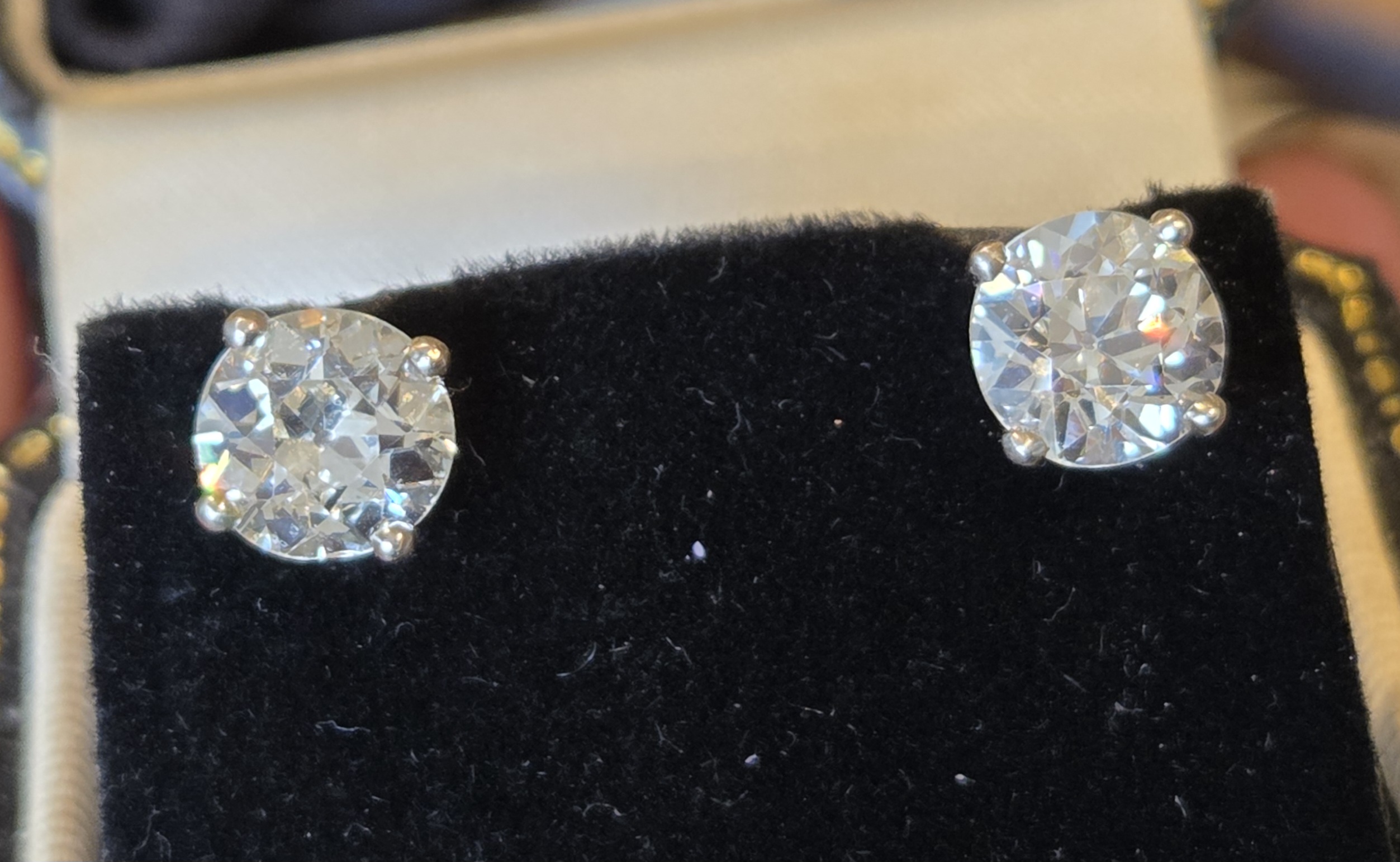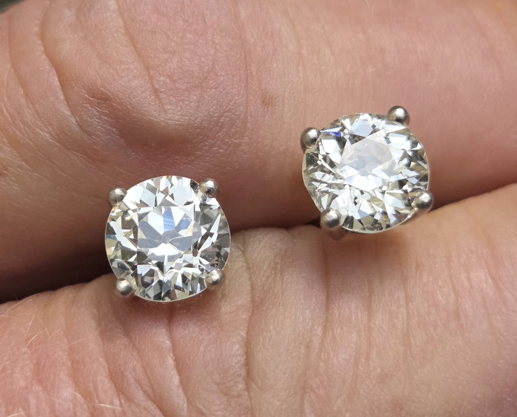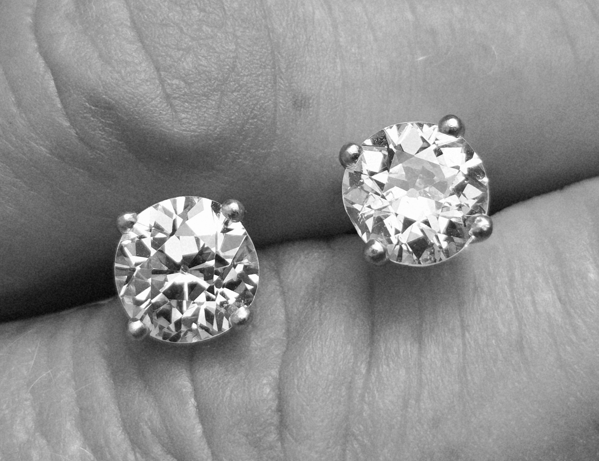 An incredibly rare pair of Old European cut diamonds. So well matched at 7 4mm each. 1.60ct each.
