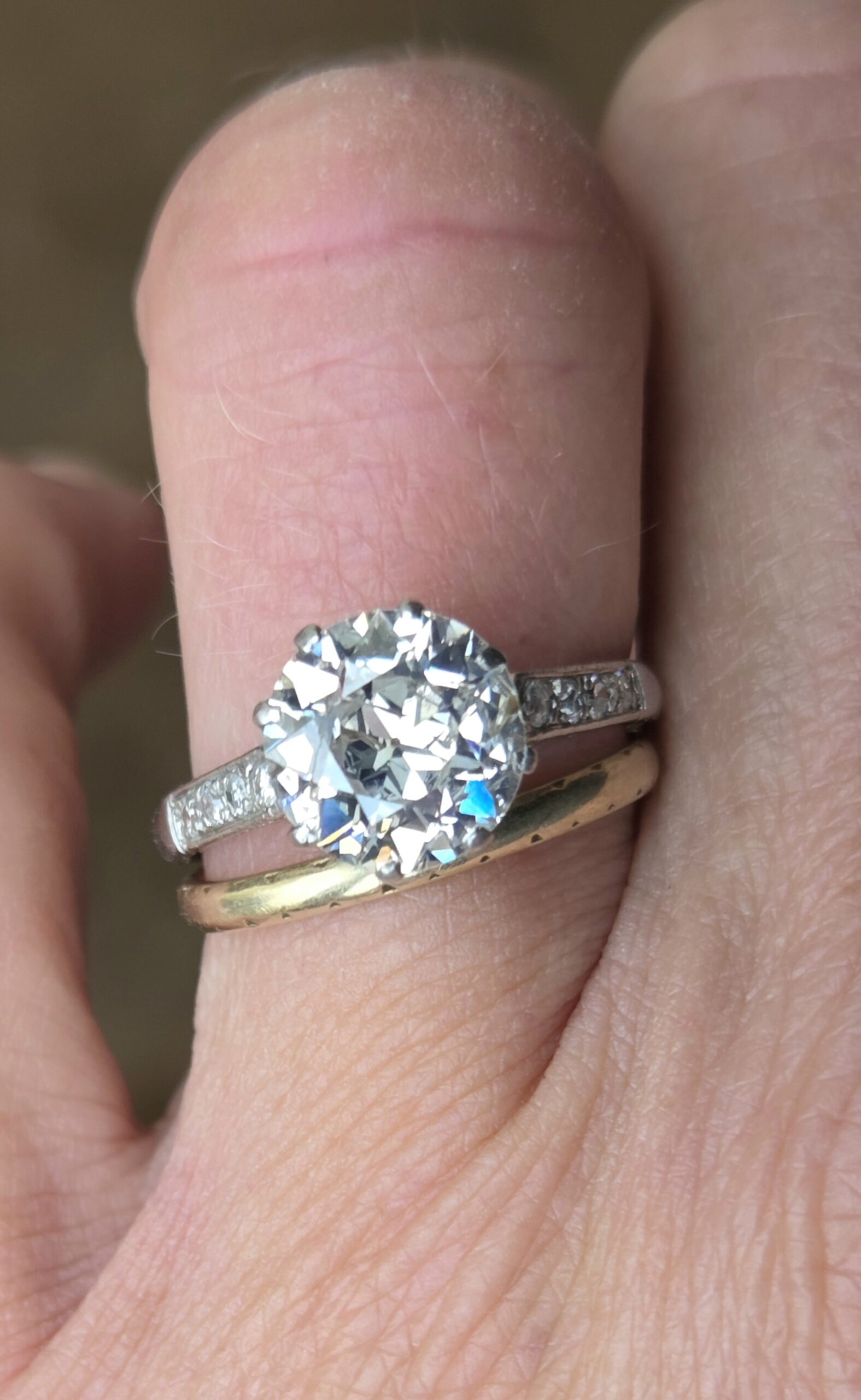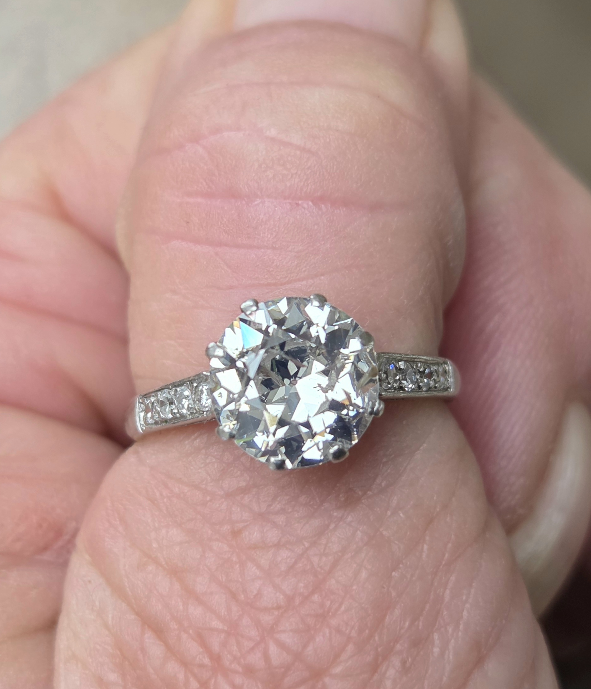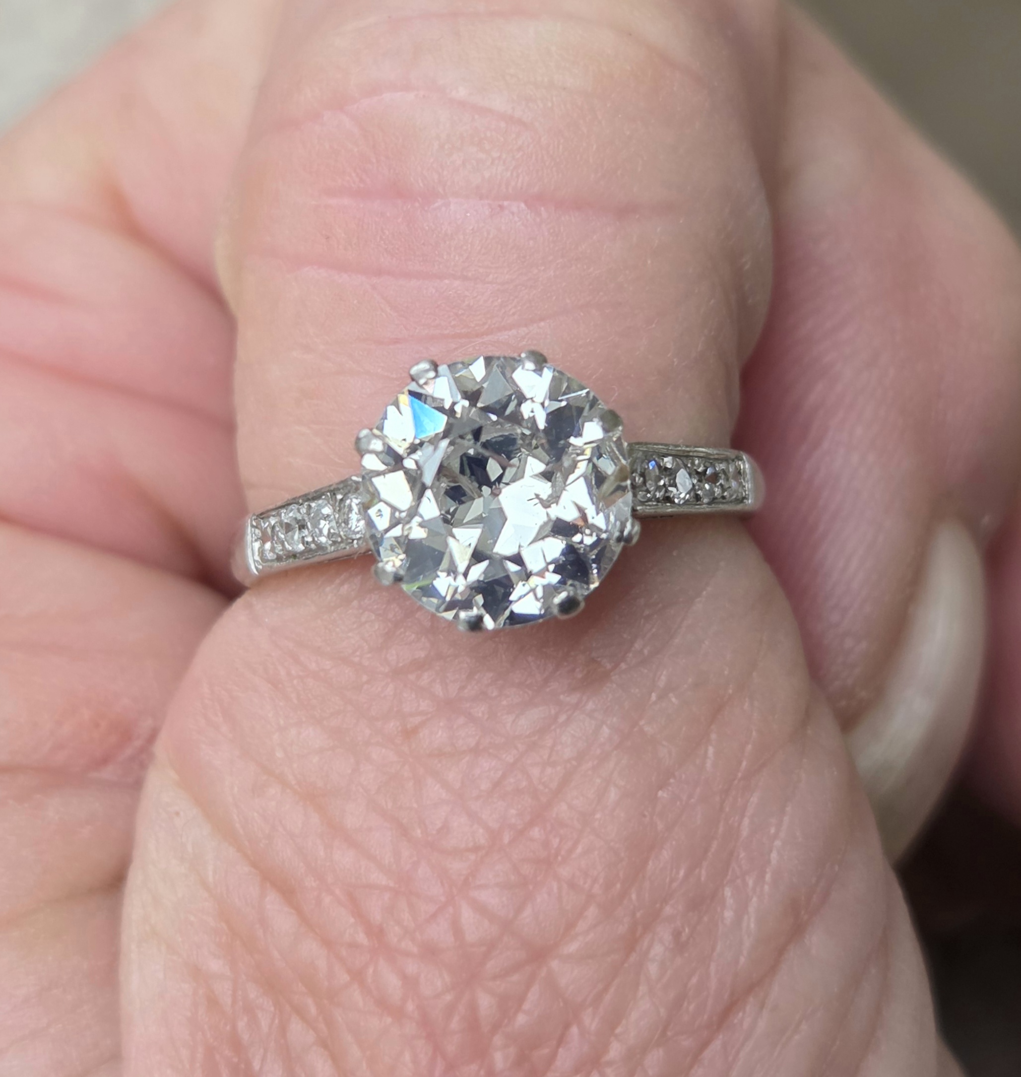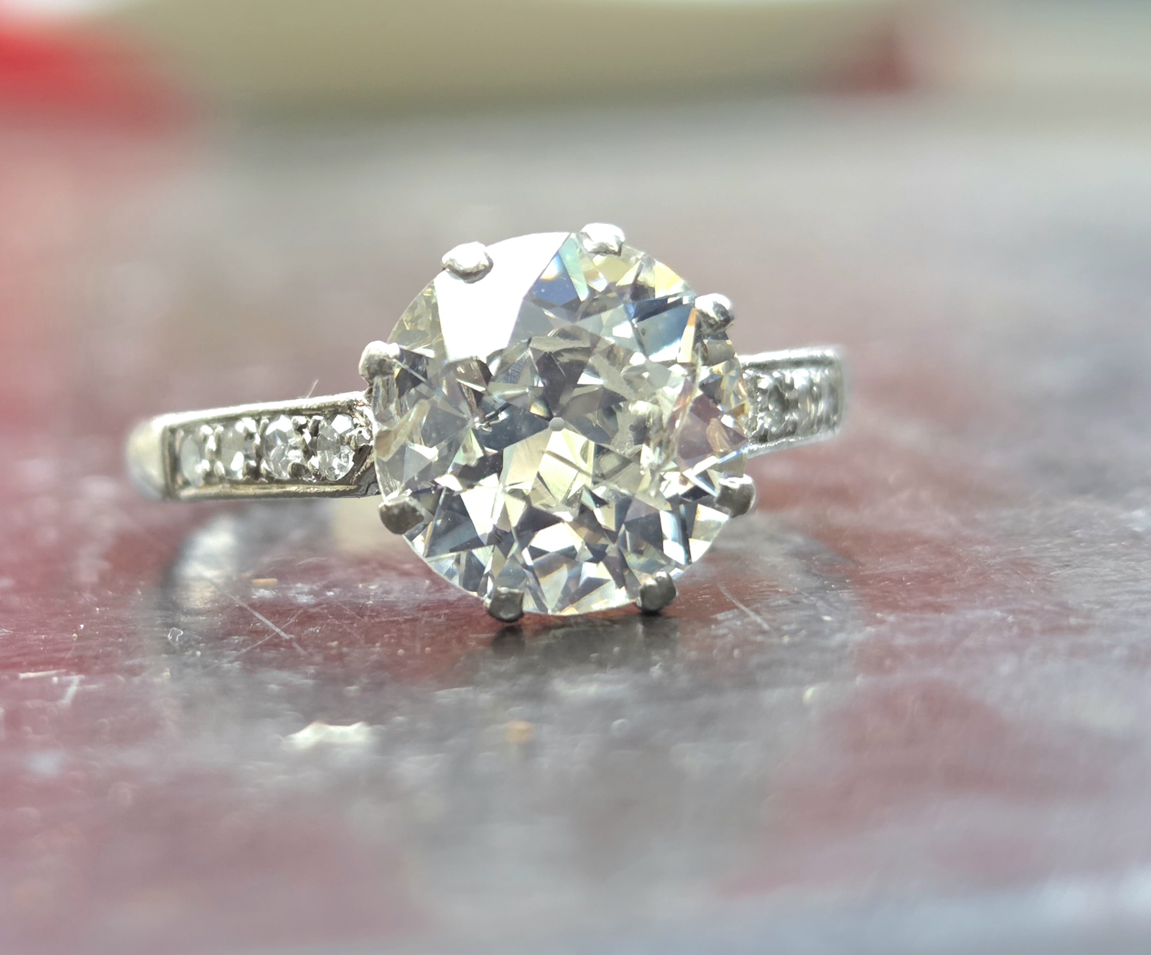 Measuring 8.7mm x 8.8mm she calculates to be 2.50ct plus diamond shoulder stones.
