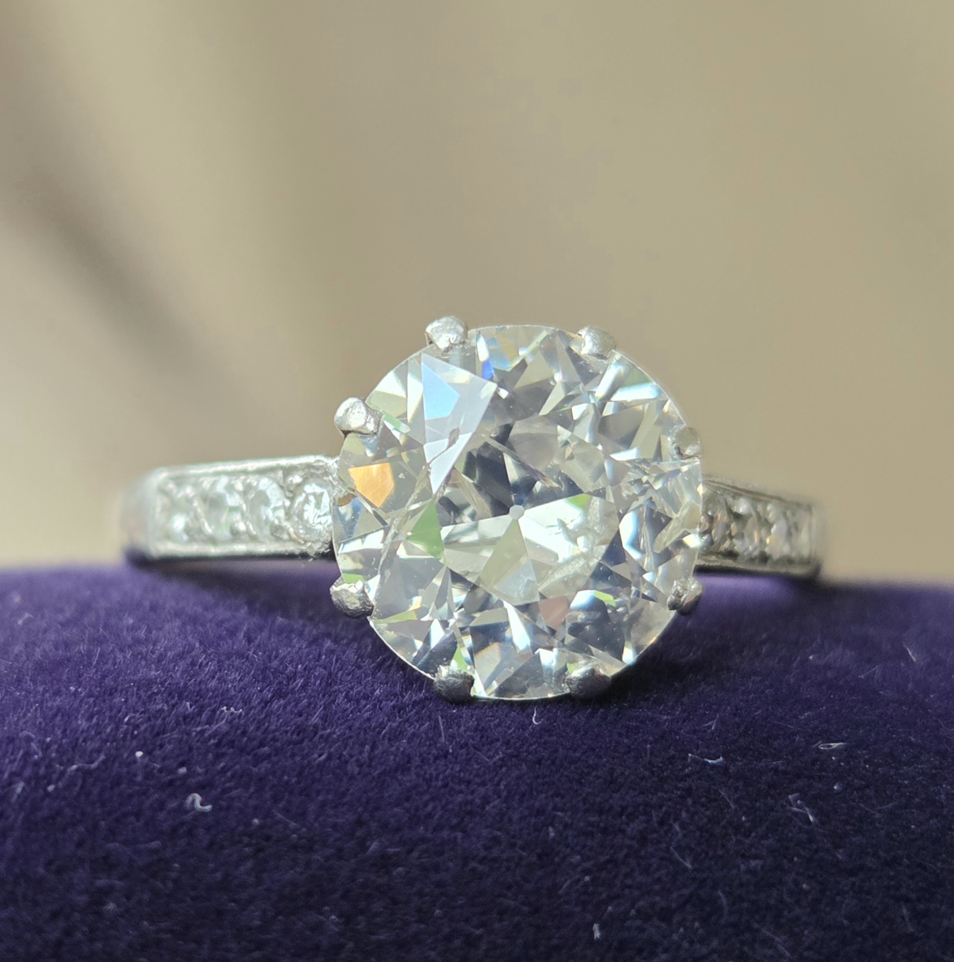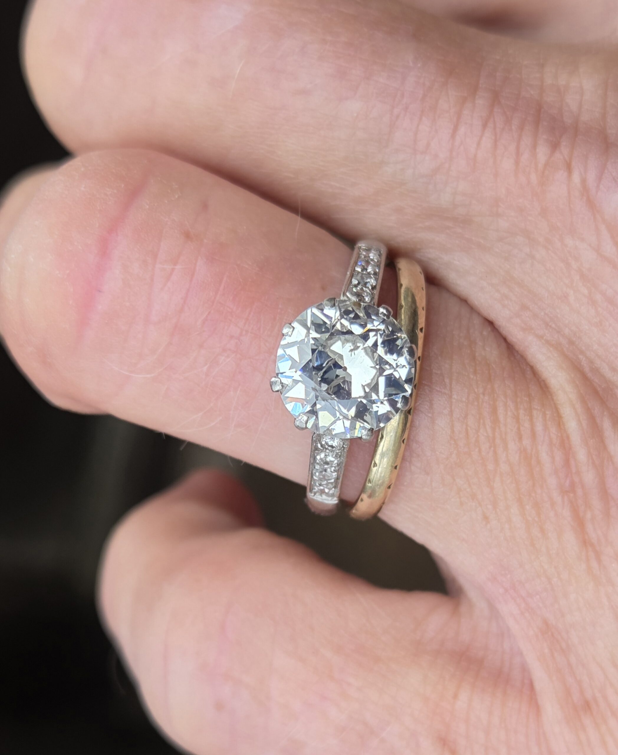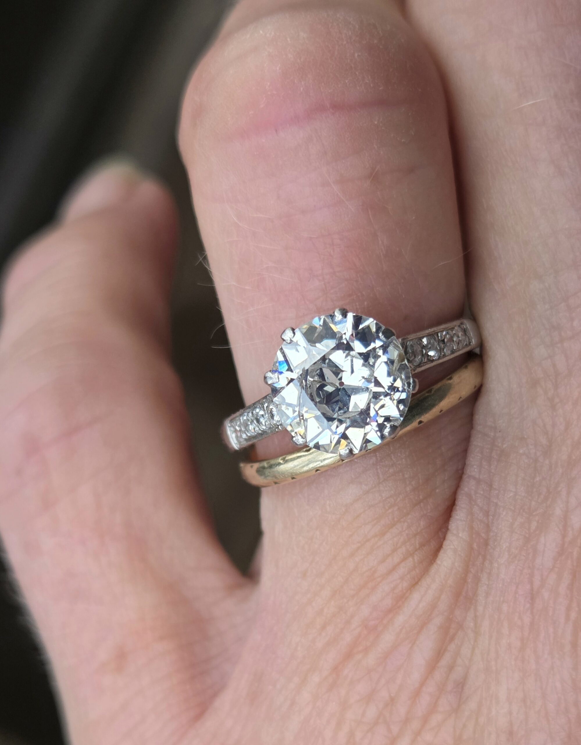 Measuring 8.7mm x 8.8mm she calculates to be 2.50ct plus diamond shoulder stones.