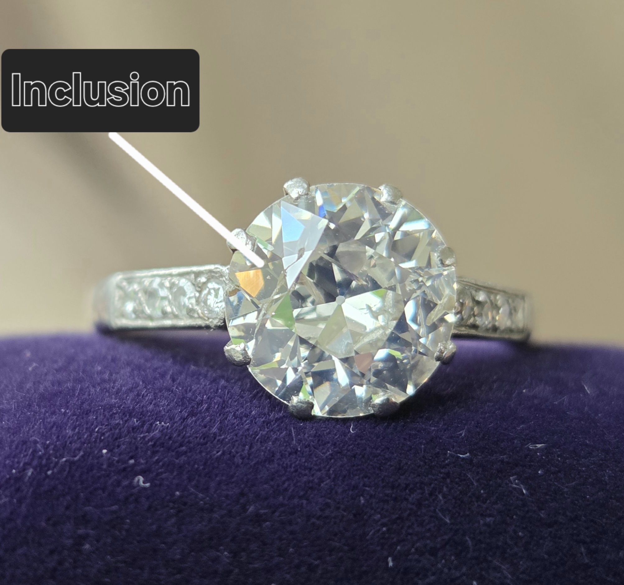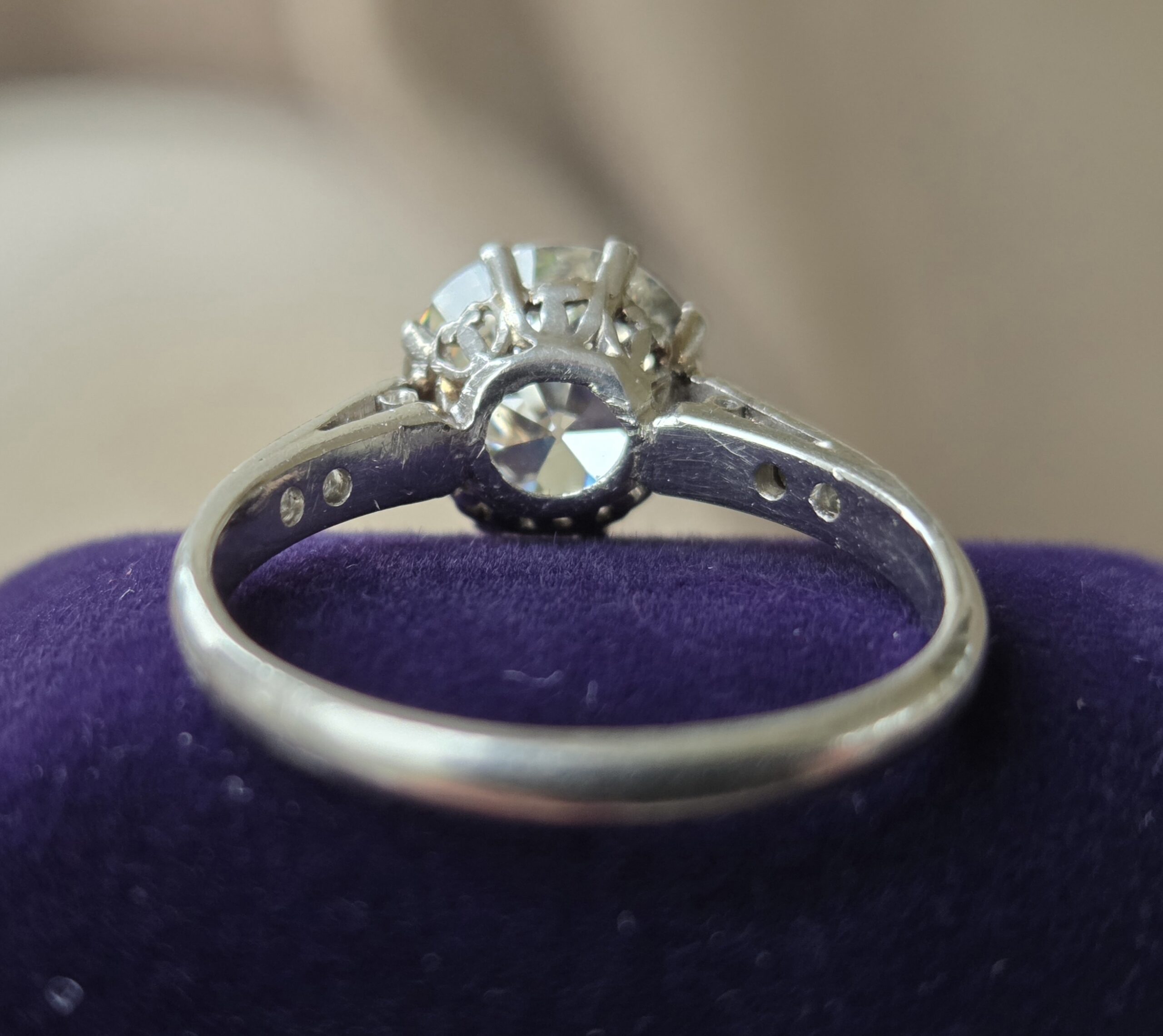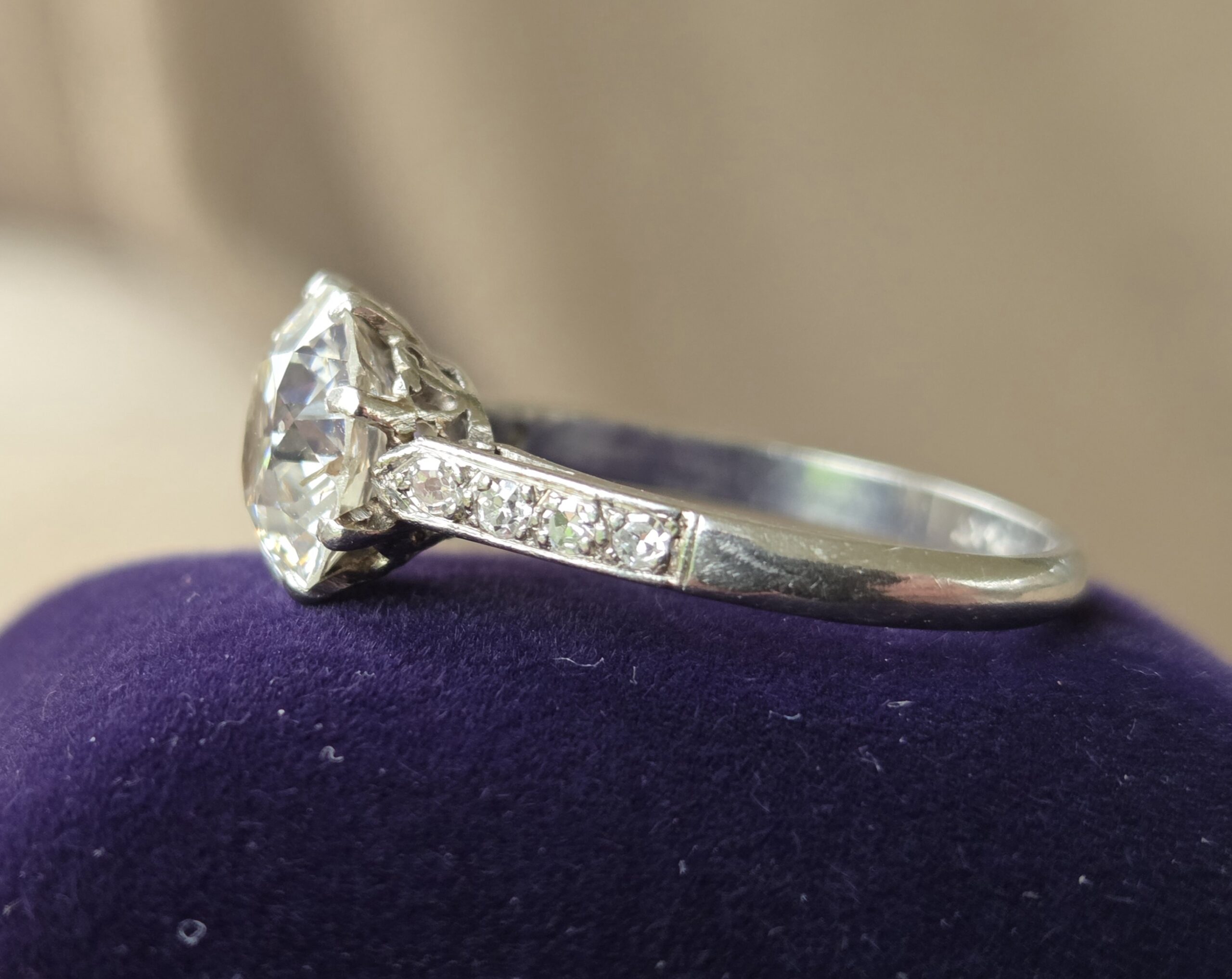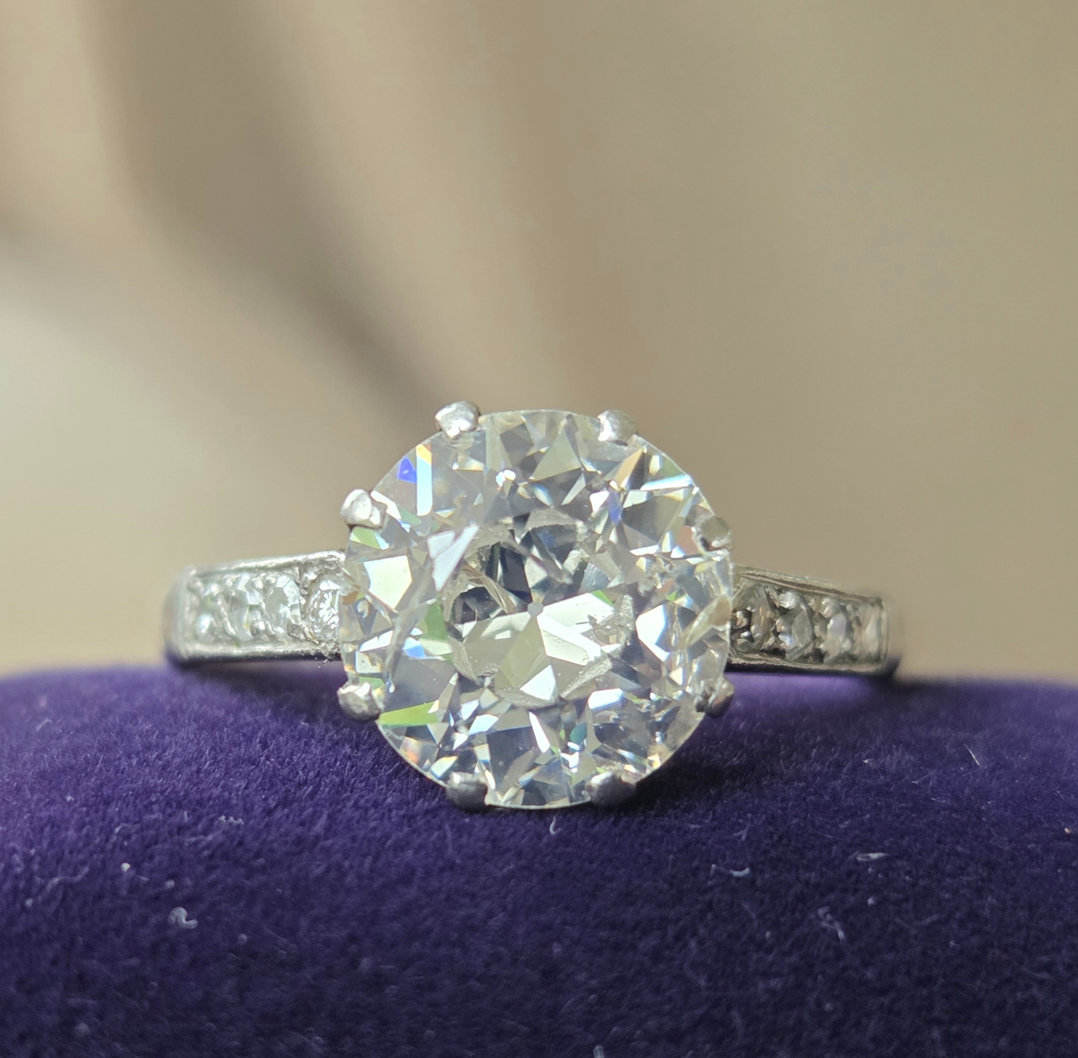 Measuring 8.7mm x 8.8mm she calculates to be 2.50ct plus diamond shoulder stones.