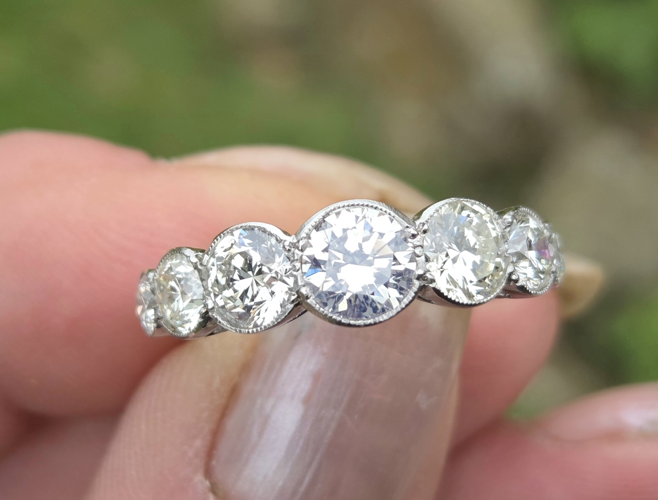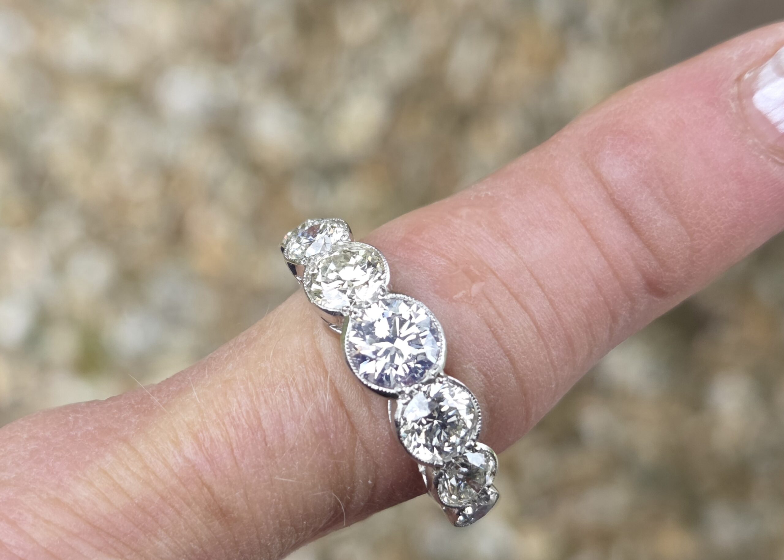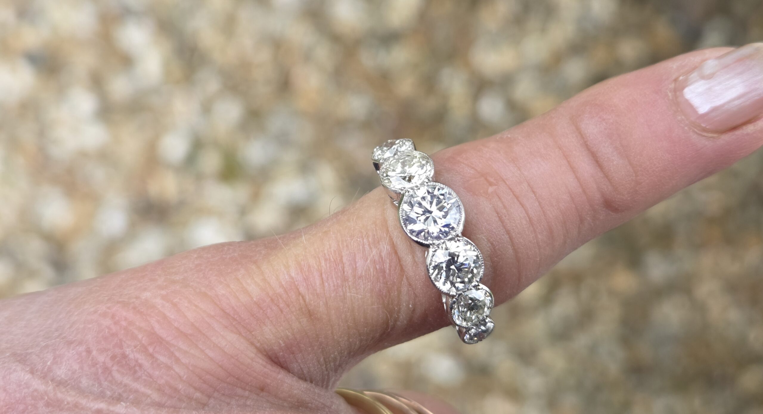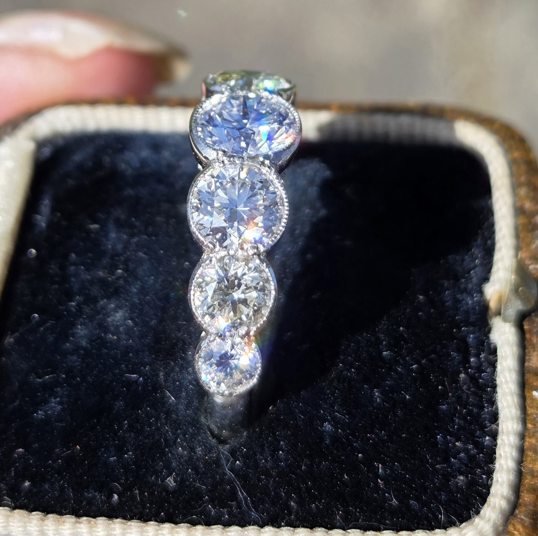 Here we have one! Platinum bezel set with super clean Transtional cut diamonds totalling over 3ct.