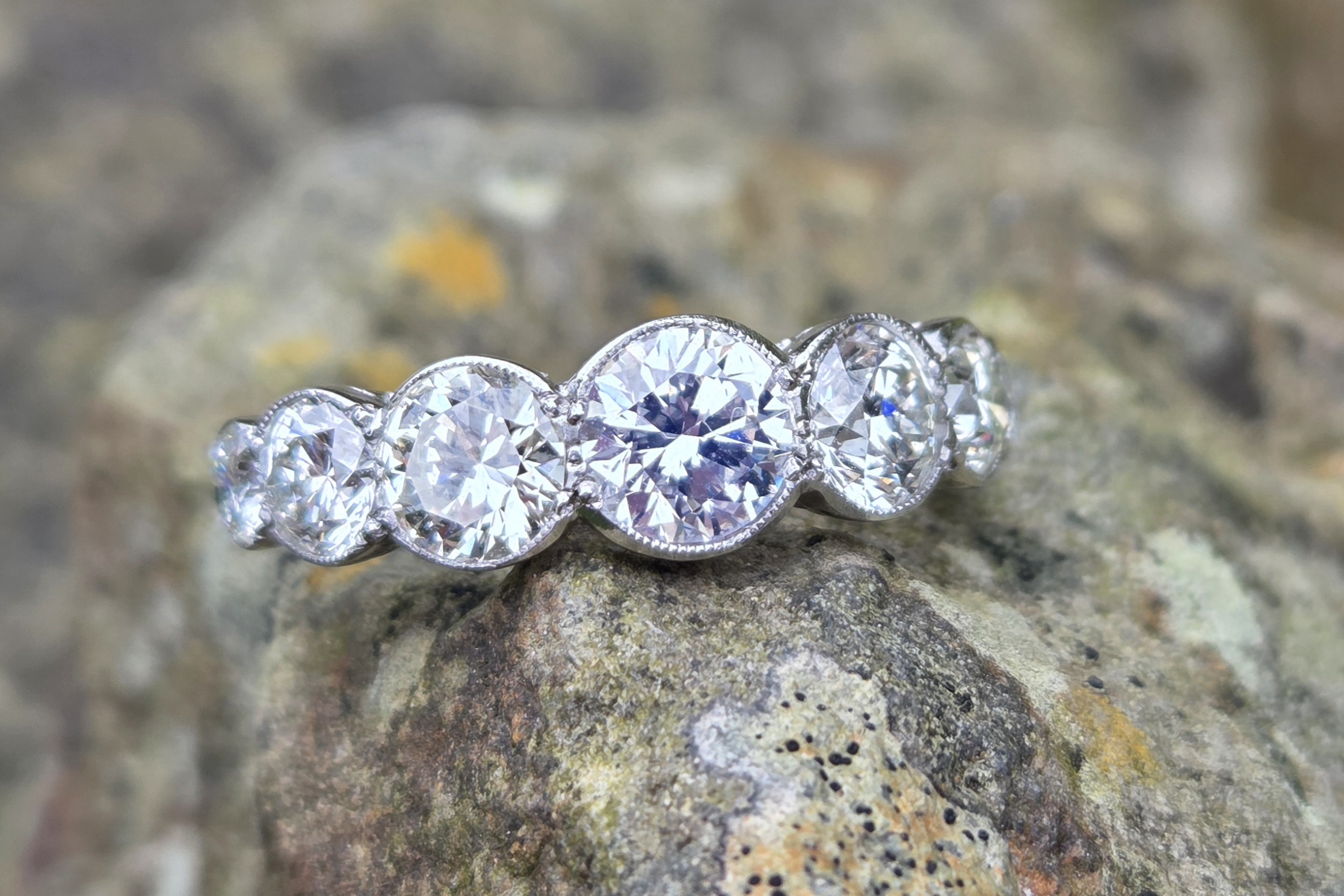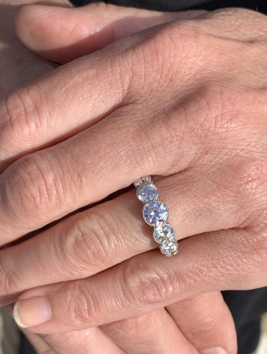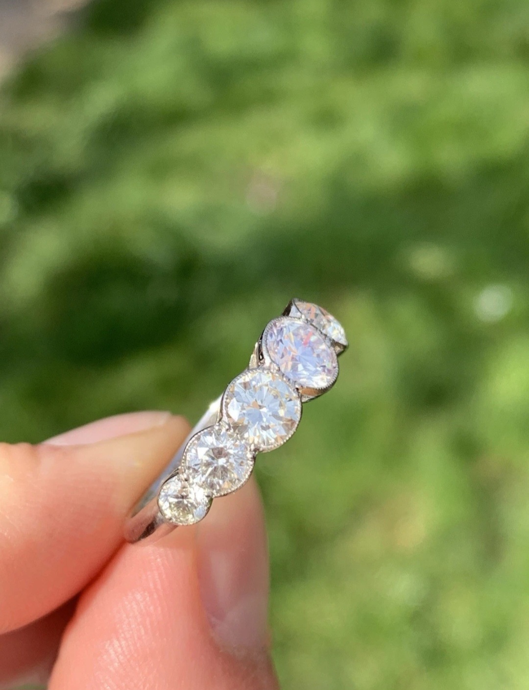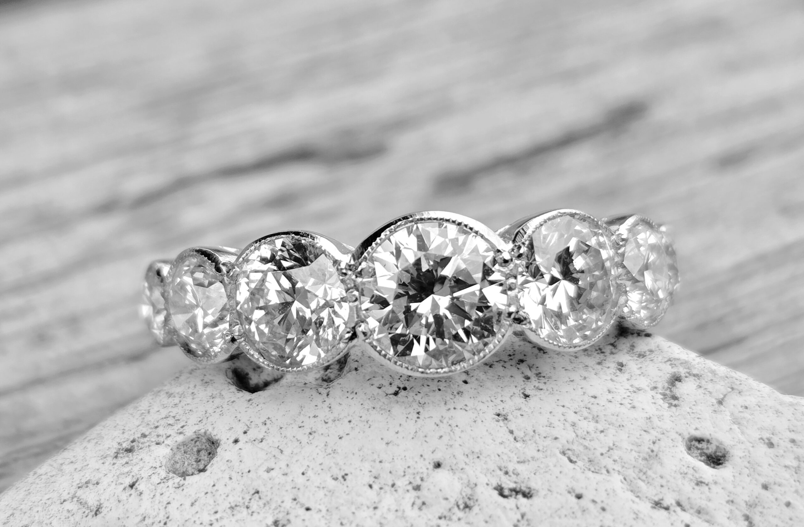 Here we have one! Platinum bezel set with super clean Transtional cut diamonds totalling over 3ct.