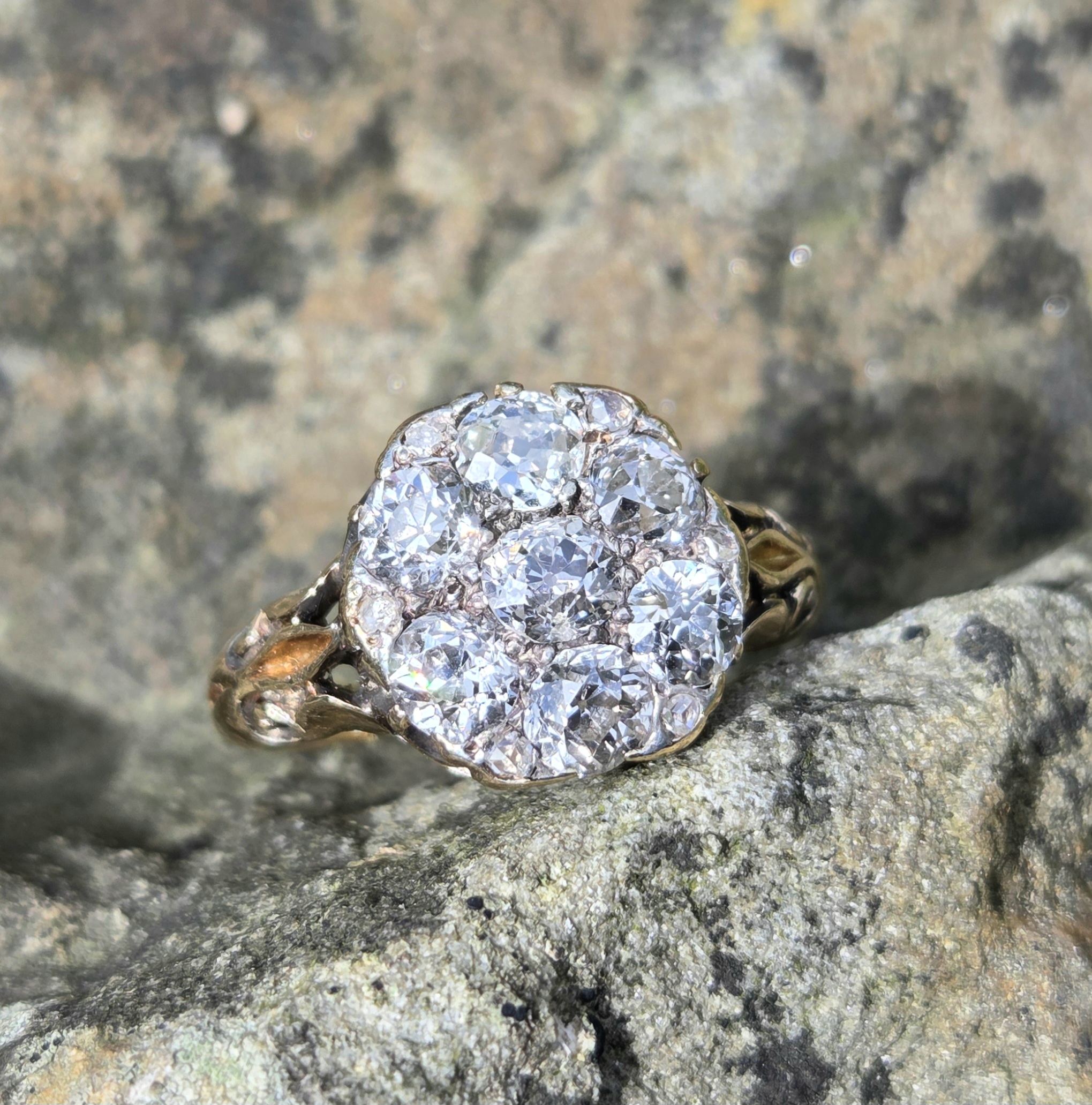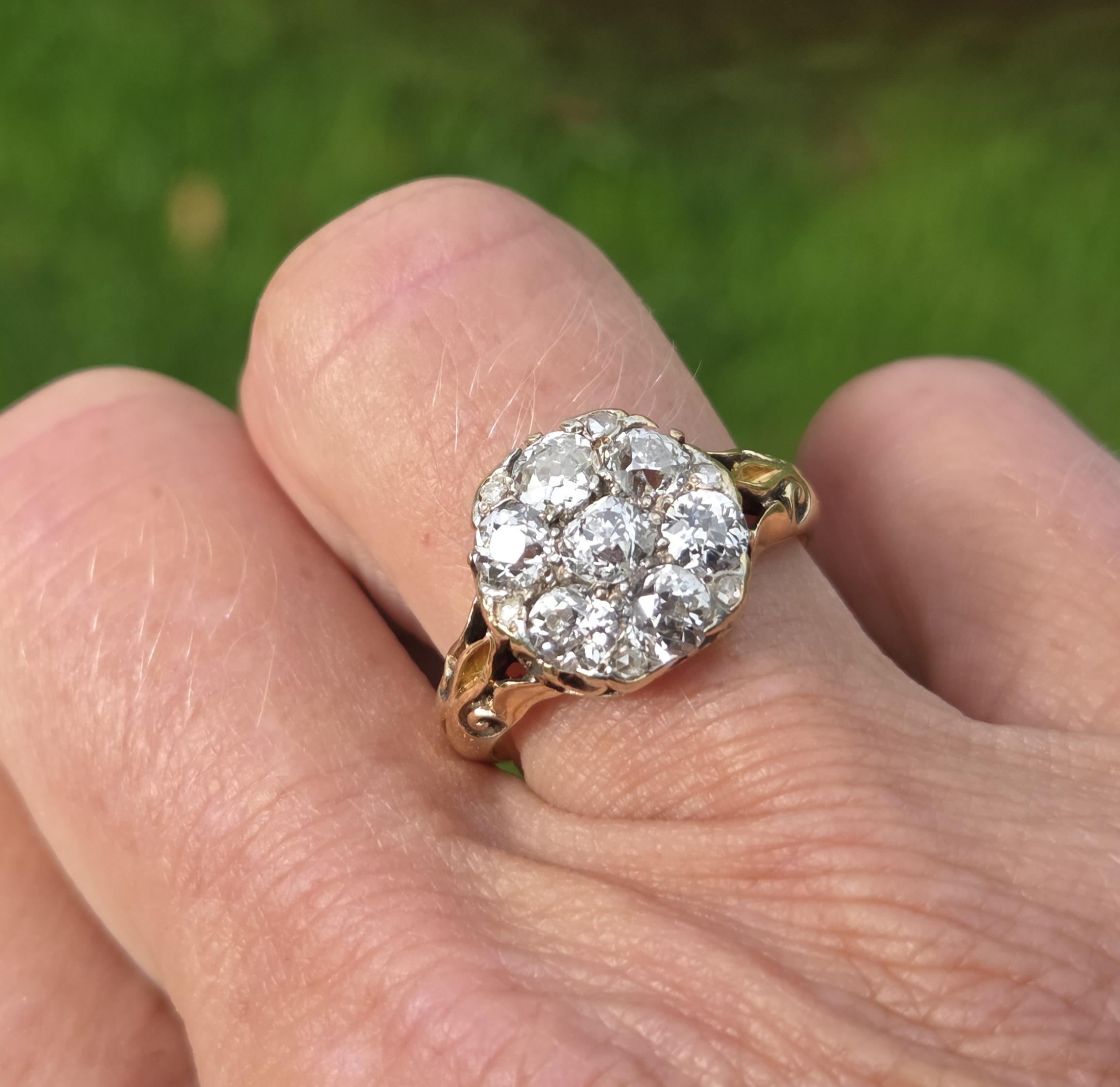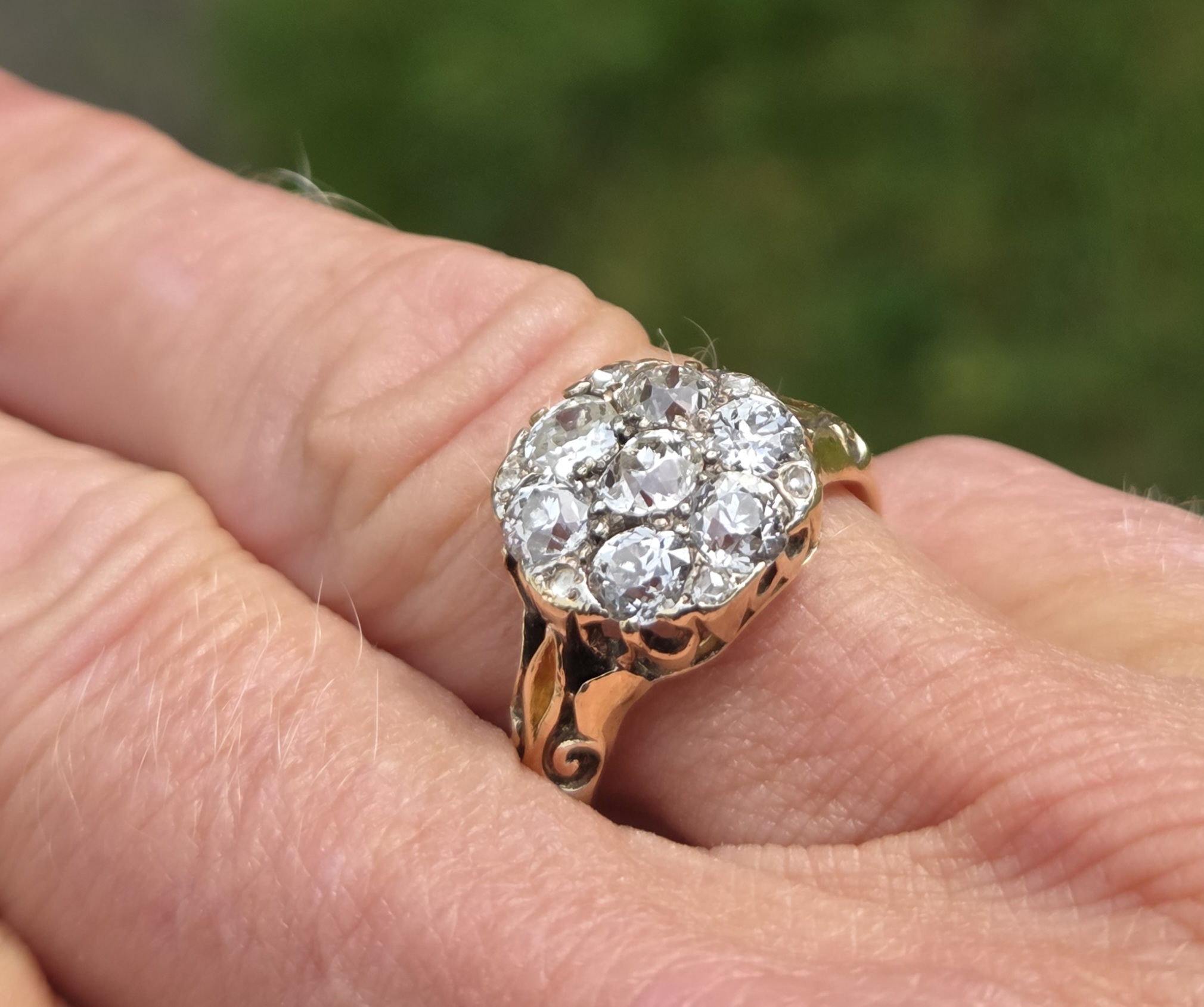 Victorian yellow gold ring with the most fantastic Old mine cuts with small diamond spacers too, all intact.